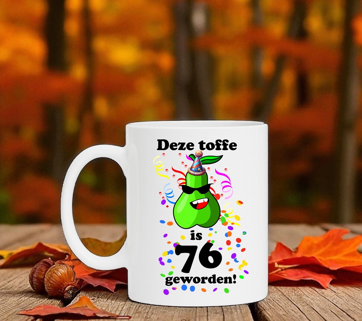 Deze verjaardag mok is een leuk en grappig wanneer iemand zijn 76e verjaardag viert. Zo kan iedereen zien aan deze mok dat deze toffe peer 76 is geworden.