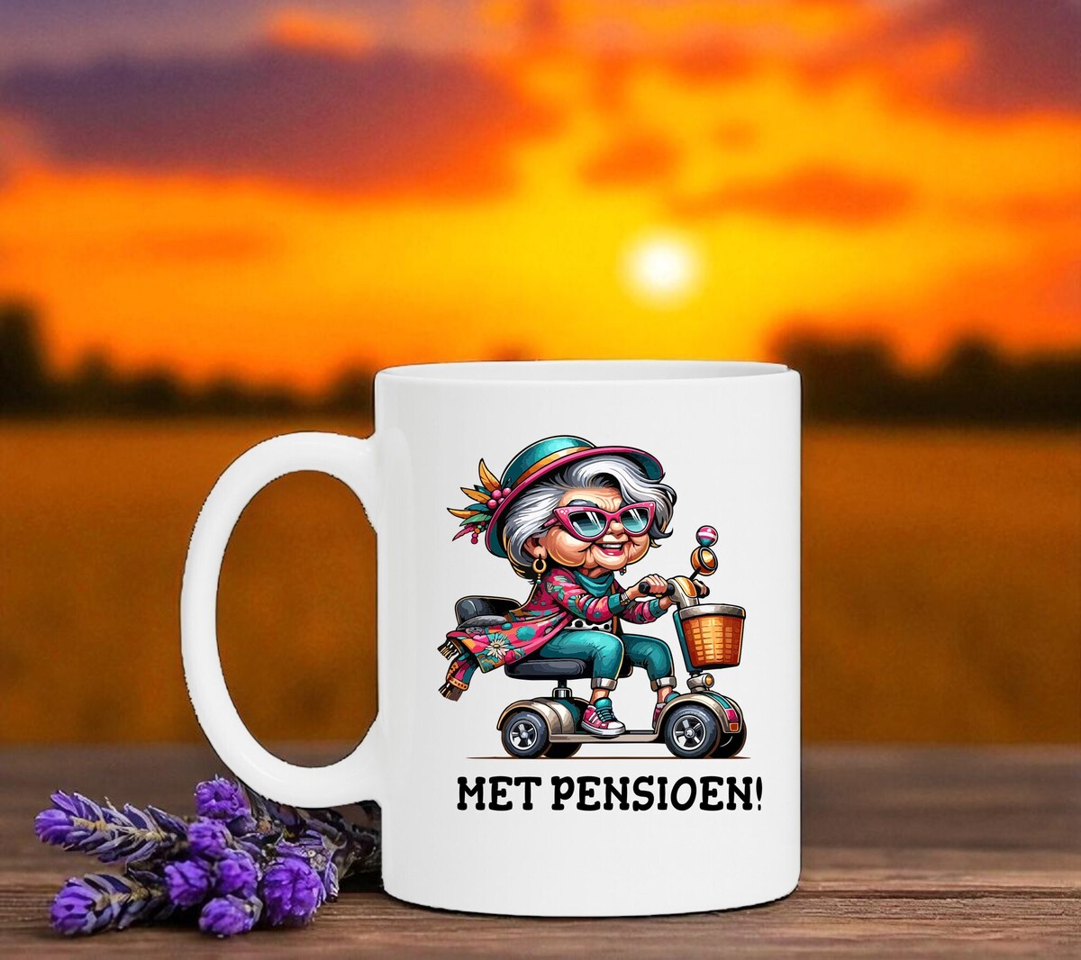 Ben je op zoek naar een origineel en persoonlijk cadeau voor een collega, vriendin, of familielid die met pensioen gaat? Zoek niet verder! Deze speciale koffiemok met een vrolijke cartoon van een dame op leeftijd in een scootmobiel en de opdruk "Met Pensioen" is het perfecte cadeau. Elke keer dat ze van haar koffie of thee geniet, zal ze terugdenken aan deze bijzondere mijlpaal en aan de lieve collega's en familieleden die haar hebben verrast. De mok is gemaakt van stevig keramiek en is zowel vaatwasmachine- als magnetronbestendig, waardoor hij lang meegaat. Het unieke ontwerp tovert gegarandeerd een glimlach op haar gezicht en is geschikt voor elke gelegenheid, zoals afscheid van collega's, pensioenfeestjes, of als persoonlijk cadeau van vrienden en familie.