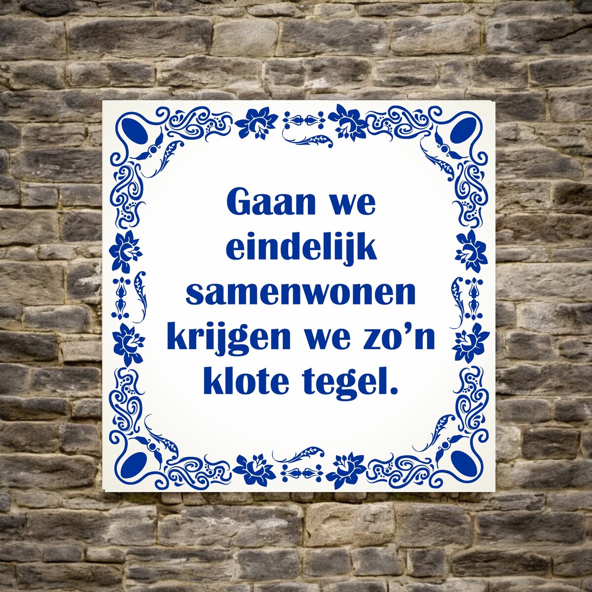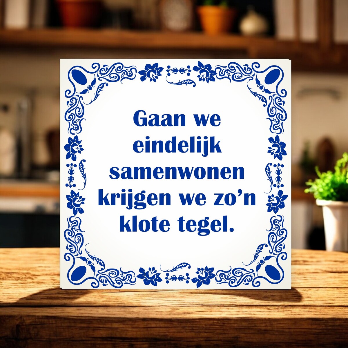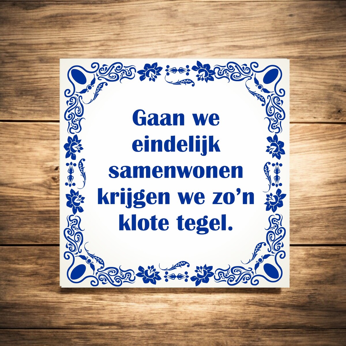 Gaan we eindelijk samenwonen krijgen we zo'n klote tegel. Een grappige spreukentegel voor een stel met humor als cadeau wanneer de 2 gaan samen wonen.