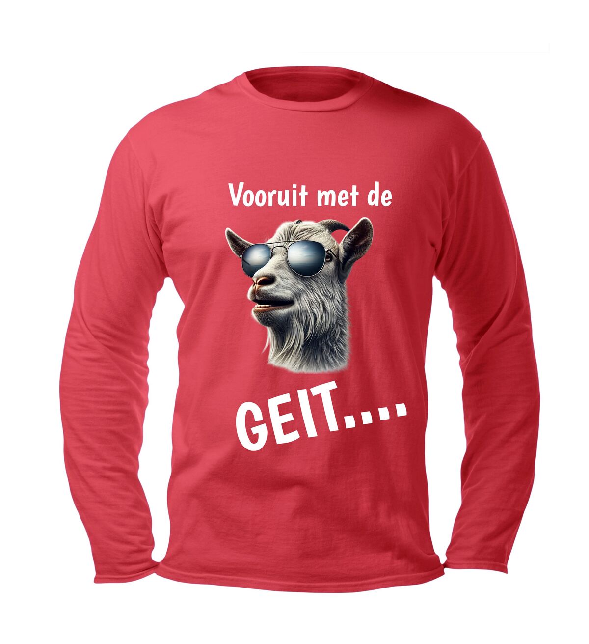 Unisex longsleeve shirt met de hilarische tekst Vooruit met de geit en een vrolijke afbeelding van een geit – perfect cadeau voor mannen en vrouwen die van humor houden, ideaal om te dragen tijdens feestjes, borrels, festivals of gewoon lekker thuis, zodat iedereen meteen weet dat jij vol goede moed en met een flinke dosis zelfspot vooruit gaat met de geit, of dat nu richting de bank, de dansvloer of de barbecue is – comfortabel, grappig en een absolute blikvanger voor iedere geitenliefhebber en levensgenieter.