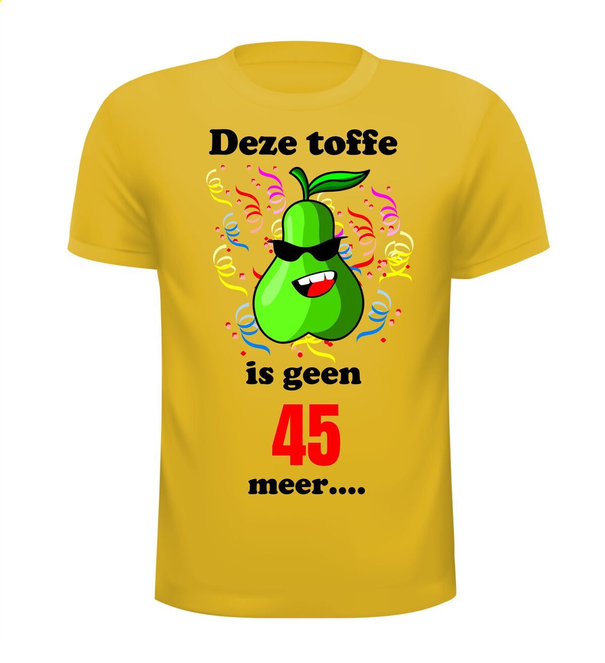 Ben je op zoek naar een orgineel en full colour t-shirt voor een 46e verjaardag? Met dit kleurrijke shirt kun je voor de dag komen als cadeau wanneer iemand 46 jaar wordt. Op dit fun shirt staat de leuke tekst: Deze toffe peer is geen 45 jaar meer.