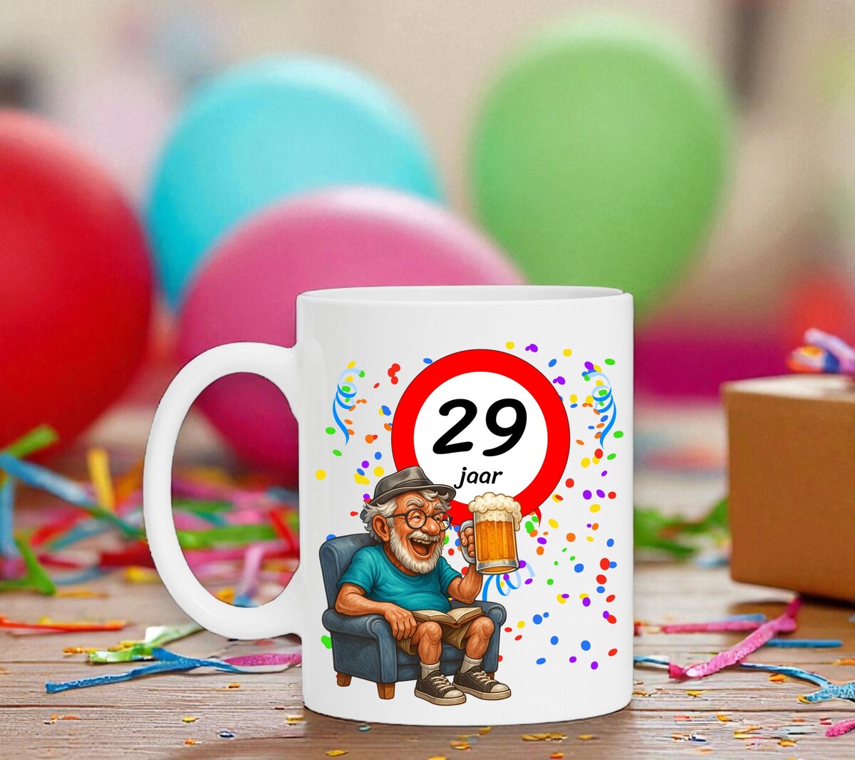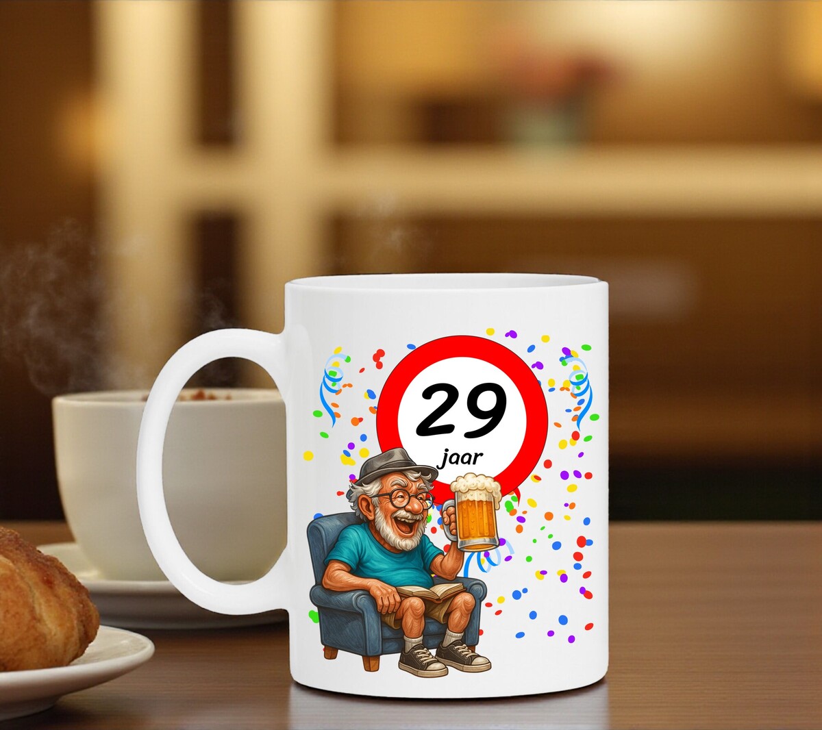 Verras de jarige met deze humoristische koffiemok met een prachtig ontwerp waarop een man heerlijk onderuitgezakt op de bank zit met een biertje in zijn hand, terwijl het bord met 29 zijn nieuwe leeftijd trots laat zien. Een luchtig en vrolijk cadeau dat perfect is voor iedere verjaardag. De mok is vaatwasserbestendig en magnetronbestendig en heeft een hoogte van 96 mm en een diameter van 80 mm.