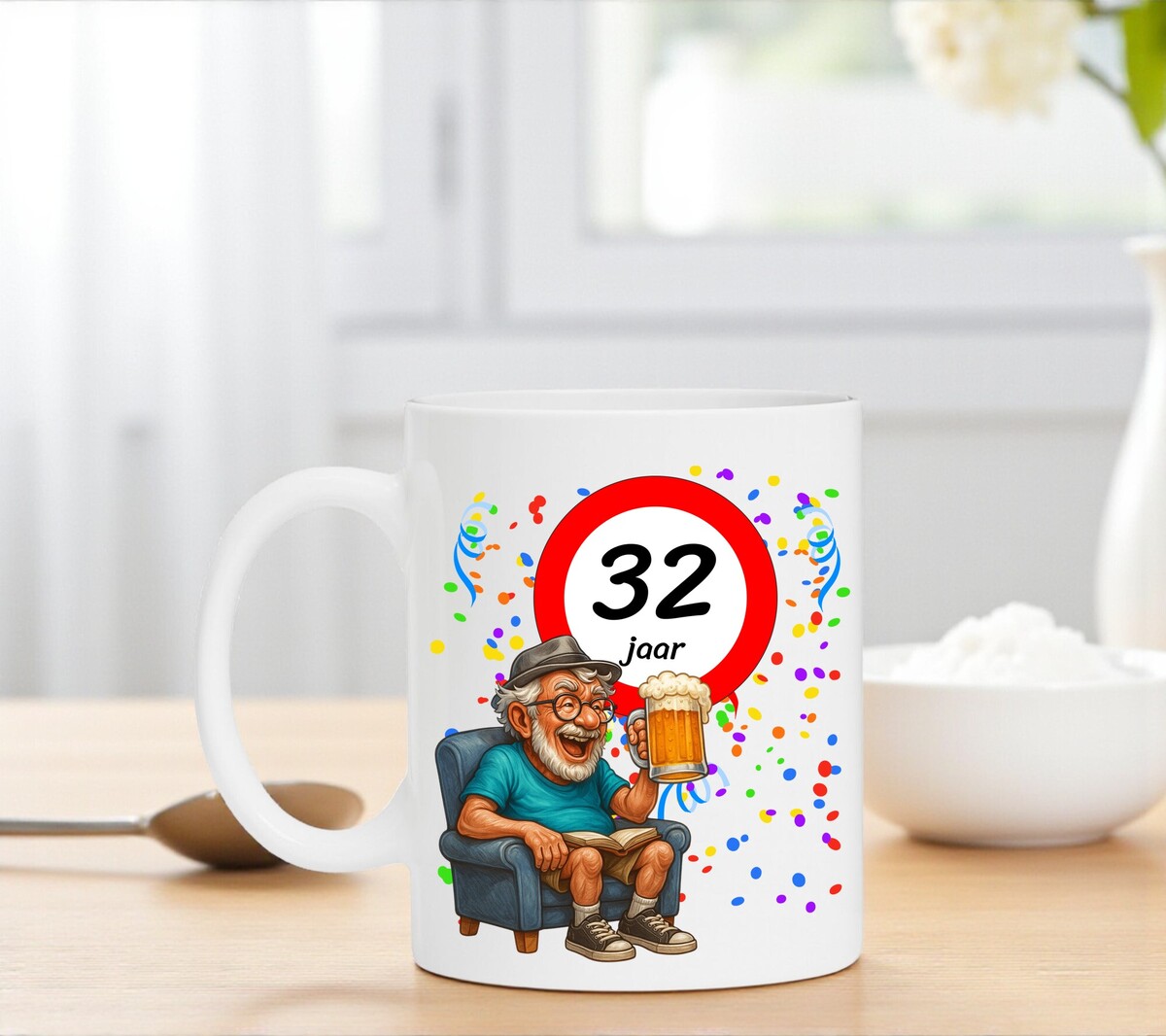 Verras de jarige met deze humoristische koffiemok met een prachtig ontwerp waarop een man heerlijk onderuitgezakt op de bank zit met een biertje in zijn hand, terwijl het bord met 32 zijn nieuwe leeftijd trots laat zien. Een luchtig en vrolijk cadeau dat perfect is voor iedere verjaardag. .