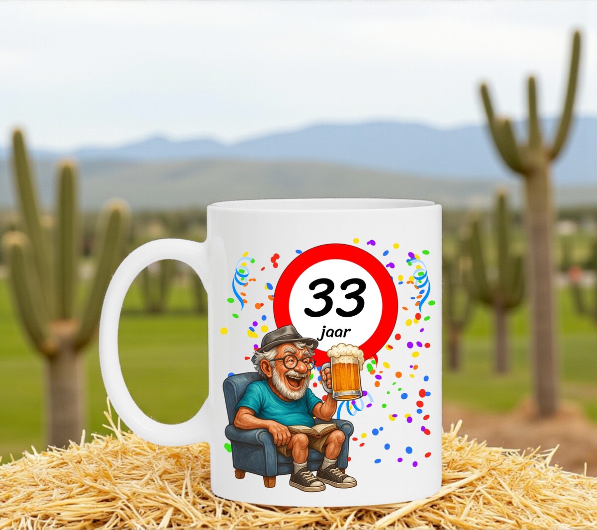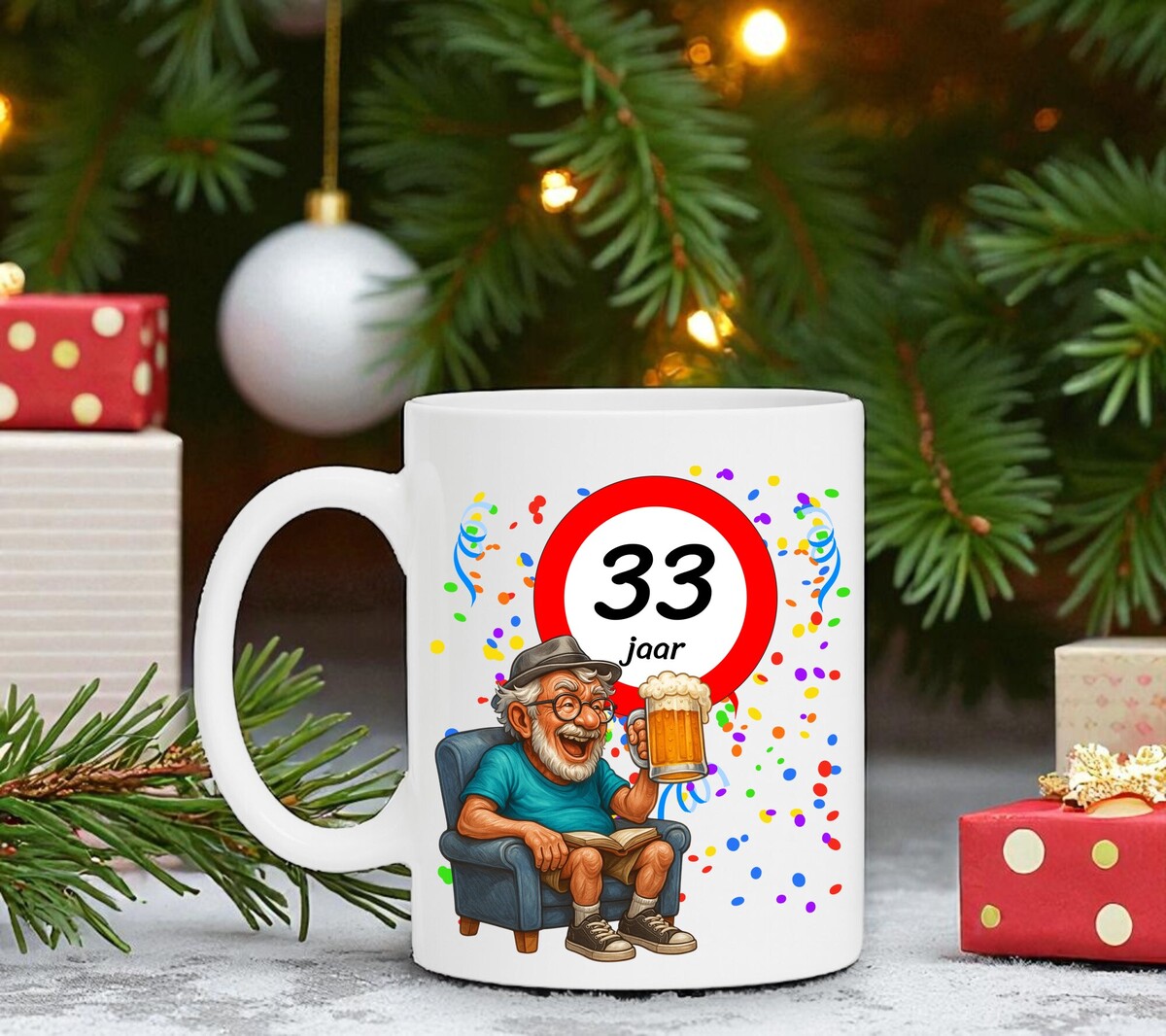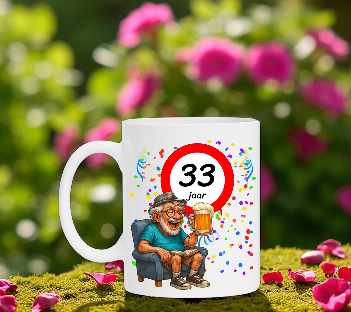 Verras de jarige met deze humoristische koffiemok met een prachtig ontwerp waarop een man heerlijk onderuitgezakt op de bank zit met een biertje in zijn hand, terwijl het bord met 33 zijn nieuwe leeftijd trots laat zien. Een luchtig en vrolijk cadeau dat perfect is voor iedere verjaardag. De mok is vaatwasserbestendig en magnetronbestendig en heeft een hoogte van 96 mm en een diameter van 80 mm.