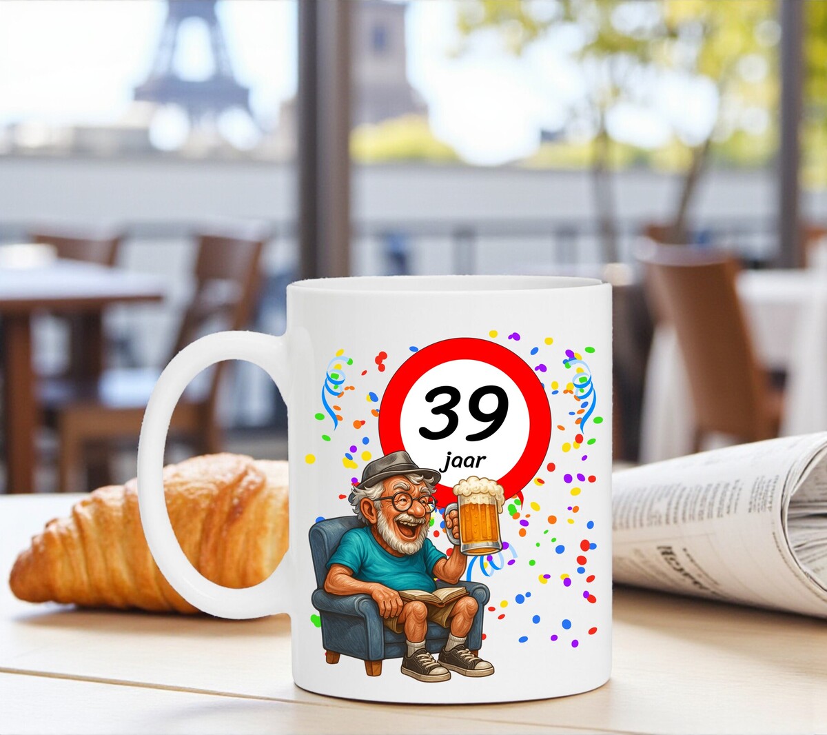 Verras de jarige met deze humoristische koffiemok met een prachtig ontwerp waarop een man heerlijk onderuitgezakt op de bank zit met een biertje in zijn hand, terwijl het bord met 39 zijn nieuwe leeftijd trots laat zien. Een luchtig en vrolijk cadeau dat perfect is voor iedere verjaardag. De mok is vaatwasserbestendig en magnetronbestendig en heeft een hoogte van 96 mm en een diameter van 80 mm.