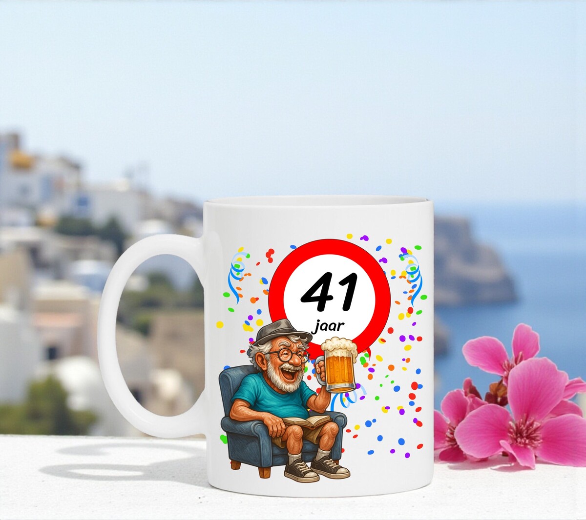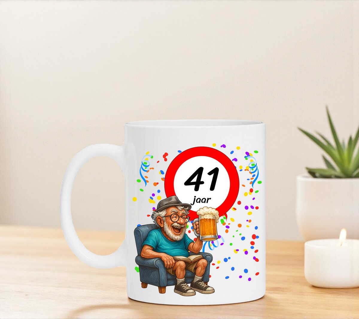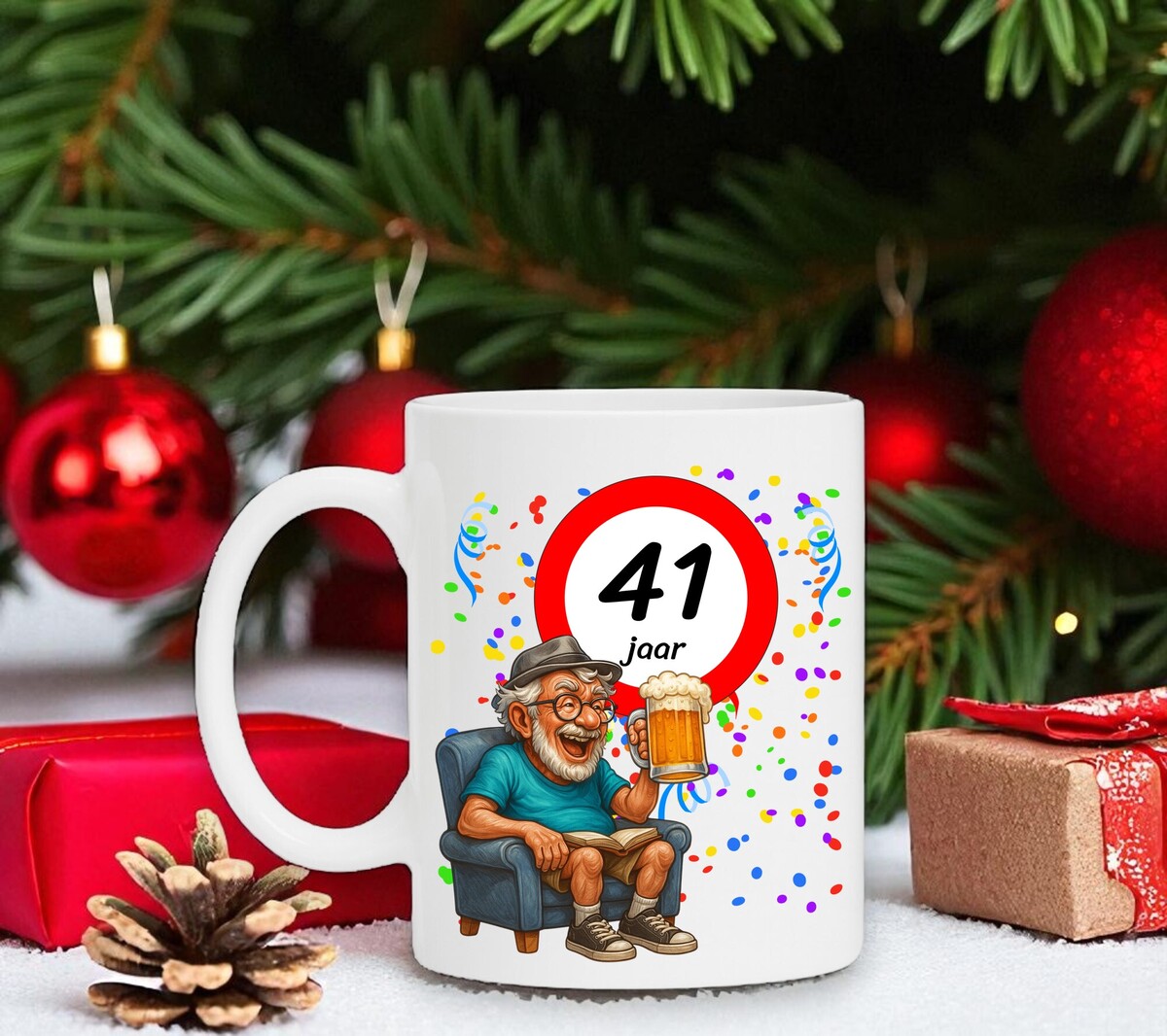 Verras de jarige met deze humoristische koffiemok met een prachtig ontwerp waarop een man heerlijk onderuitgezakt op de bank zit met een biertje in zijn hand, terwijl het bord met 41 zijn nieuwe leeftijd trots laat zien. Een luchtig en vrolijk cadeau dat perfect is voor iedere verjaardag. De mok is vaatwasserbestendig en magnetronbestendig en heeft een hoogte van 96 mm en een diameter van 80 mm.