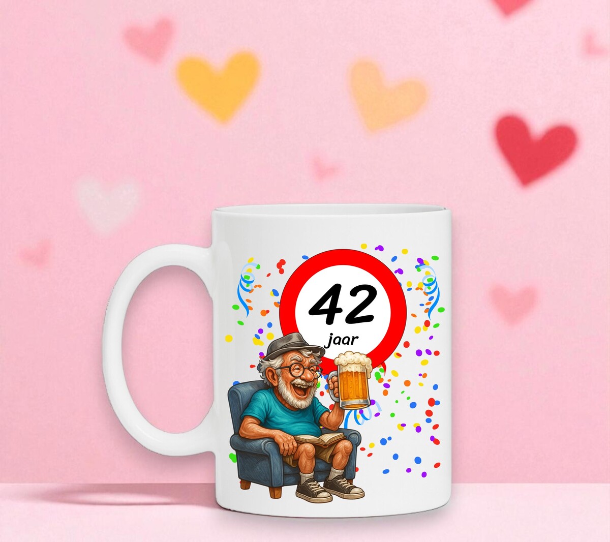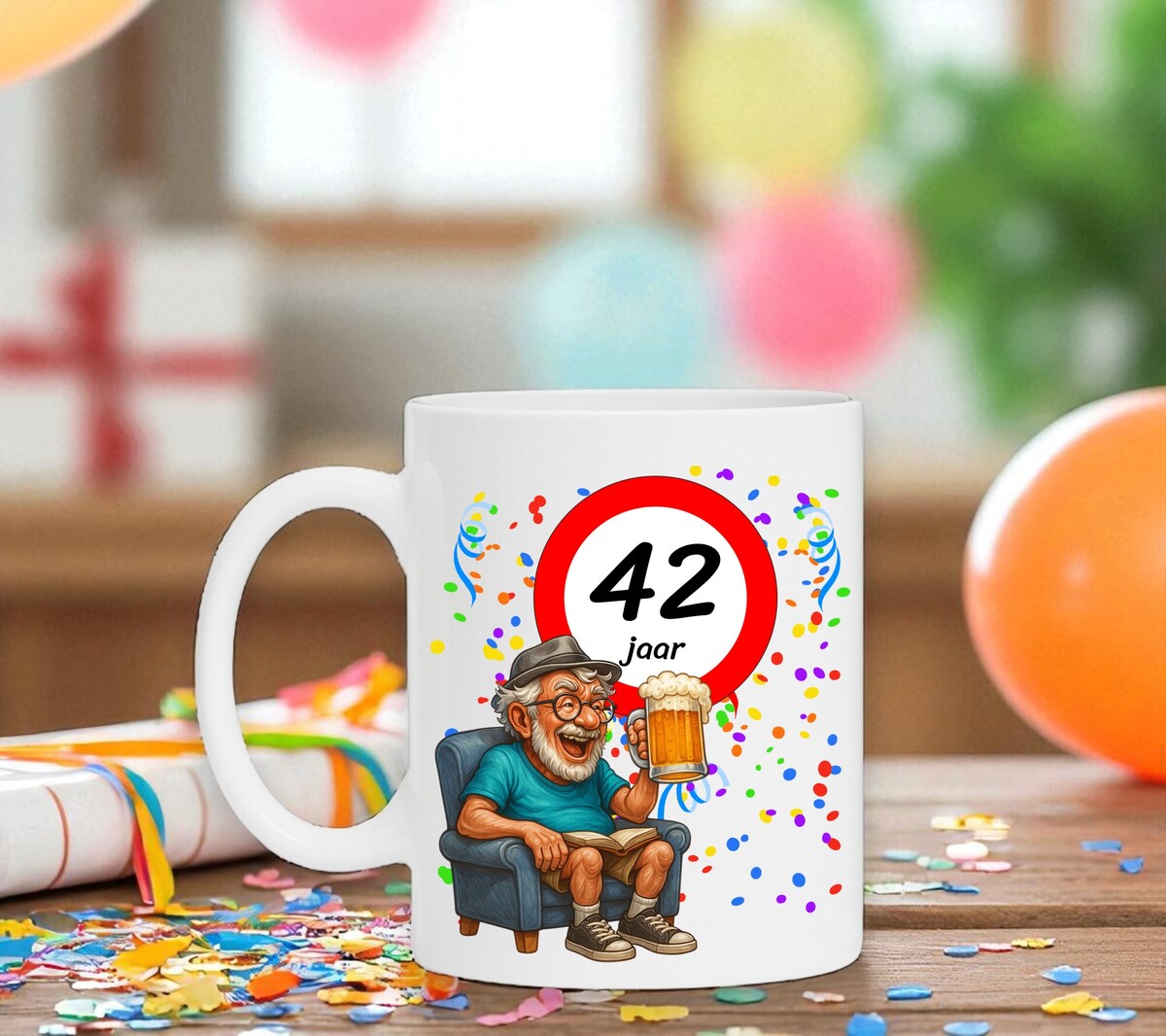 Verras de jarige met deze humoristische koffiemok met een prachtig ontwerp waarop een man heerlijk onderuitgezakt op de bank zit met een biertje in zijn hand, terwijl het bord met 42 zijn nieuwe leeftijd trots laat zien. Een luchtig en vrolijk cadeau dat perfect is voor iedere verjaardag. De mok is vaatwasserbestendig en magnetronbestendig en heeft een hoogte van 96 mm en een diameter van 80 mm.