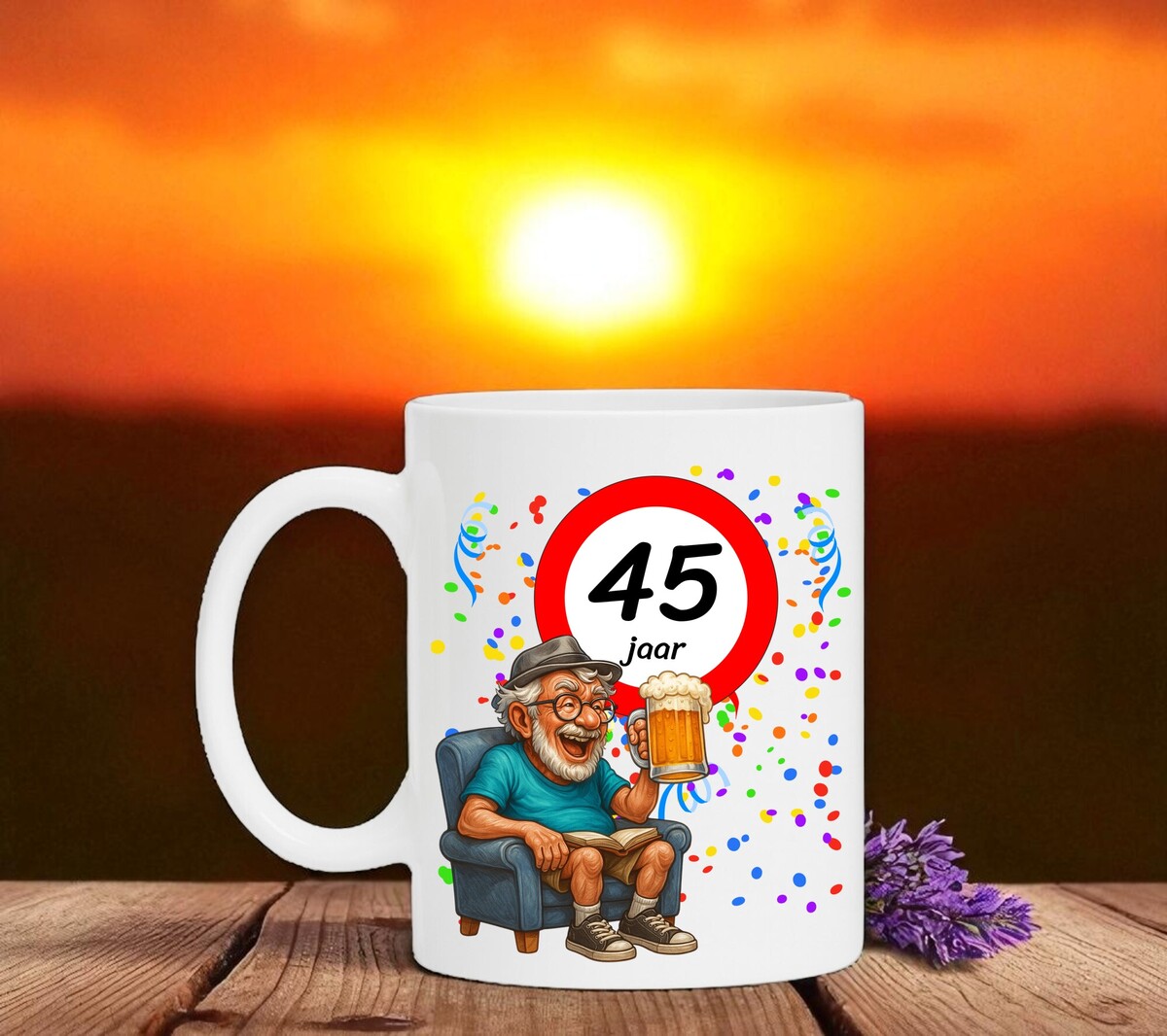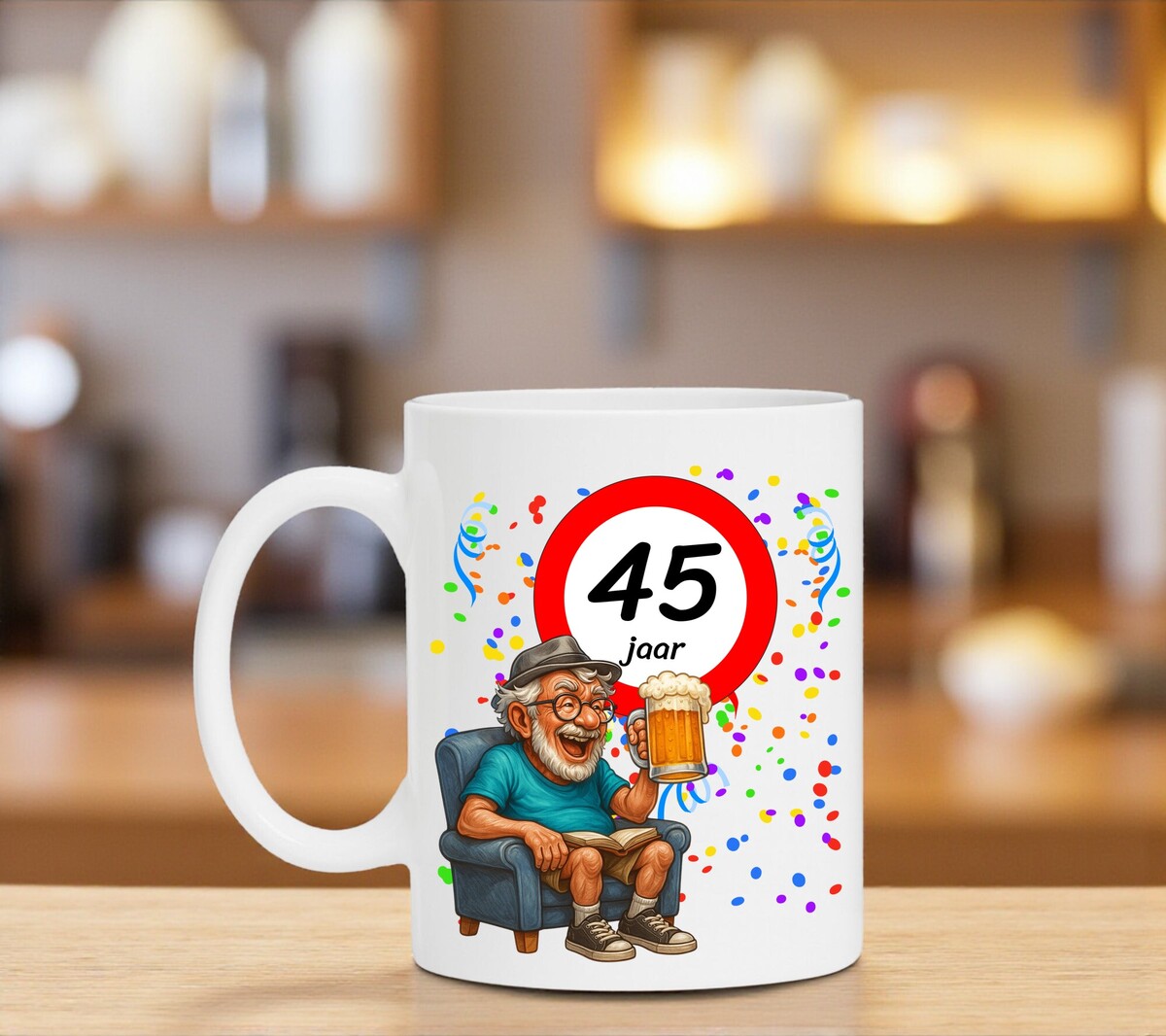 Verras de jarige met deze humoristische koffiemok met een prachtig ontwerp waarop een man heerlijk onderuitgezakt op de bank zit met een biertje in zijn hand, terwijl het bord met 45 zijn nieuwe leeftijd trots laat zien. Een luchtig en vrolijk cadeau dat perfect is voor iedere verjaardag. De mok is vaatwasserbestendig en magnetronbestendig en heeft een hoogte van 96 mm en een diameter van 80 mm.