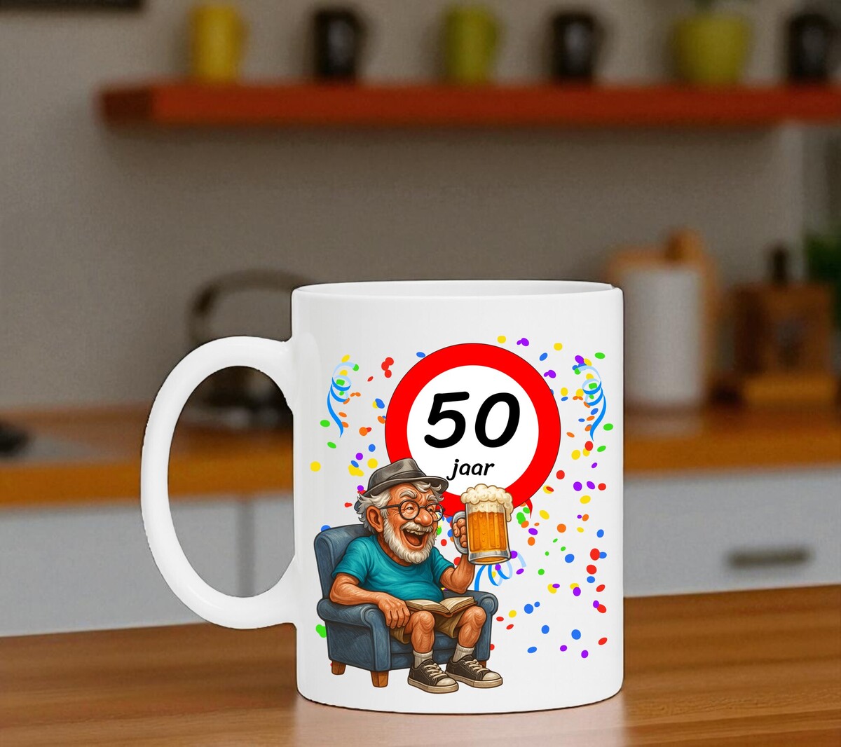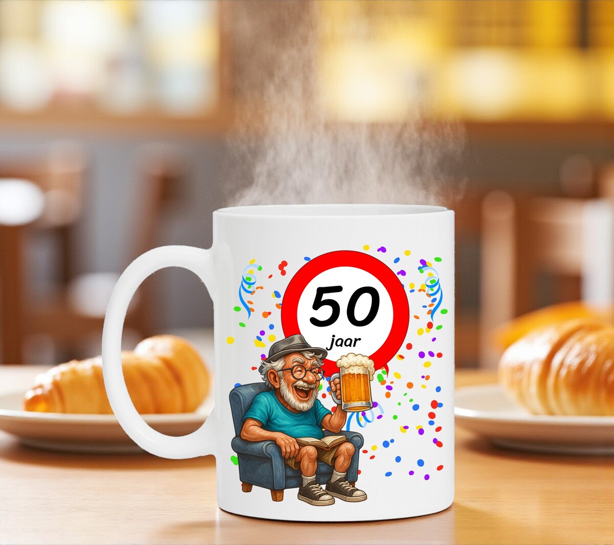 Verras de jarige met deze humoristische koffiemok met een prachtig ontwerp waarop een man heerlijk onderuitgezakt op de bank zit met een biertje in zijn hand, terwijl het bord met 50 zijn nieuwe leeftijd trots laat zien. Een luchtig en vrolijk cadeau dat perfect is voor iedere verjaardag. De mok is vaatwasserbestendig en magnetronbestendig en heeft een hoogte van 96 mm en een diameter van 80 mm.