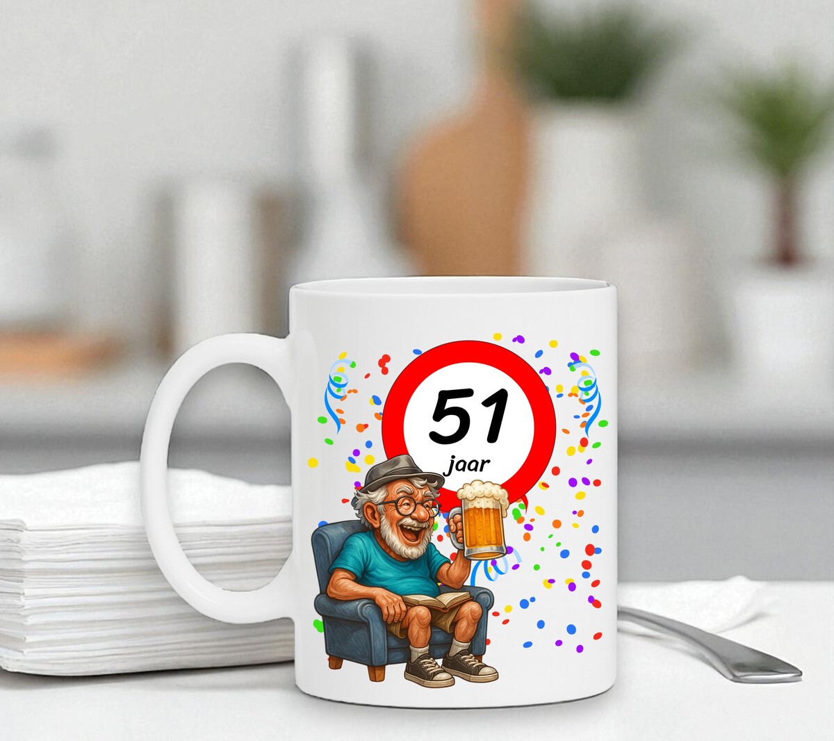 Verras de jarige met deze humoristische koffiemok met een prachtig ontwerp waarop een man heerlijk onderuitgezakt op de bank zit met een biertje in zijn hand, terwijl het bord met 51 zijn nieuwe leeftijd trots laat zien. Een luchtig en vrolijk cadeau dat perfect is voor iedere verjaardag. De mok is vaatwasserbestendig en magnetronbestendig en heeft een hoogte van 96 mm en een diameter van 80 mm.
