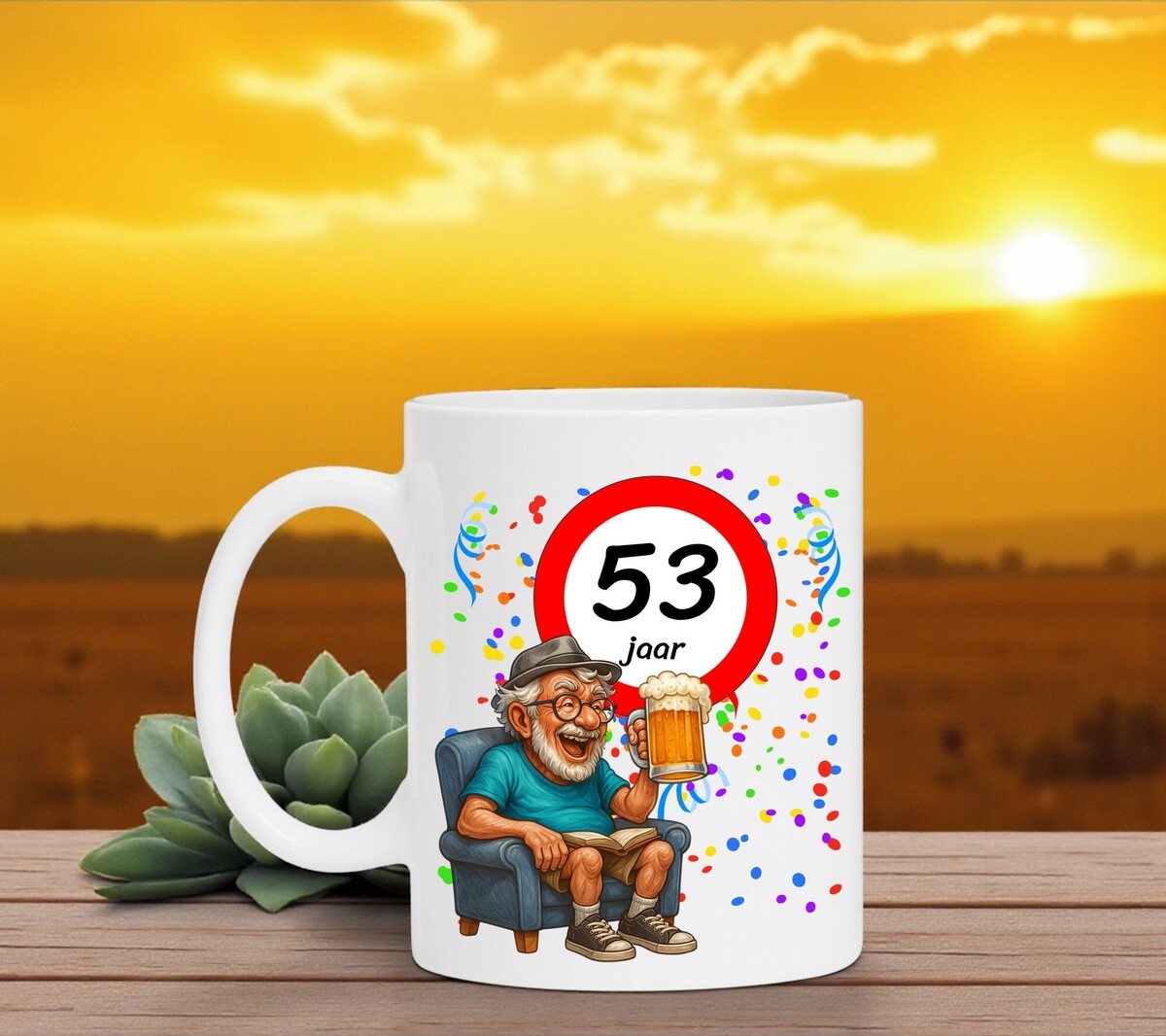 Verras de jarige met deze humoristische koffiemok met een prachtig ontwerp waarop een man heerlijk onderuitgezakt op de bank zit met een biertje in zijn hand, terwijl het bord met 53 zijn nieuwe leeftijd trots laat zien. Een luchtig en vrolijk cadeau dat perfect is voor iedere verjaardag. De mok is vaatwasserbestendig en magnetronbestendig en heeft een hoogte van 96 mm en een diameter van 80 mm.
