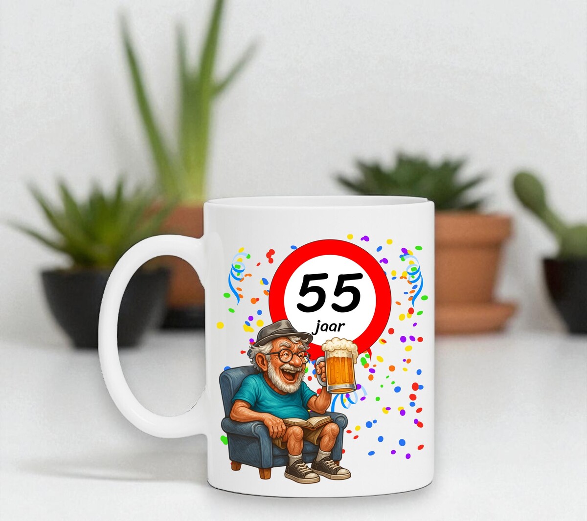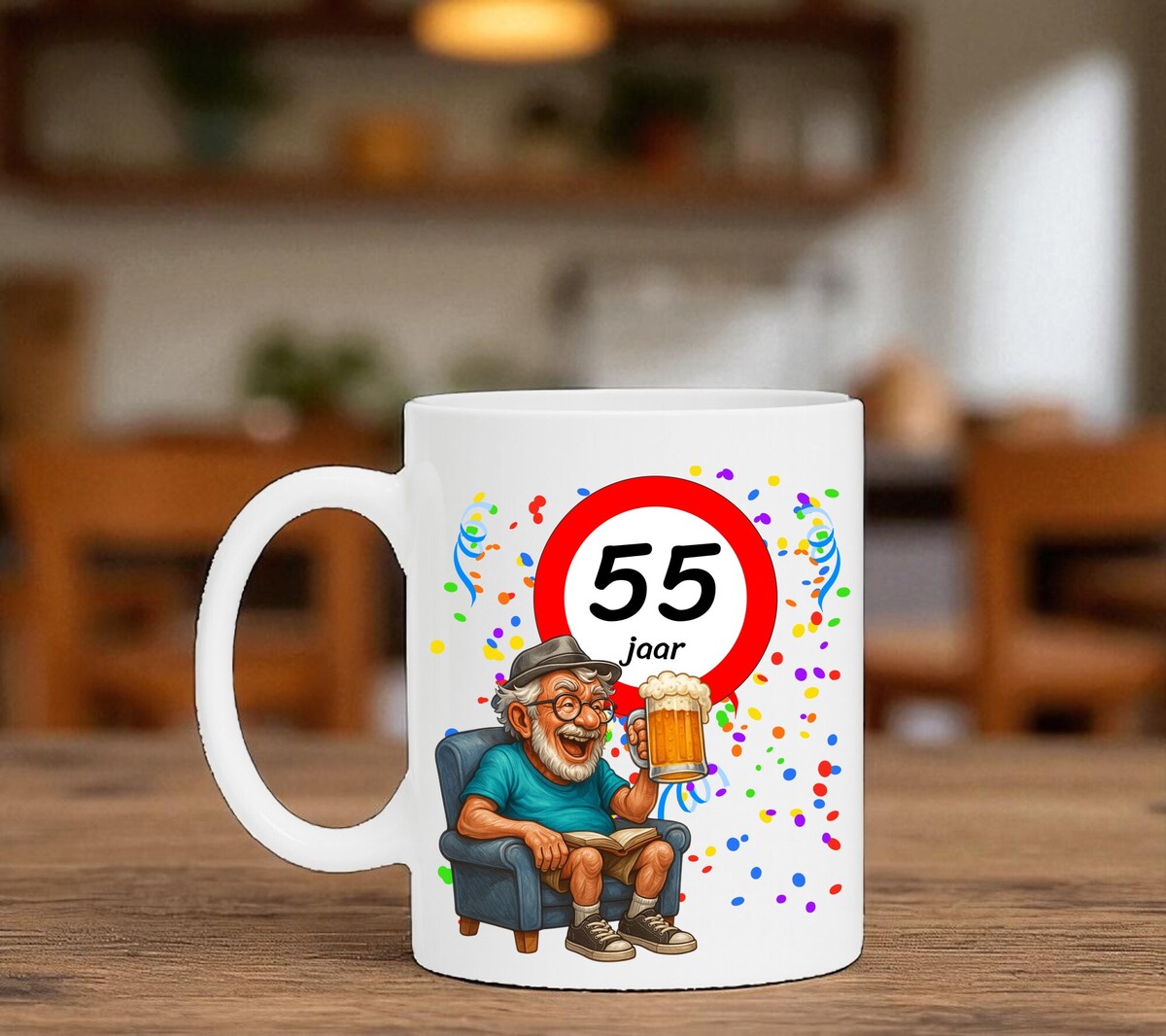 Verras de jarige met deze humoristische koffiemok met een prachtig ontwerp waarop een man heerlijk onderuitgezakt op de bank zit met een biertje in zijn hand, terwijl het bord met 55 zijn nieuwe leeftijd trots laat zien. Een luchtig en vrolijk cadeau dat perfect is voor iedere verjaardag. De mok is vaatwasserbestendig en magnetronbestendig en heeft een hoogte van 96 mm en een diameter van 80 mm.