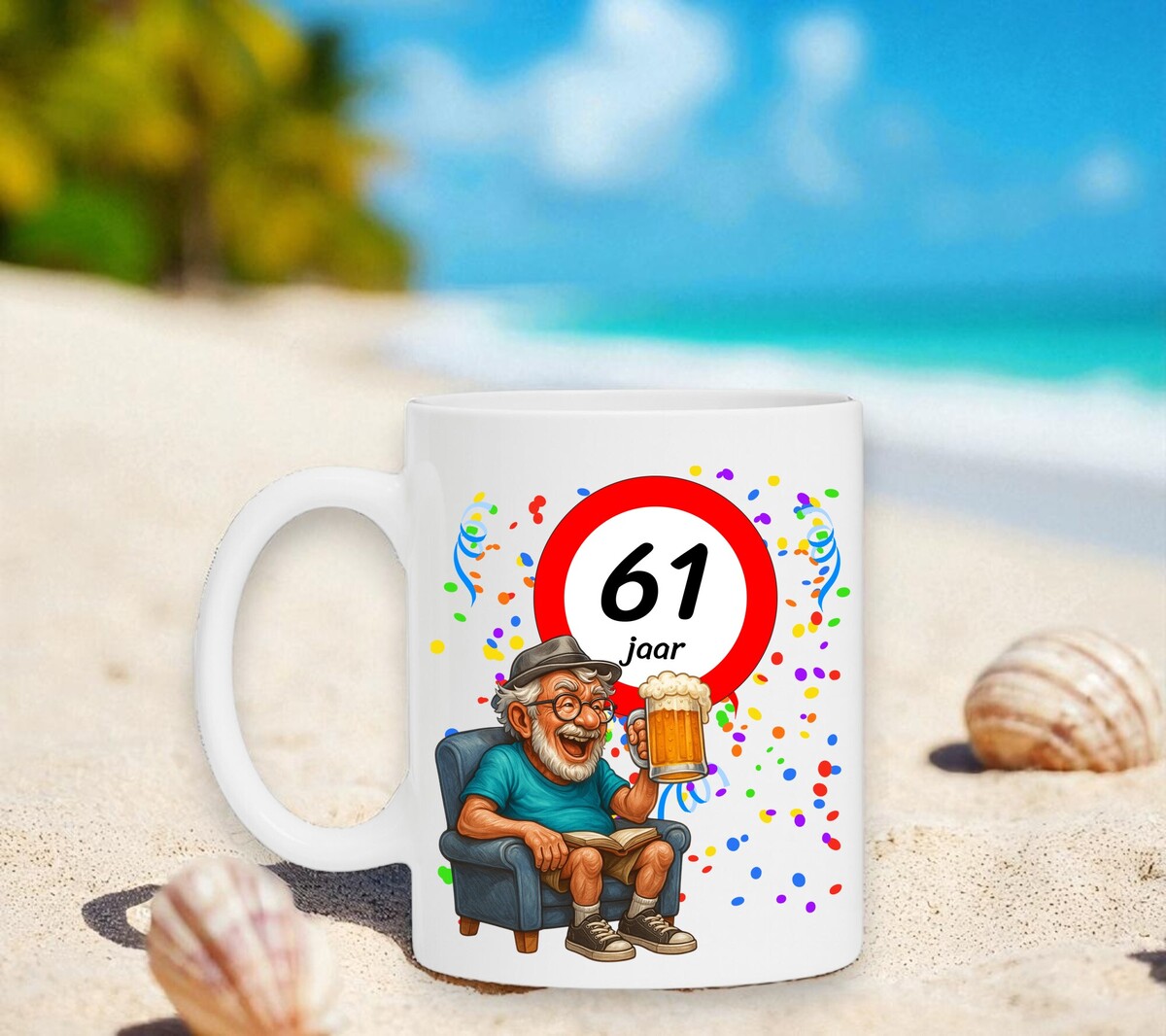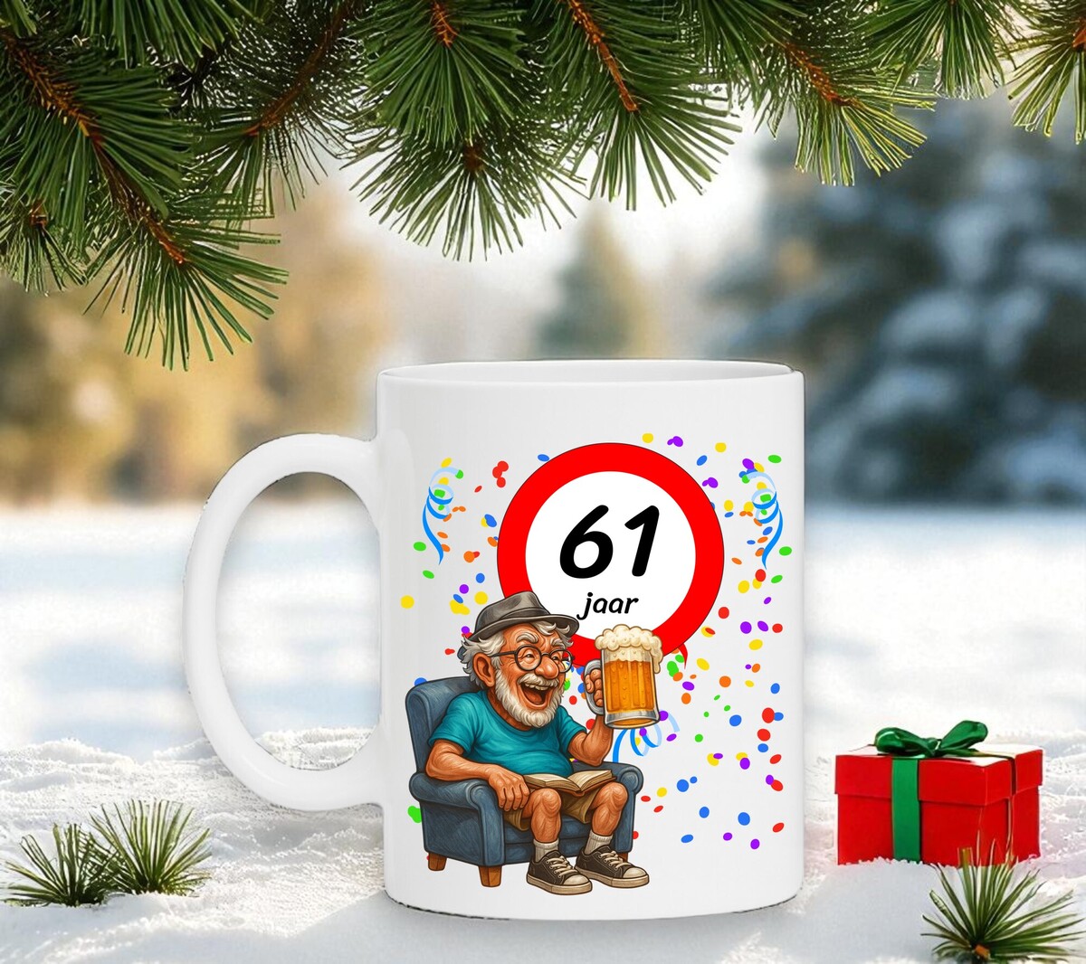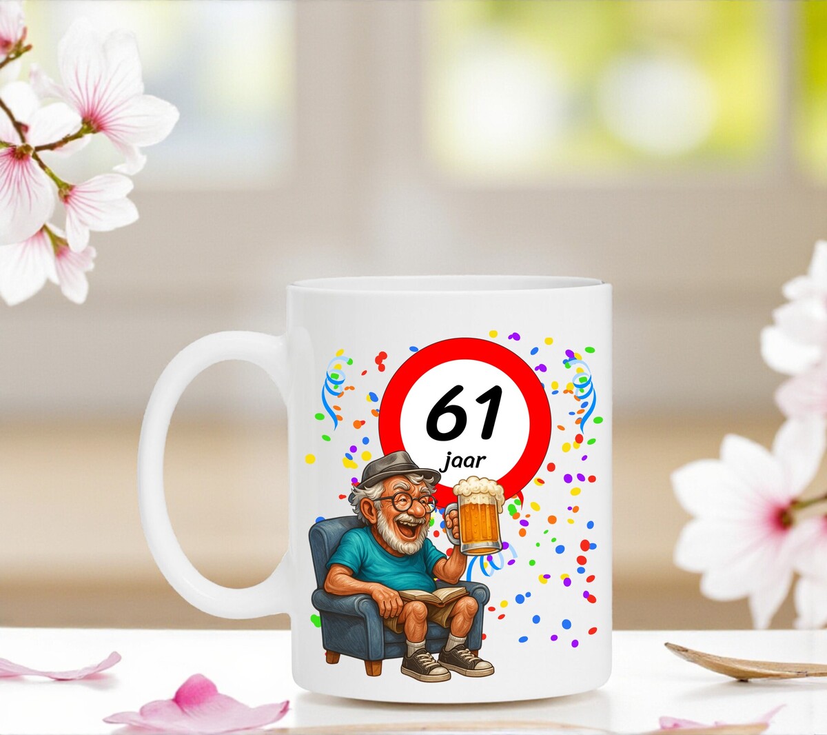 Verras de jarige met deze humoristische koffiemok met een prachtig ontwerp waarop een man heerlijk onderuitgezakt op de bank zit met een biertje in zijn hand, terwijl het bord met 61 zijn nieuwe leeftijd trots laat zien. Een luchtig en vrolijk cadeau dat perfect is voor iedere verjaardag. De mok is vaatwasserbestendig en magnetronbestendig en heeft een hoogte van 96 mm en een diameter van 80 mm.