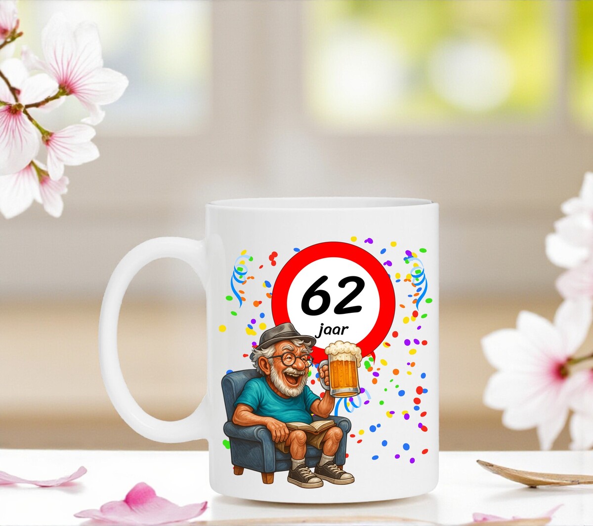 Verras de jarige met deze humoristische koffiemok met een prachtig ontwerp waarop een man heerlijk onderuitgezakt op de bank zit met een biertje in zijn hand, terwijl het bord met 62 zijn nieuwe leeftijd trots laat zien. Een luchtig en vrolijk cadeau dat perfect is voor iedere verjaardag. De mok is vaatwasserbestendig en magnetronbestendig en heeft een hoogte van 96 mm en een diameter van 80 mm.