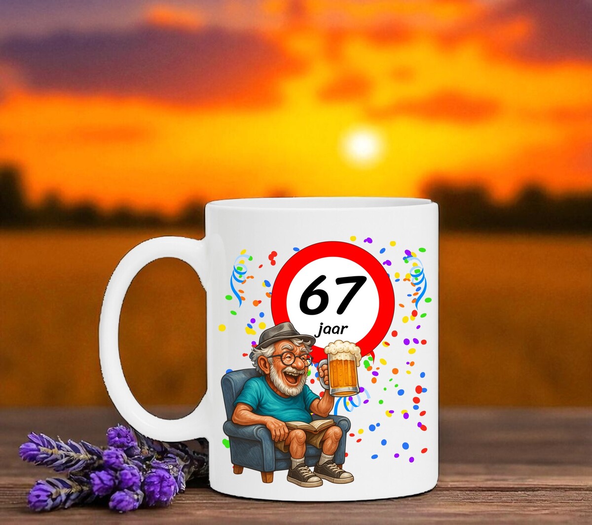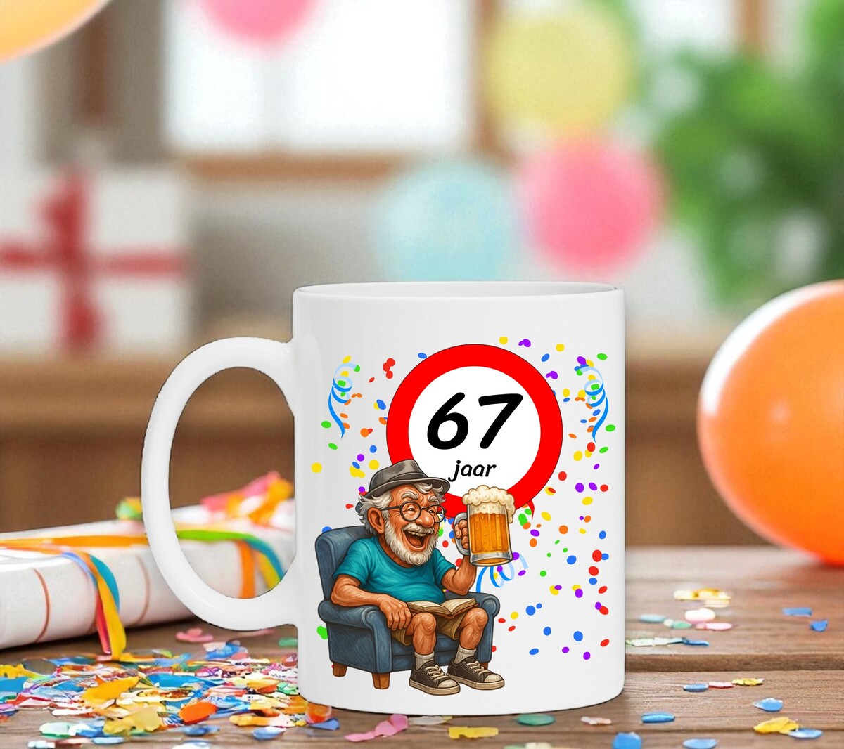 Verras de jarige met deze humoristische koffiemok met een prachtig ontwerp waarop een man heerlijk onderuitgezakt op de bank zit met een biertje in zijn hand, terwijl het bord met 67 zijn nieuwe leeftijd trots laat zien. Een luchtig en vrolijk cadeau dat perfect is voor iedere verjaardag. De mok is vaatwasserbestendig en magnetronbestendig en heeft een hoogte van 96 mm en een diameter van 80 mm.