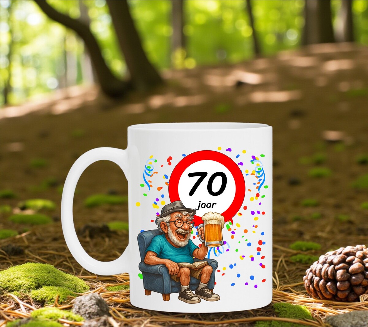 Verras de jarige met deze humoristische koffiemok met een prachtig ontwerp waarop een man heerlijk onderuitgezakt op de bank zit met een biertje in zijn hand, terwijl het bord met 70 zijn nieuwe leeftijd trots laat zien. Een luchtig en vrolijk cadeau dat perfect is voor iedere verjaardag. De mok is vaatwasserbestendig en magnetronbestendig en heeft een hoogte van 96 mm en een diameter van 80 mm.