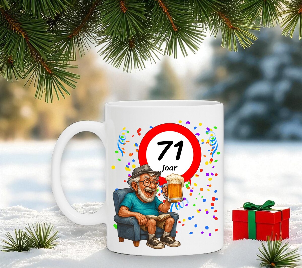 Verras de jarige met deze humoristische koffiemok met een prachtig ontwerp waarop een man heerlijk onderuitgezakt op de bank zit met een biertje in zijn hand, terwijl het bord met 71 zijn nieuwe leeftijd trots laat zien. Een luchtig en vrolijk cadeau dat perfect is voor iedere verjaardag. De mok is vaatwasserbestendig en magnetronbestendig en heeft een hoogte van 96 mm en een diameter van 80 mm.