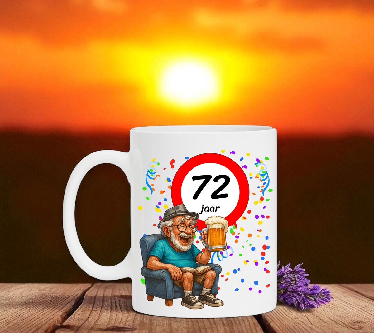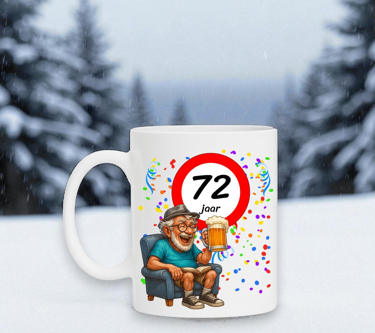 Verras de jarige met deze humoristische koffiemok met een prachtig ontwerp waarop een man heerlijk onderuitgezakt op de bank zit met een biertje in zijn hand, terwijl het bord met 72 zijn nieuwe leeftijd trots laat zien. Een luchtig en vrolijk cadeau dat perfect is voor iedere verjaardag. De mok is vaatwasserbestendig en magnetronbestendig en heeft een hoogte van 96 mm en een diameter van 80 mm.