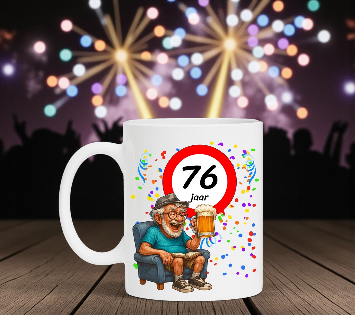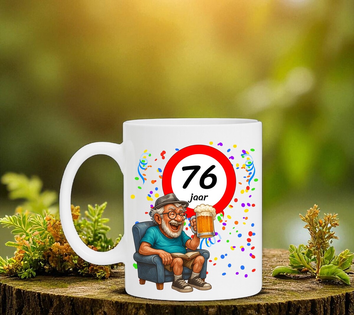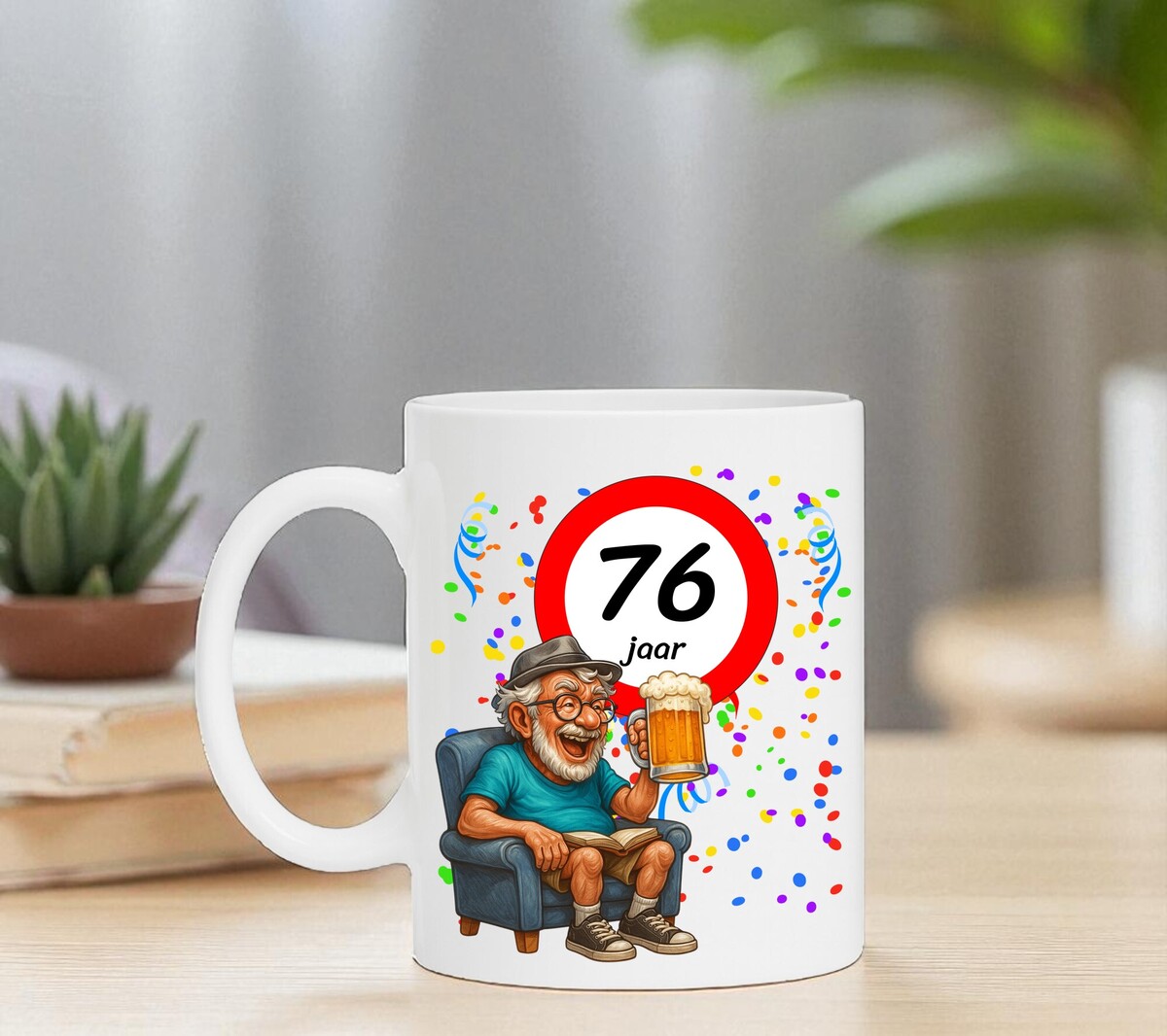 Verras de jarige met deze humoristische koffiemok met een prachtig ontwerp waarop een man heerlijk onderuitgezakt op de bank zit met een biertje in zijn hand, terwijl het bord met 76 zijn nieuwe leeftijd trots laat zien. Een luchtig en vrolijk cadeau dat perfect is voor iedere verjaardag. De mok is vaatwasserbestendig en magnetronbestendig en heeft een hoogte van 96 mm en een diameter van 80 mm.