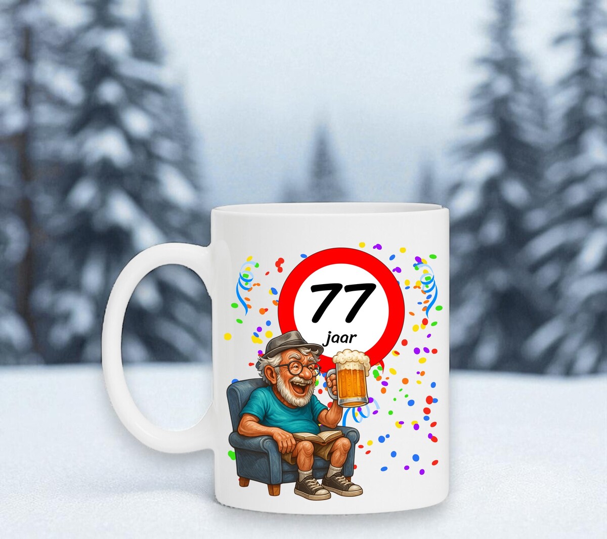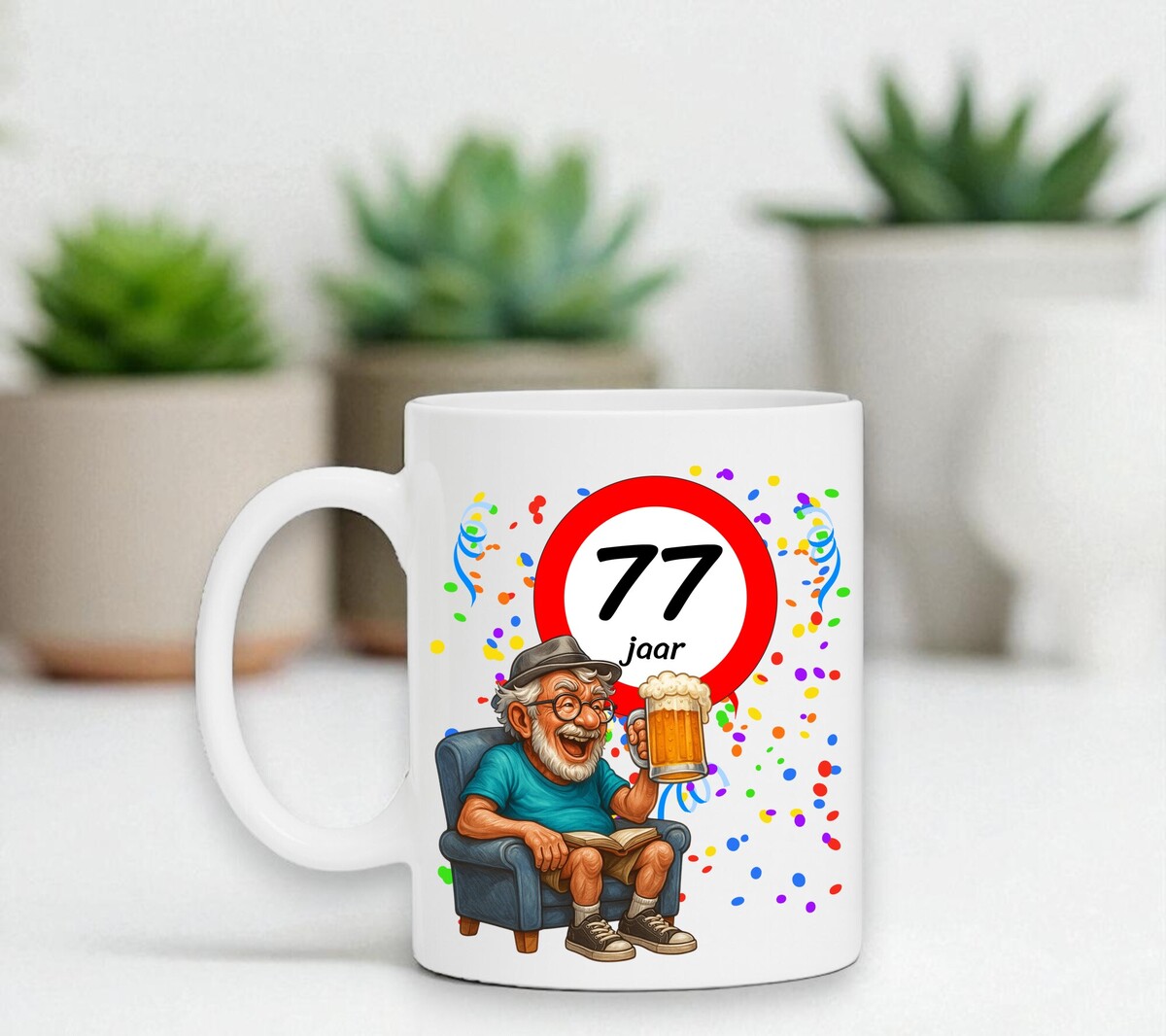 Verras de jarige met deze humoristische koffiemok met een prachtig ontwerp waarop een man heerlijk onderuitgezakt op de bank zit met een biertje in zijn hand, terwijl het bord met 77 zijn nieuwe leeftijd trots laat zien. Een luchtig en vrolijk cadeau dat perfect is voor iedere verjaardag. De mok is vaatwasserbestendig en magnetronbestendig en heeft een hoogte van 96 mm en een diameter van 80 mm.