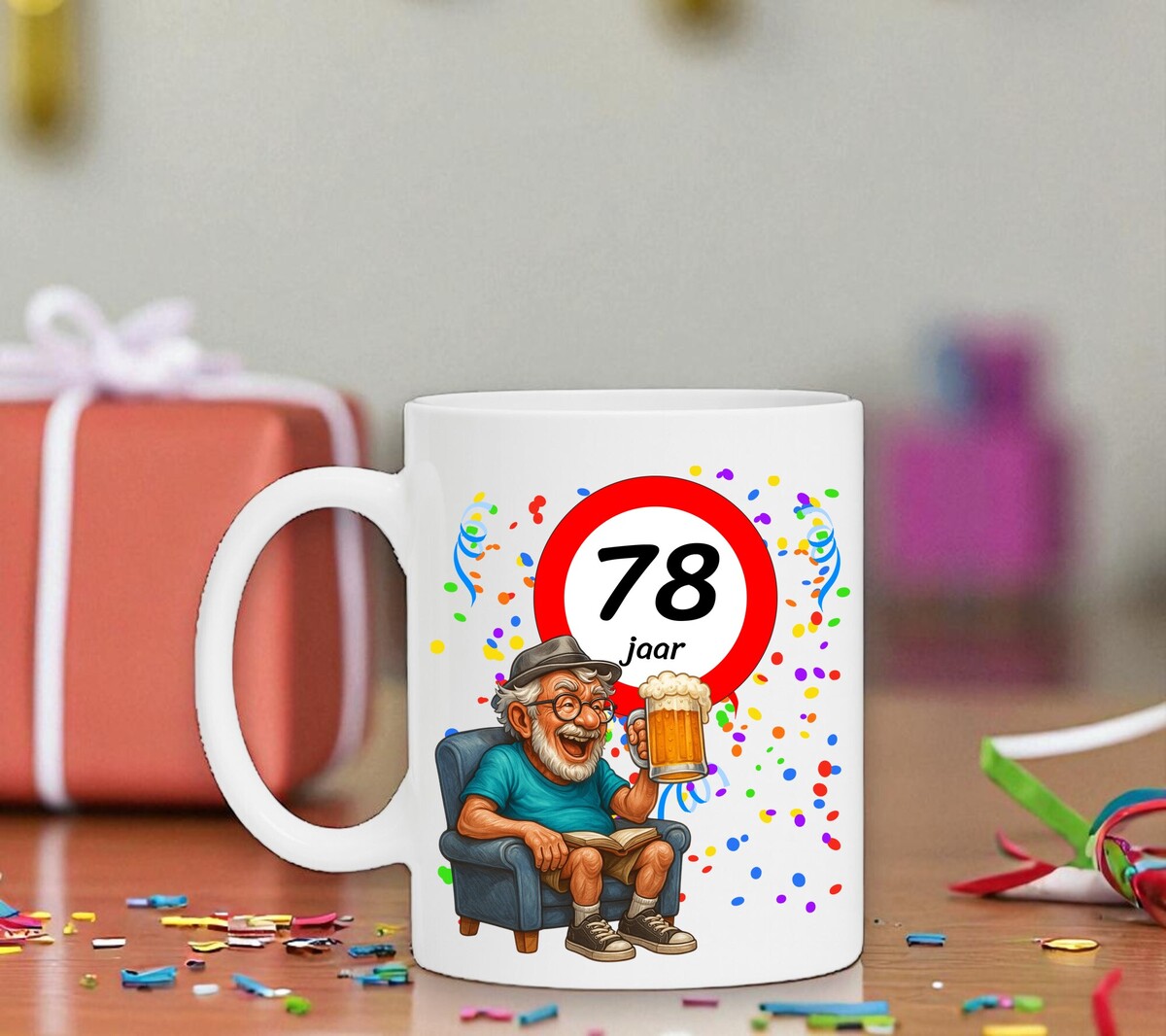Verras de jarige met deze humoristische koffiemok met een prachtig ontwerp waarop een man heerlijk onderuitgezakt op de bank zit met een biertje in zijn hand, terwijl het bord met 78 zijn nieuwe leeftijd trots laat zien. Een luchtig en vrolijk cadeau dat perfect is voor iedere verjaardag. De mok is vaatwasserbestendig en magnetronbestendig en heeft een hoogte van 96 mm en een diameter van 80 mm.