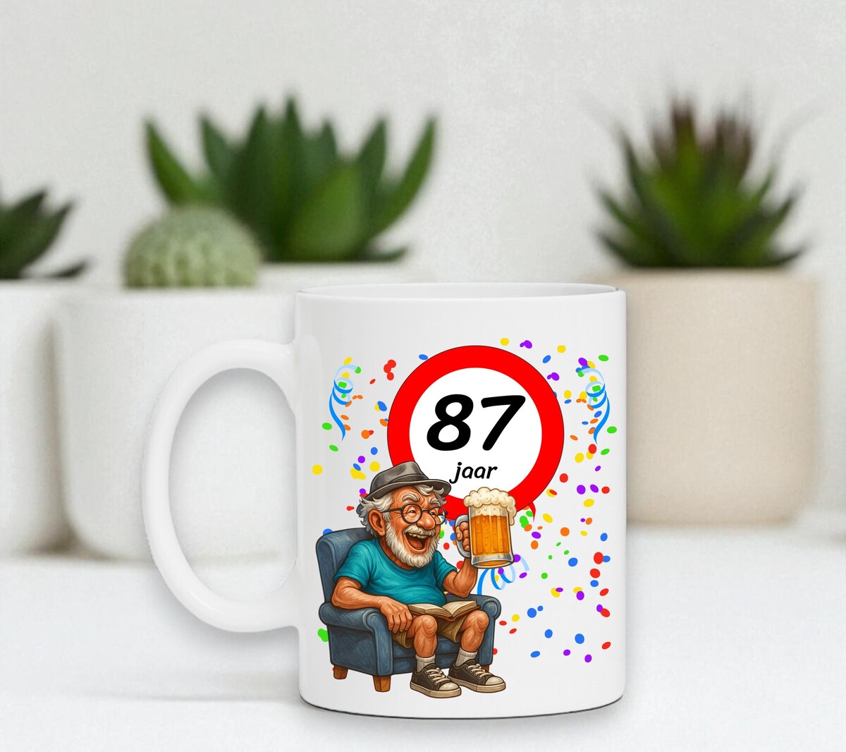 Verras de jarige met deze humoristische koffiemok met een prachtig ontwerp waarop een man heerlijk onderuitgezakt op de bank zit met een biertje in zijn hand, terwijl het bord met 87 zijn nieuwe leeftijd trots laat zien. Een luchtig en vrolijk cadeau dat perfect is voor iedere verjaardag. De mok is vaatwasserbestendig en magnetronbestendig en heeft een hoogte van 96 mm en een diameter van 80 mm.