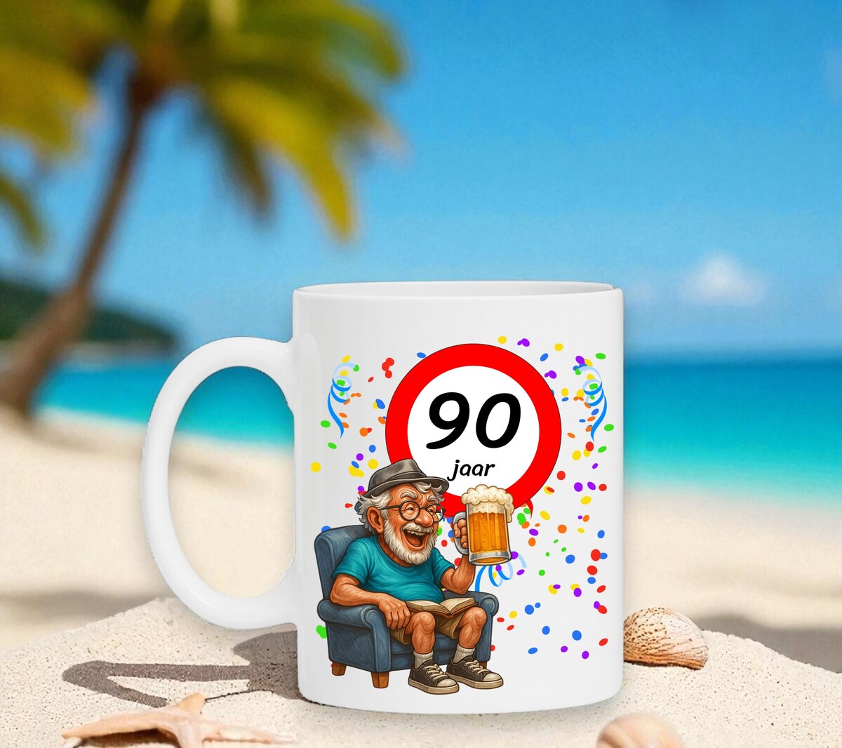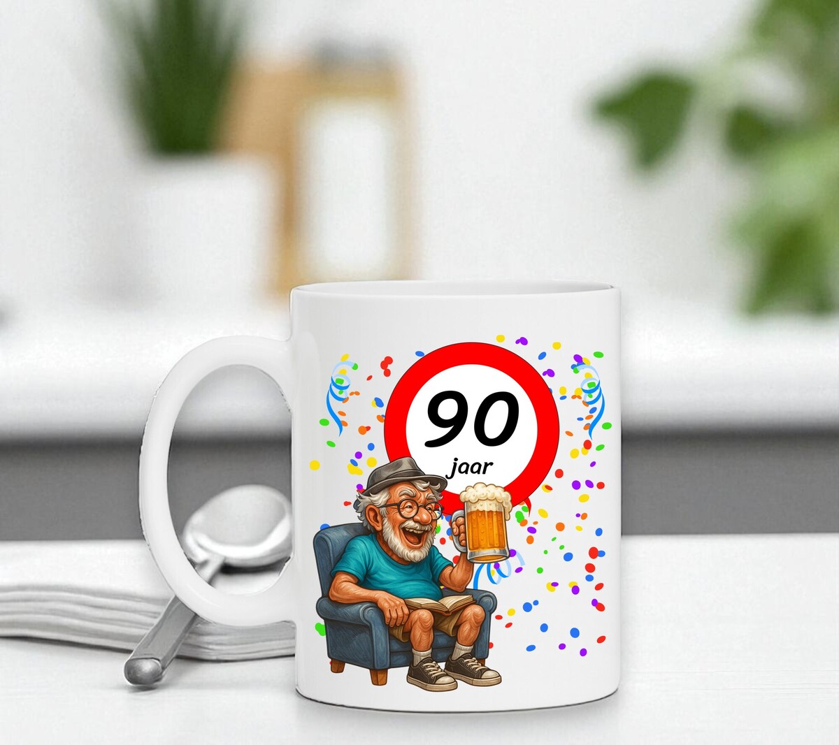 Verras de jarige met deze humoristische koffiemok met een prachtig ontwerp waarop een man heerlijk onderuitgezakt op de bank zit met een biertje in zijn hand, terwijl het bord met 90 zijn nieuwe leeftijd trots laat zien. Een luchtig en vrolijk cadeau dat perfect is voor iedere verjaardag. De mok is vaatwasserbestendig en magnetronbestendig en heeft een hoogte van 96 mm en een diameter van 80 mm.