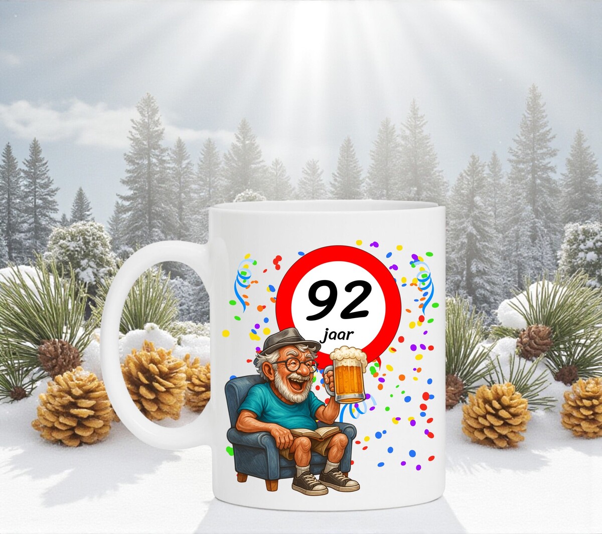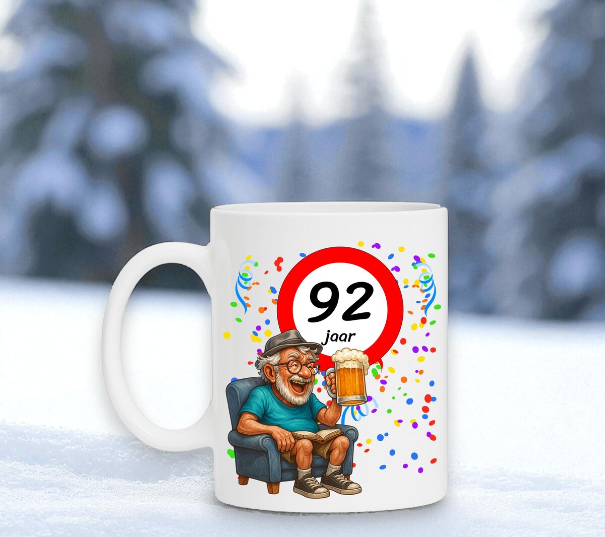 Verras de jarige met deze humoristische koffiemok met een prachtig ontwerp waarop een man heerlijk onderuitgezakt op de bank zit met een biertje in zijn hand, terwijl het bord met 92 zijn nieuwe leeftijd trots laat zien. Een luchtig en vrolijk cadeau dat perfect is voor iedere verjaardag. De mok is vaatwasserbestendig en magnetronbestendig en heeft een hoogte van 96 mm en een diameter van 80 mm.