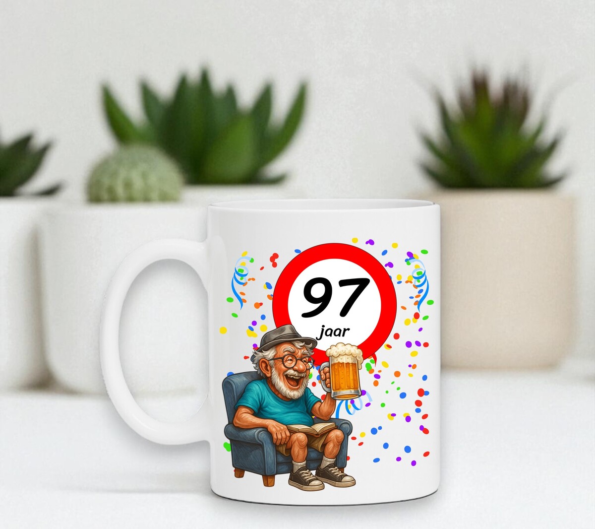 Verras de jarige met deze humoristische koffiemok met een prachtig ontwerp waarop een man heerlijk onderuitgezakt op de bank zit met een biertje in zijn hand, terwijl het bord met 97 zijn nieuwe leeftijd trots laat zien. Een luchtig en vrolijk cadeau dat perfect is voor iedere verjaardag. De mok is vaatwasserbestendig en magnetronbestendig en heeft een hoogte van 96 mm en een diameter van 80 mm.