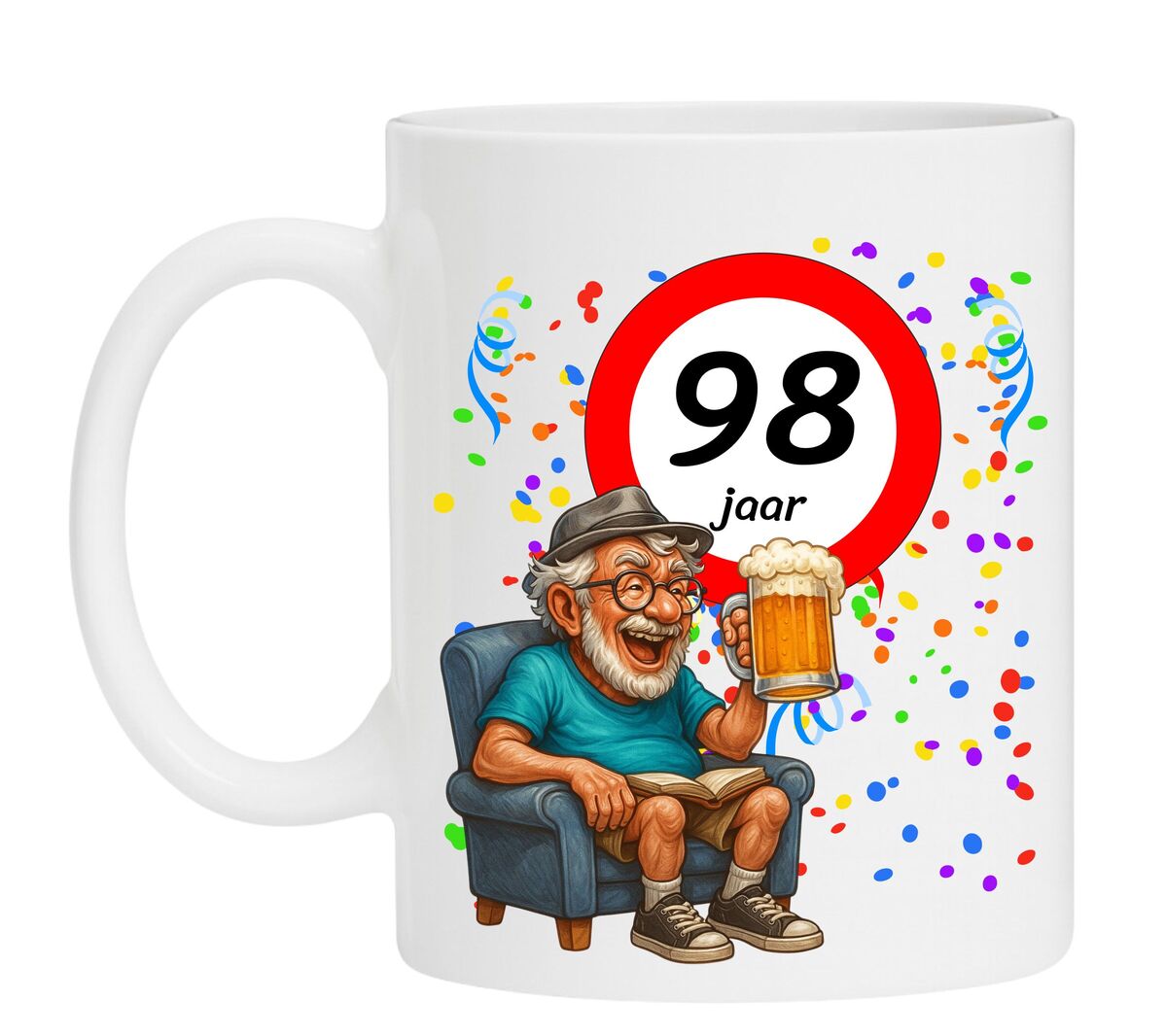 Verras de jarige met deze humoristische koffiemok met een prachtig ontwerp waarop een man heerlijk onderuitgezakt op de bank zit met een biertje in zijn hand, terwijl het bord met 98 zijn nieuwe leeftijd trots laat zien. Een luchtig en vrolijk cadeau dat perfect is voor iedere verjaardag. De mok is vaatwasserbestendig en magnetronbestendig en heeft een hoogte van 96 mm en een diameter van 80 mm.