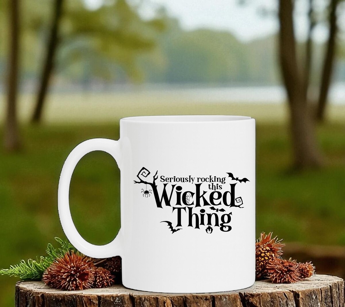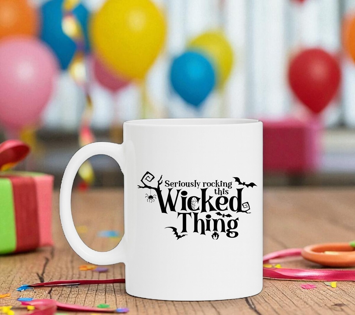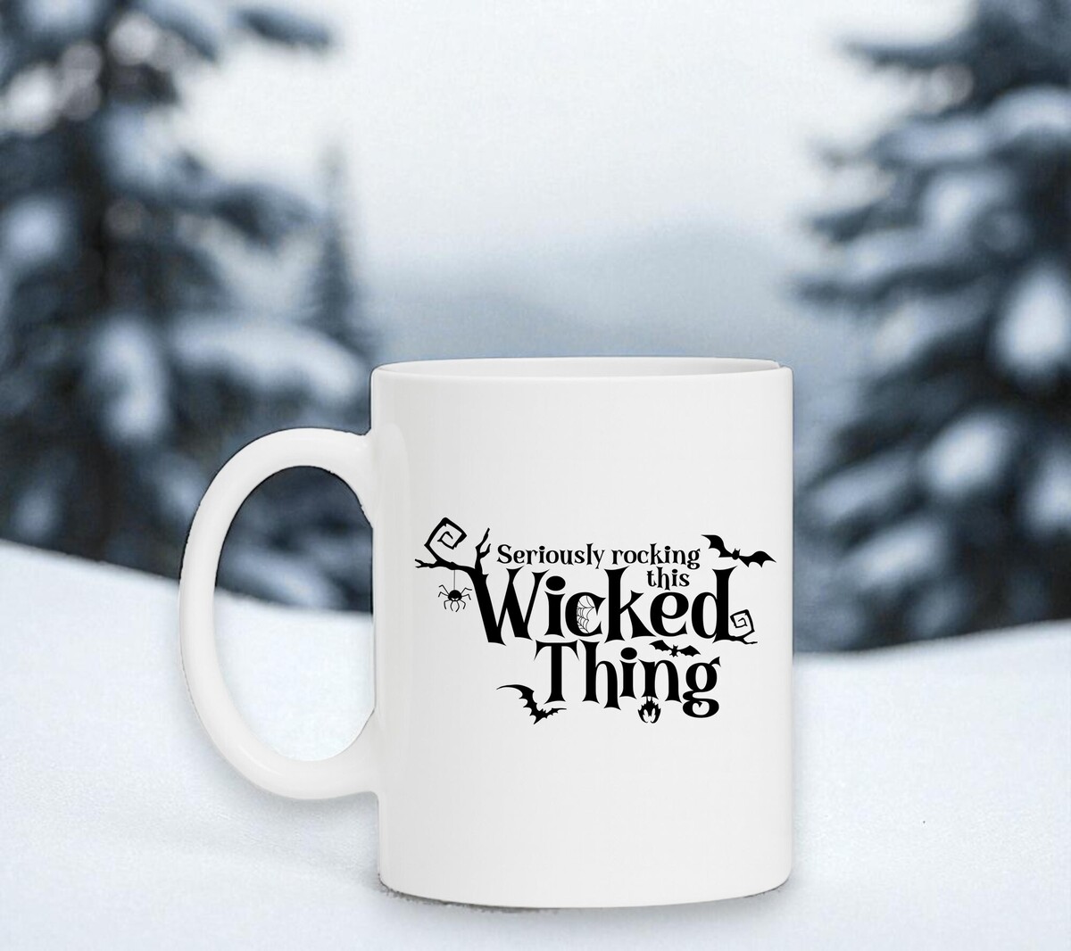 Halloween koffie mok seriously rocking this wicked thing. De witte koffie of thee mok is vaatwasserbestendig en magnetronbestendig. De mok heeft een hoogte van 96mm en een diameter van 80mm.