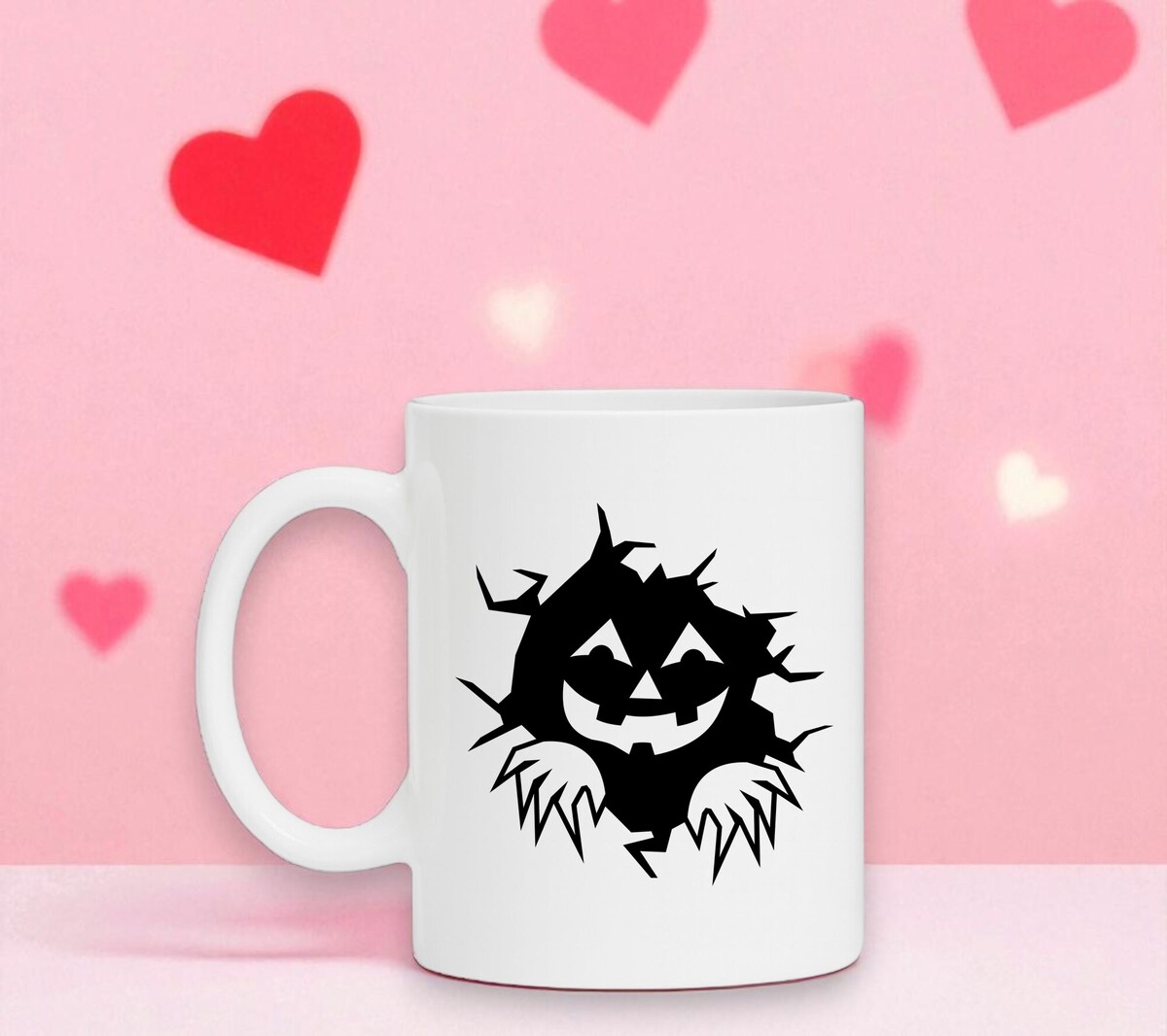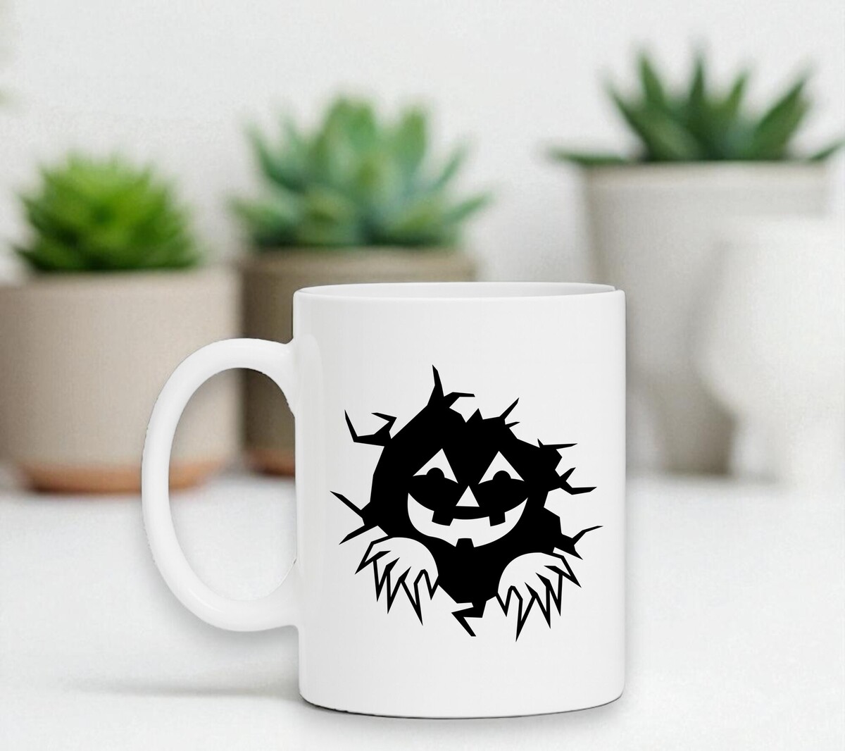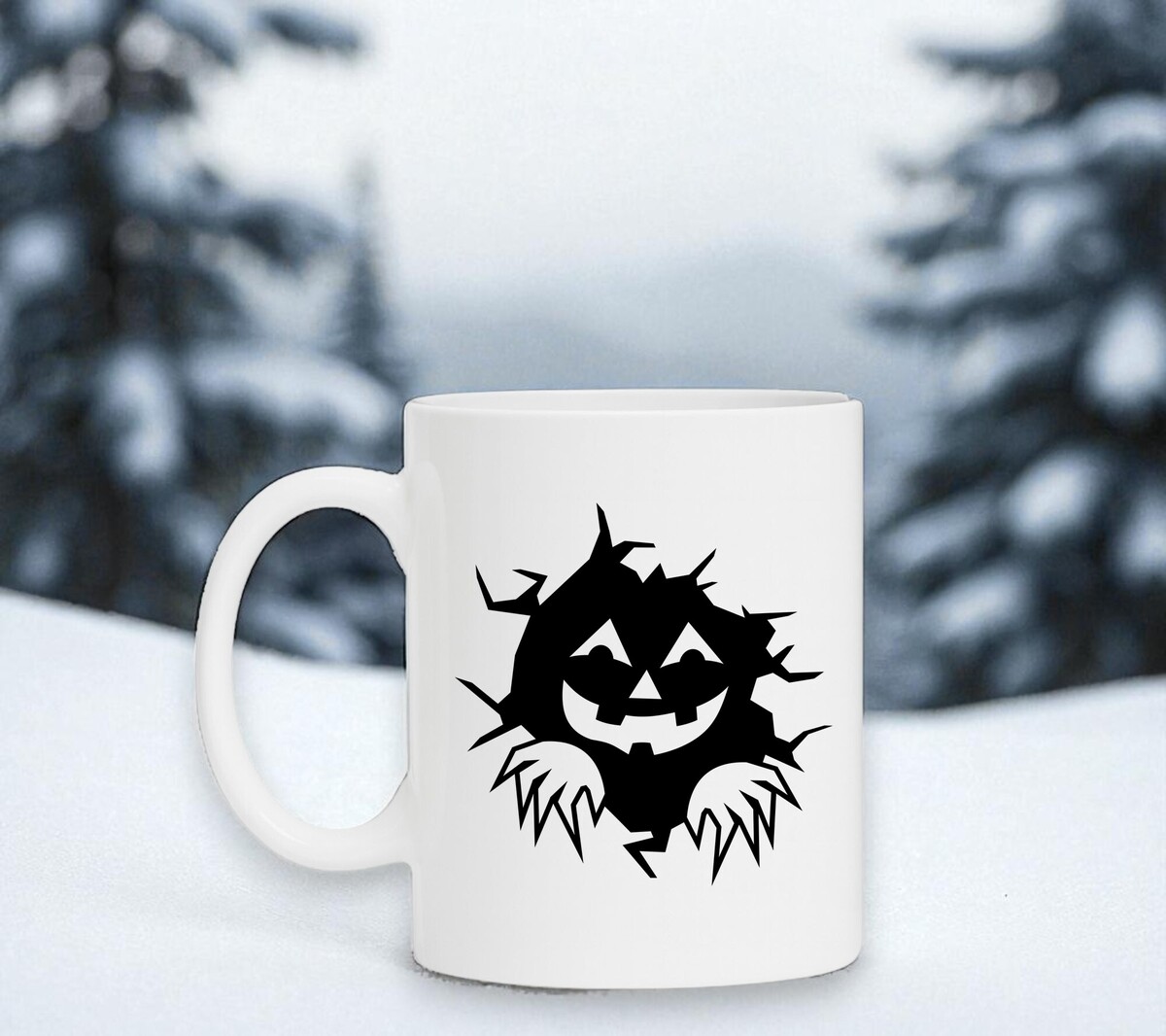Halloween koffie mok waar een vogelverschrikker uit mok breek. De mok is vaatwasserbestendig en heeft een hoogte van 96mm en een diameter van 80mm.