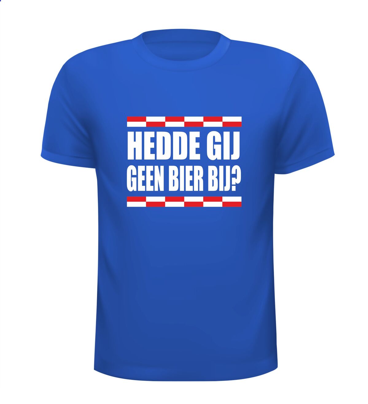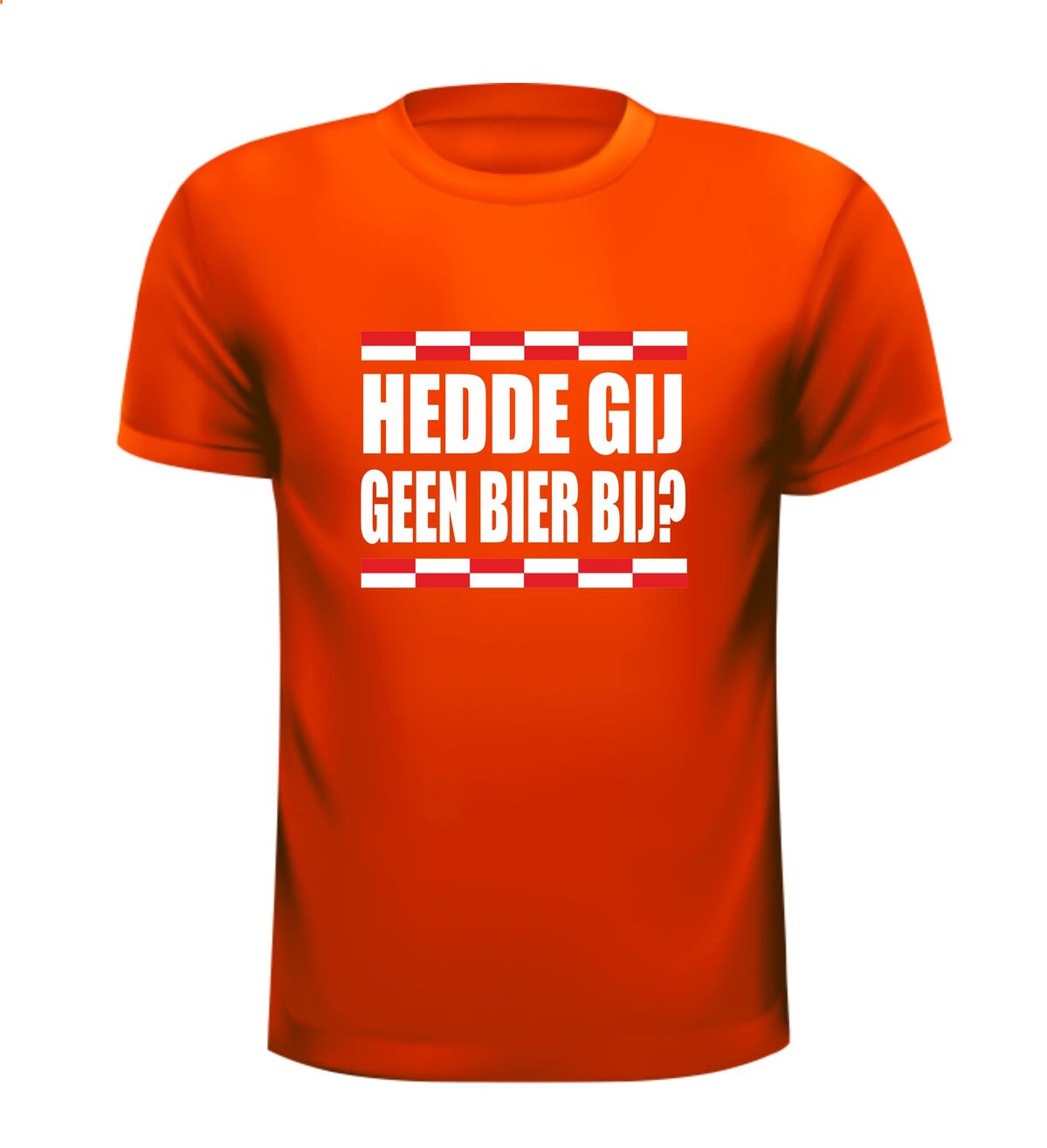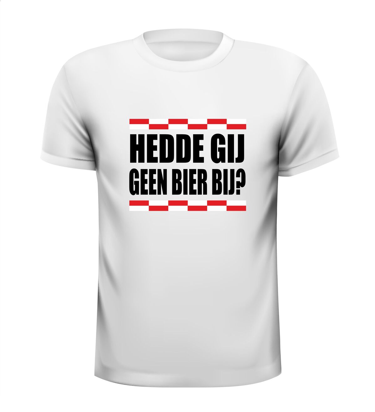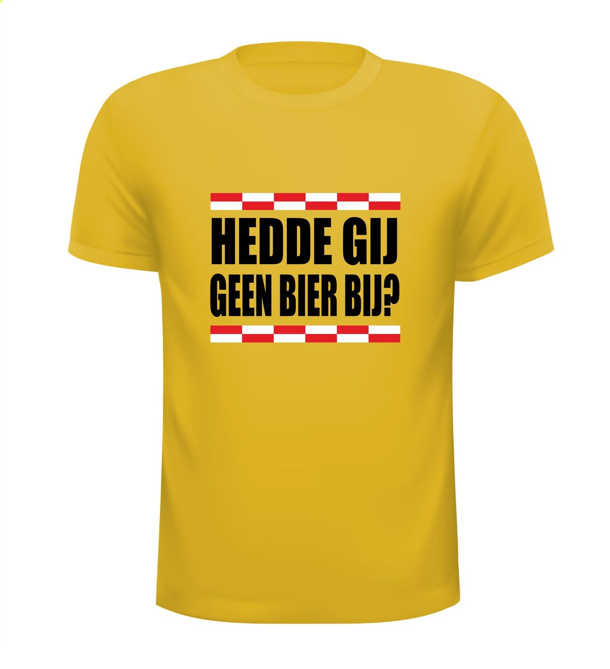 De grappigste uitspraken in het mooi Brabants dialect hebben wij voor je op een T-shirt gezet. Samen met de kleuren van Brabant rood met witte blokken. De tekst op dit T-shirt is: Hedde gij geen bier bij (Dat kan natuurlijk niet.)