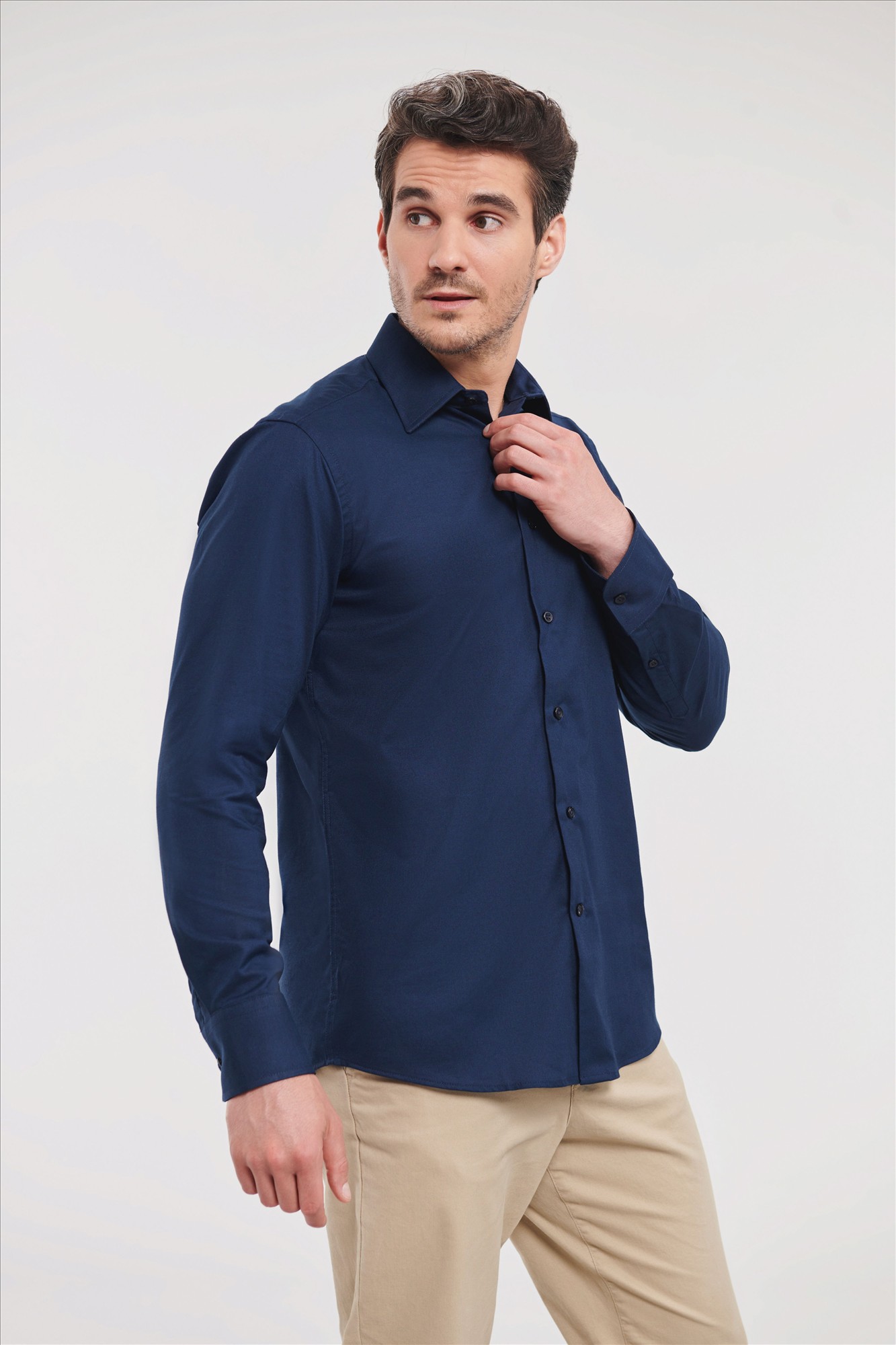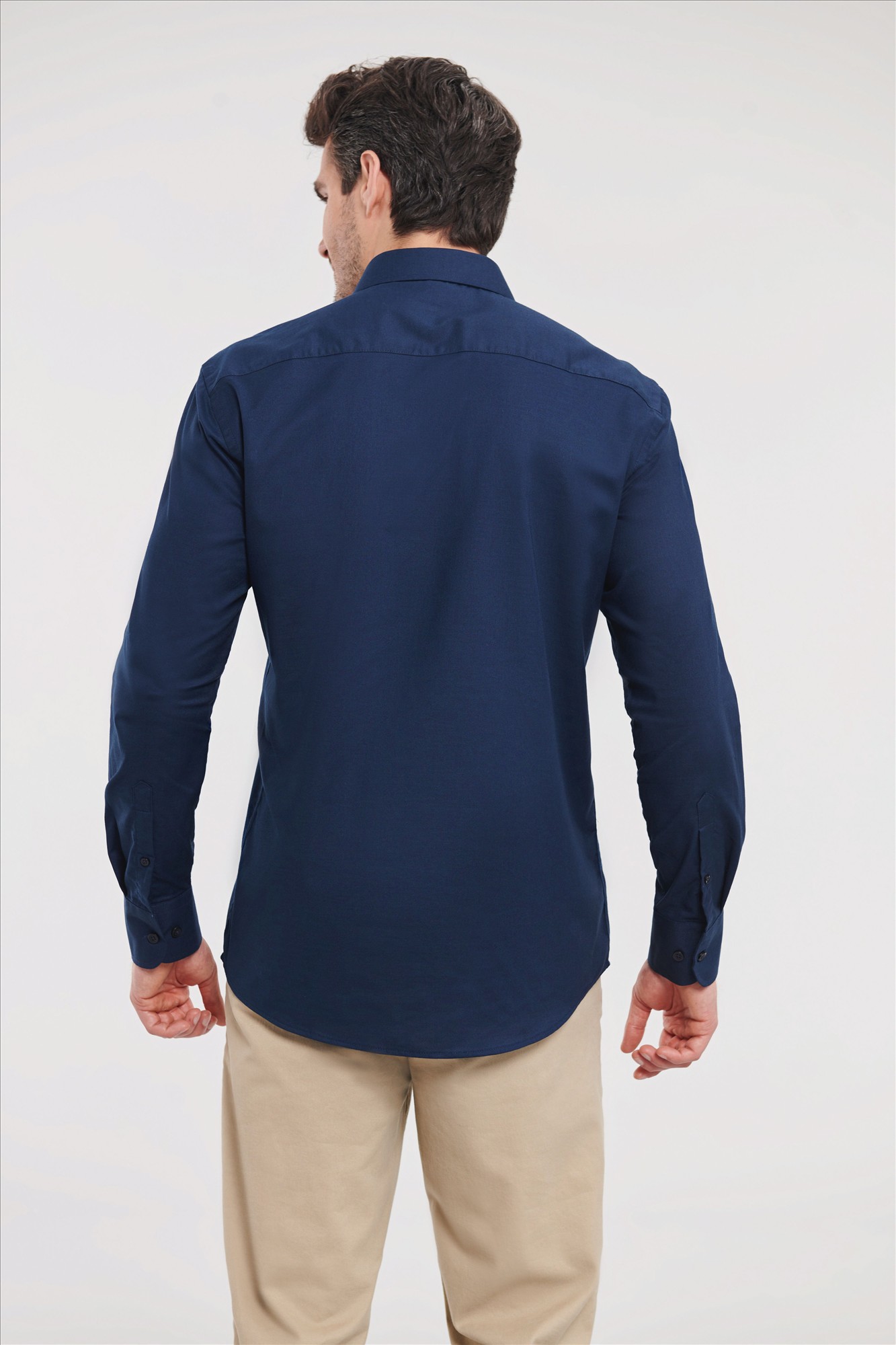 Hedendaags getailleerd model heren wit overhemd lange mouw met hoge kwaliteit Oxford materiaal met uitstekende afwerking. Fraai overhemd met verstevigde semi-open kraag en afgeronde zoom en verstelbare manchetten met twee knopen, optie voor manchetknopen. Erg mooi zakelijk overhemd met easy care dus makkelijk te strijken voor de mannen. Merk: Russell Men LSL Tailored Oxford Shirt. Materiaal:70% Cotton - 30% Polyester Oxford. Dikte: 130 g/m2. Land van herkomst:Bangladesh. De foto van het model dient ter illustratie van de sfeer. Gelieve geen aandacht te besteden aan de kleur.