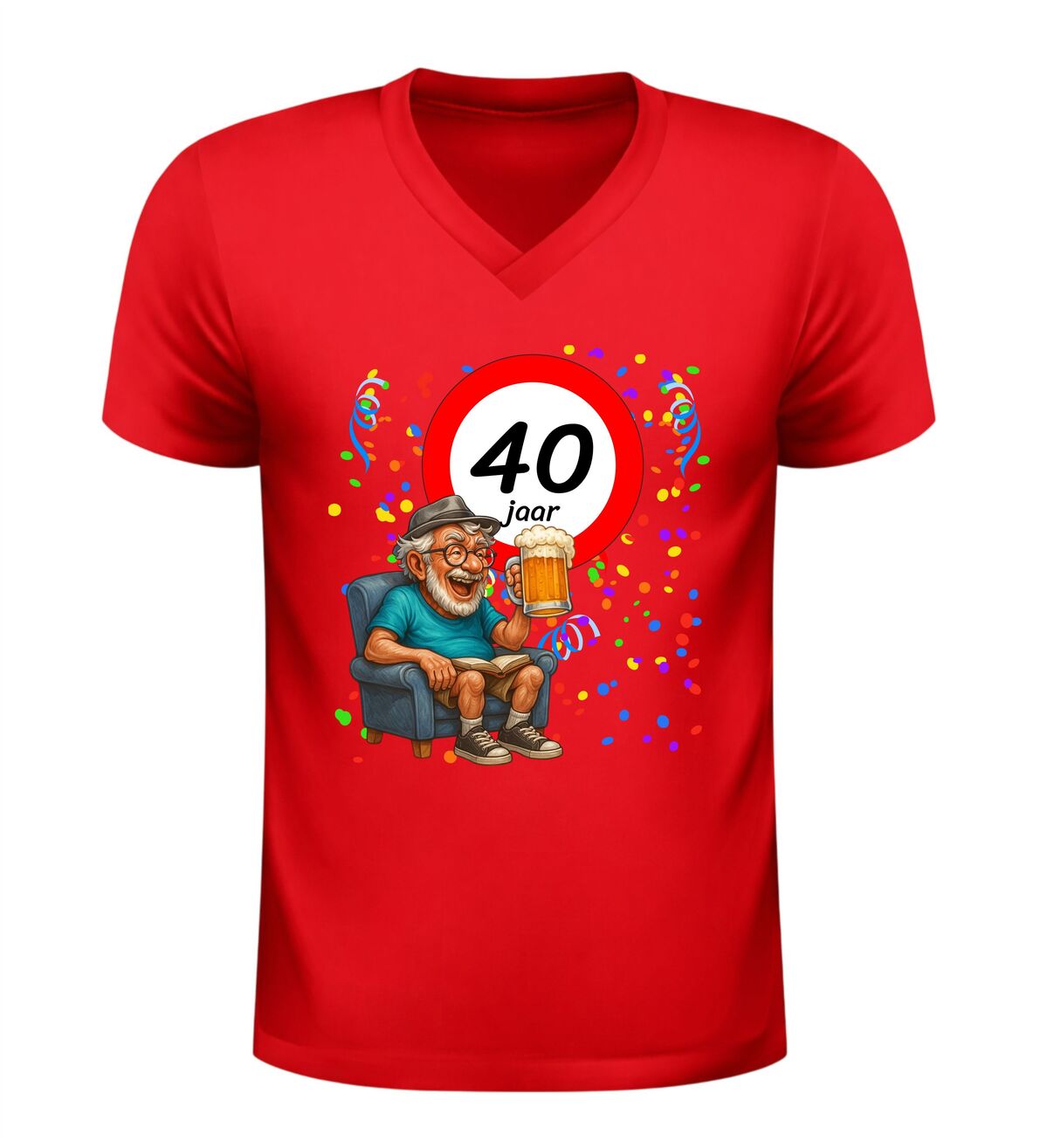 Veertig worden is een mijlpaal die gevierd mag worden met een flinke dosis humor. Dit heren v-hals shirt 40 jaar maakt dat meteen duidelijk. De feestelijke opdruk met een verkeersbord met de leeftijd 40 en een grappige afbeelding van een oude man die ontspannen in een stoel zit met een biertje in de hand zorgt voor herkenning, zelfspot en veel lachende reacties.