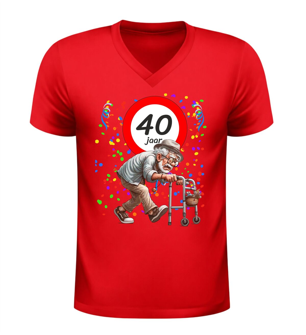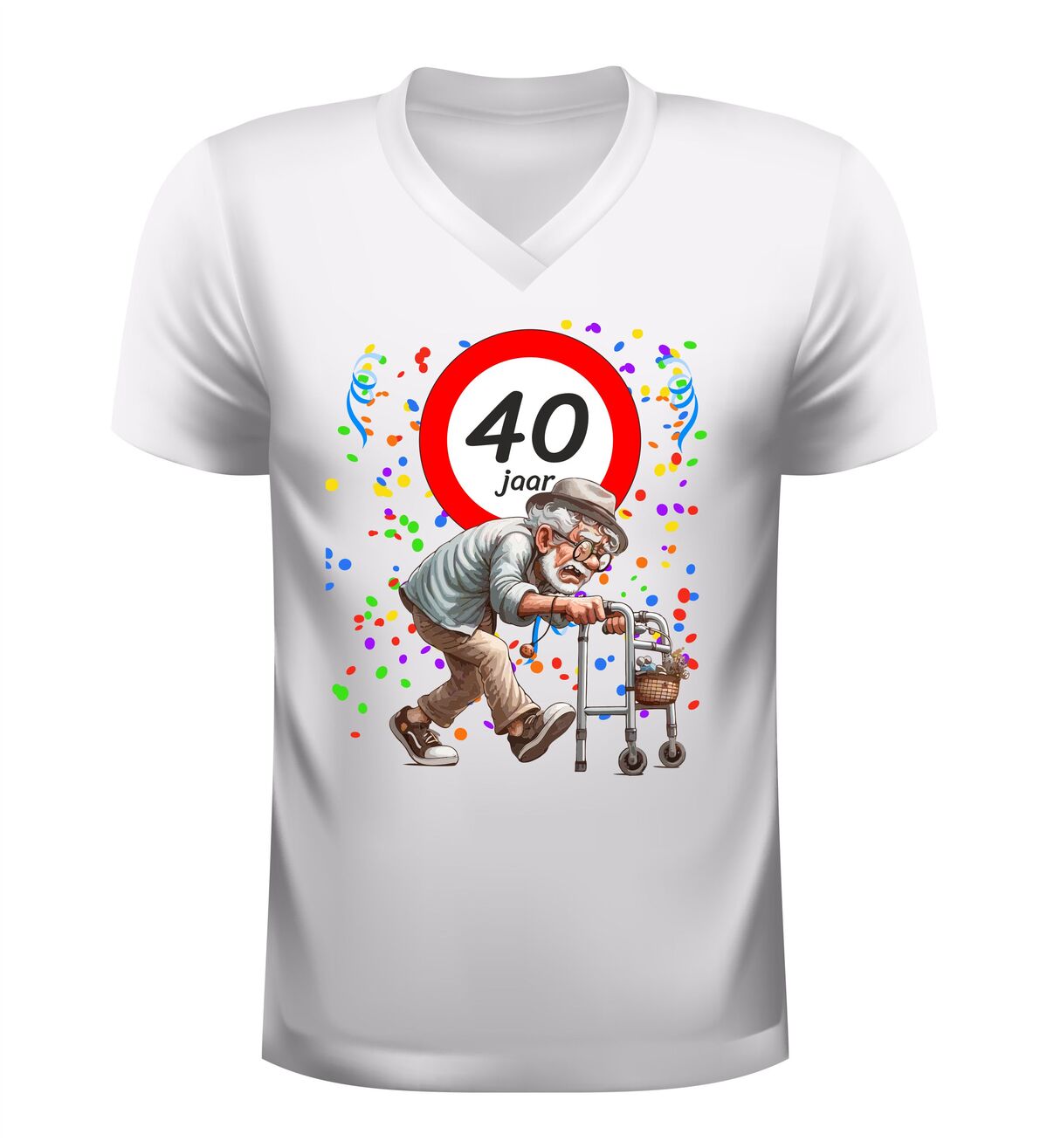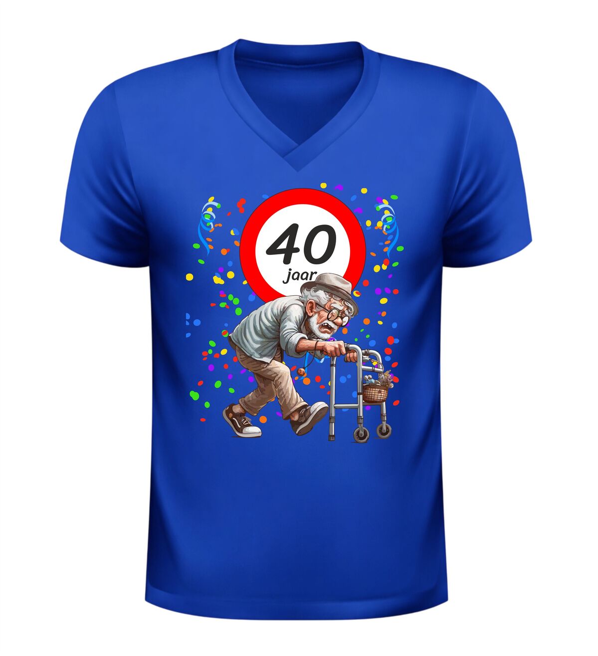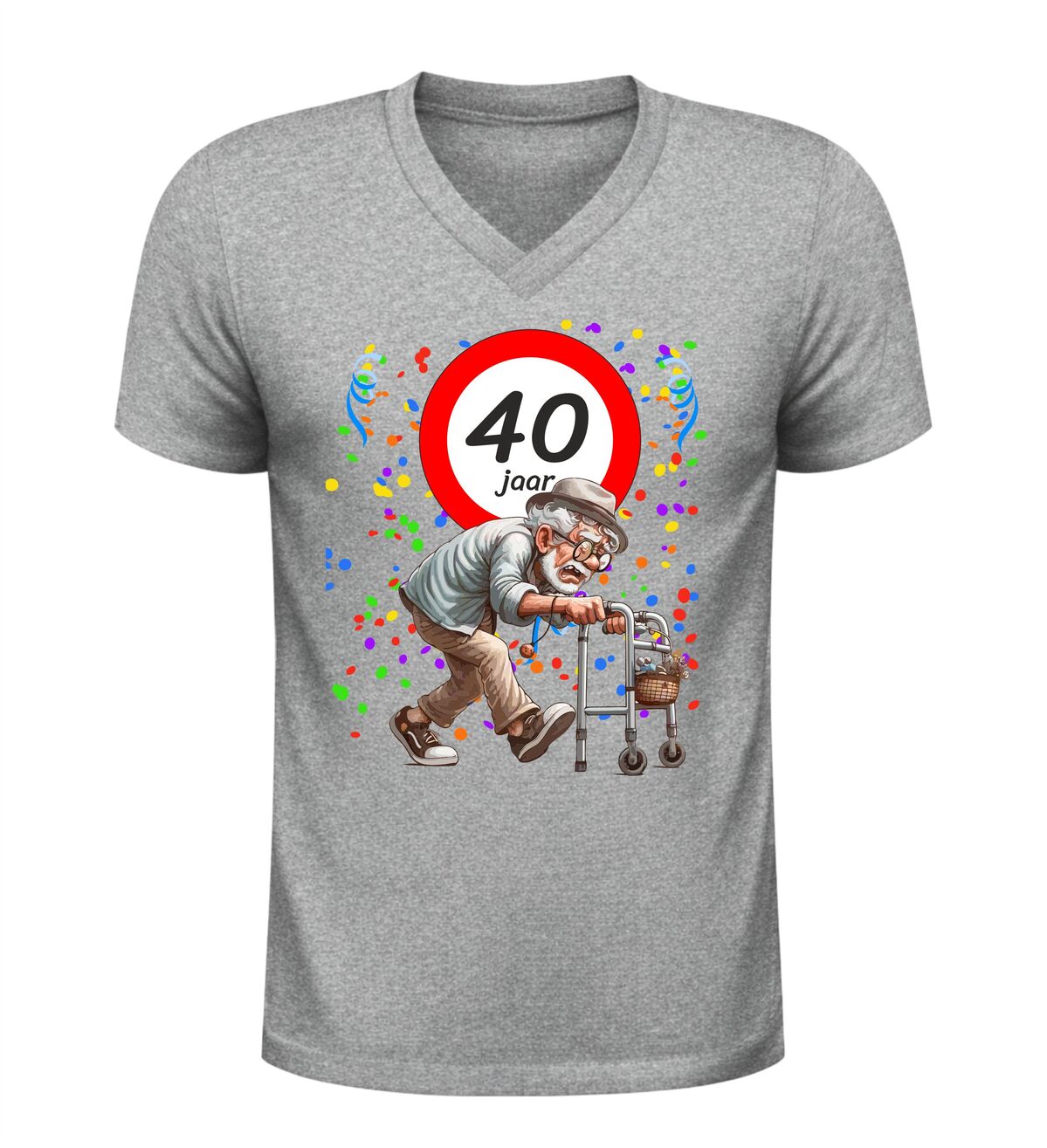 Dit heren V-hals shirt met feestelijke opdruk 40 jaar is het perfecte kledingstuk voor mannen die hun 40ste verjaardag met humor willen vieren. De grappige illustratie van een oude man met rollator zorgt direct voor een lach en maakt dit shirt een echte blikvanger op elk verjaardagsfeest. Het is een origineel en speels ontwerp dat laat zien dat veertig worden juist iets is om trots én met een knipoog te dragen.
