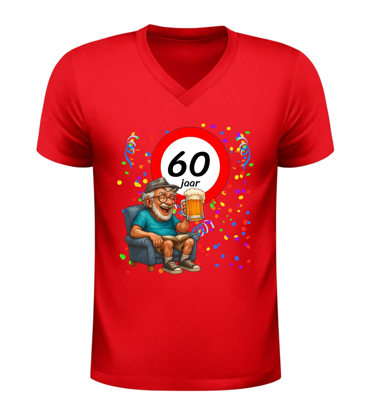 Zestig jaar worden is een mijlpaal die je met humor en gezelligheid viert. Dit heren v-hals shirt 60 jaar is daar perfect voor. De feestelijke opdruk met een verkeersbord waarop 60 jaar staat en een vrolijk oud opaatje dat ontspannen in een stoel zit met een grote pul bier in zijn hand, zorgt direct voor herkenning en een glimlach.