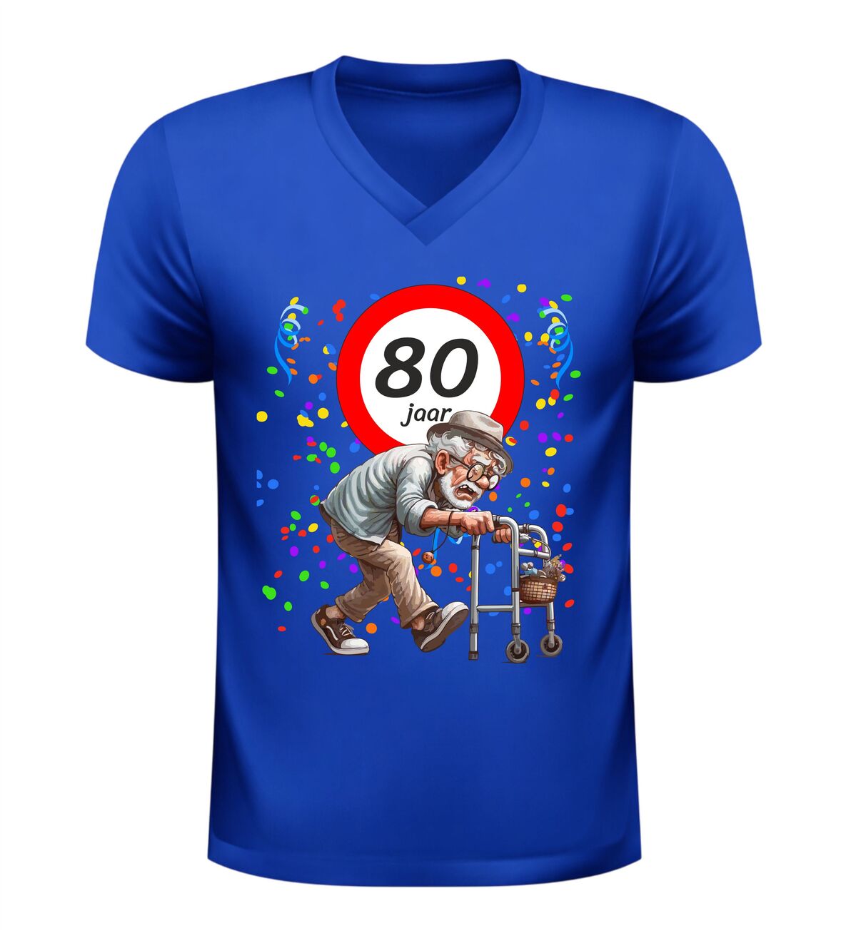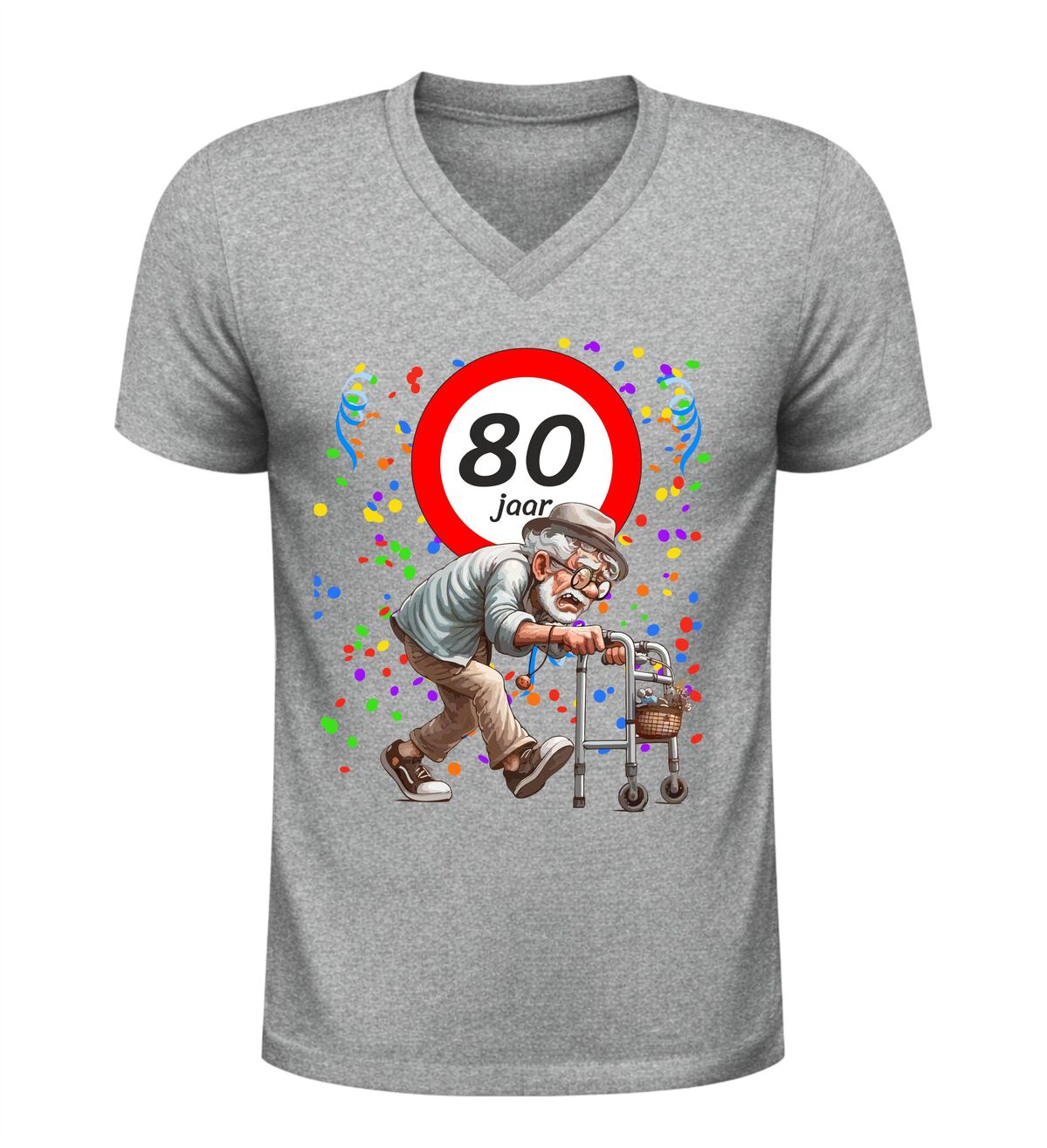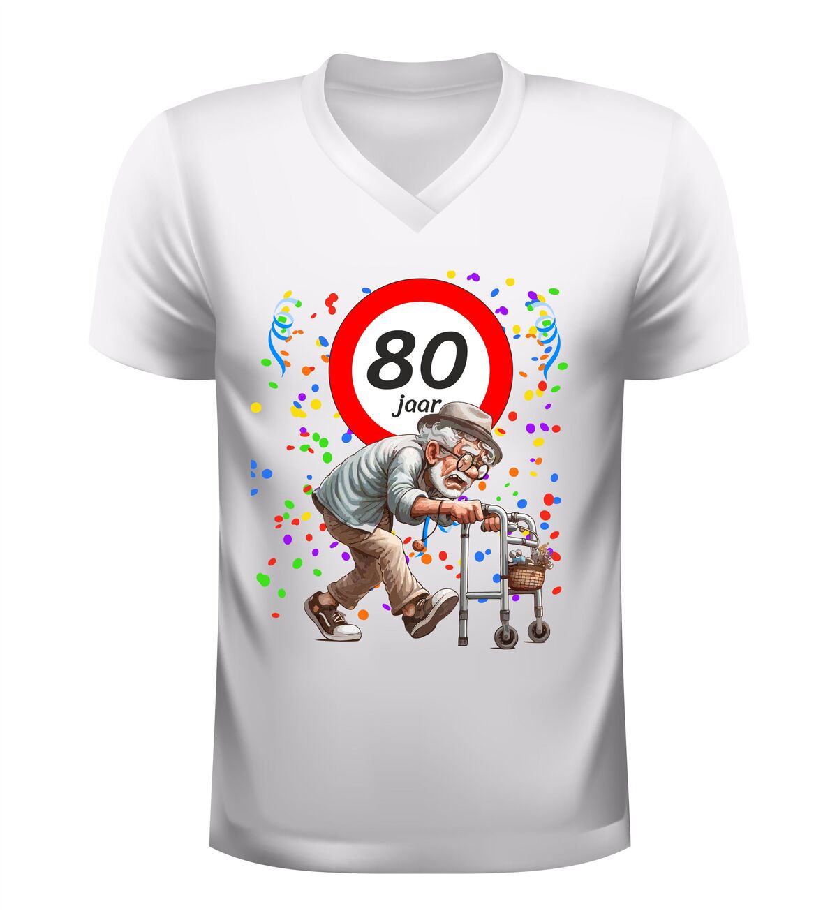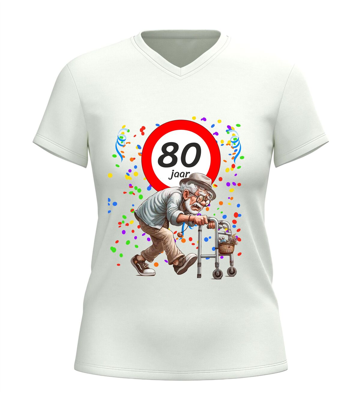 Ben je op zoek naar een origineel en grappig cadeau voor een man die 80 jaar wordt? Dan is dit 80 jaar V-hals shirt voor heren een schot in de roos. Feestelijk, luchtig en gegarandeerd goed voor lachende gezichten, plagerige opmerkingen en een verjaardag die niemand snel vergeet. Want eerlijk is eerlijk: 80 worden is een prestatie… zelfs met rollator.