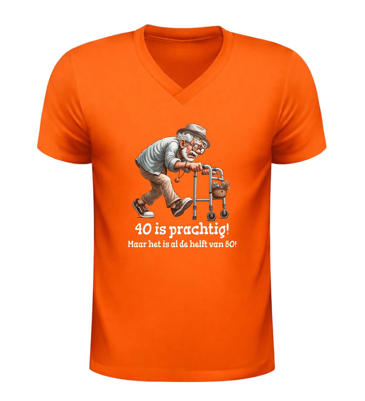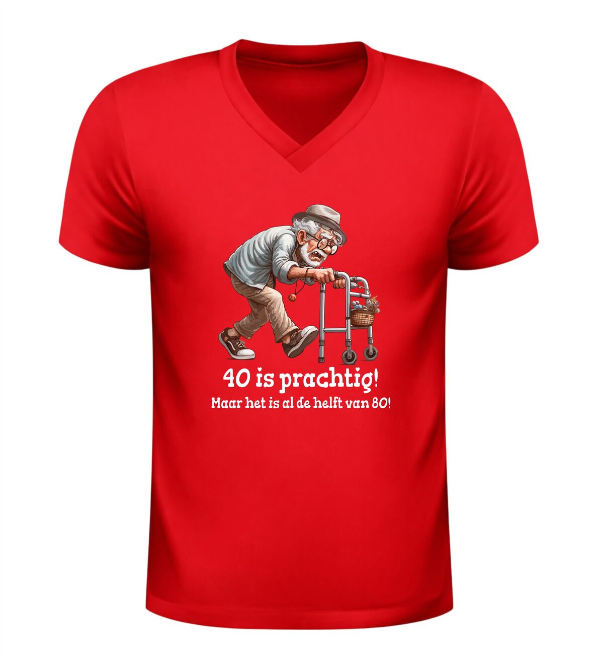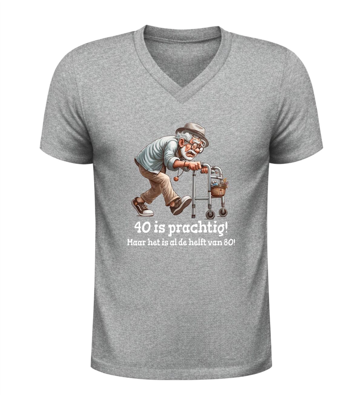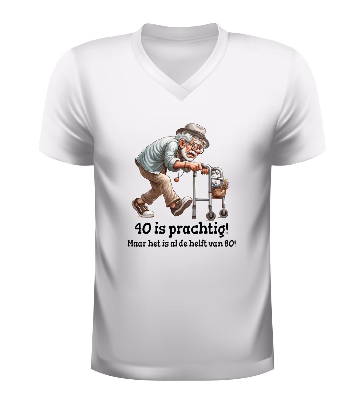 Dit heren v-hals shirt met de tekst veertig is prachtig, maar het is alweer de helft van tachtig en de grappige afbeelding van een oude man met rollator is het perfecte verjaardag shirt voor een 40e verjaardag met humor. De speelse opdruk zorgt direct voor lachende gezichten en maakt dit shirt ideaal om te dragen tijdens een verjaardagsfeest, borrel of gezellig etentje. Dankzij de comfortabele V-hals en prettige pasvorm draag je dit verjaardag shirt moeiteloos de hele dag, terwijl de ludieke print laat zien dat ouder worden ook met een flinke dosis zelfspot kan. Dit heren verjaardag shirt is bovendien een origineel cadeau voor mannen die veertig worden en wel houden van een grapje. Met dit 40 jaar V-hals verjaardag shirt combineer je comfort, humor en een feestelijk moment in één opvallend kledingstuk.