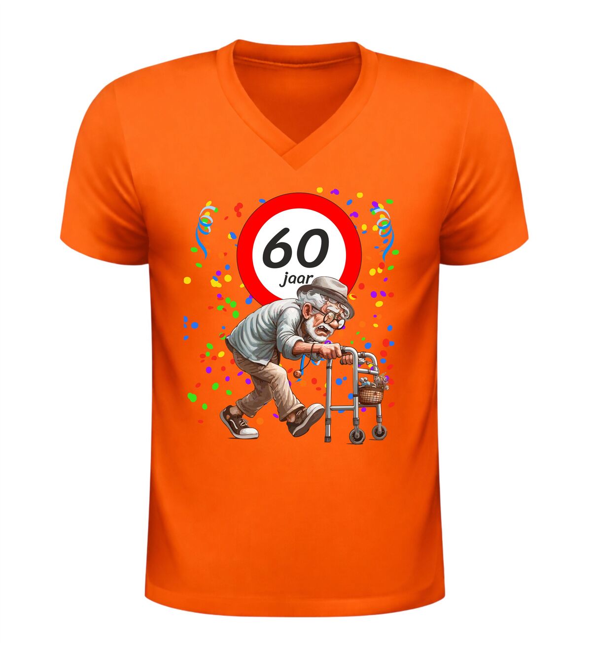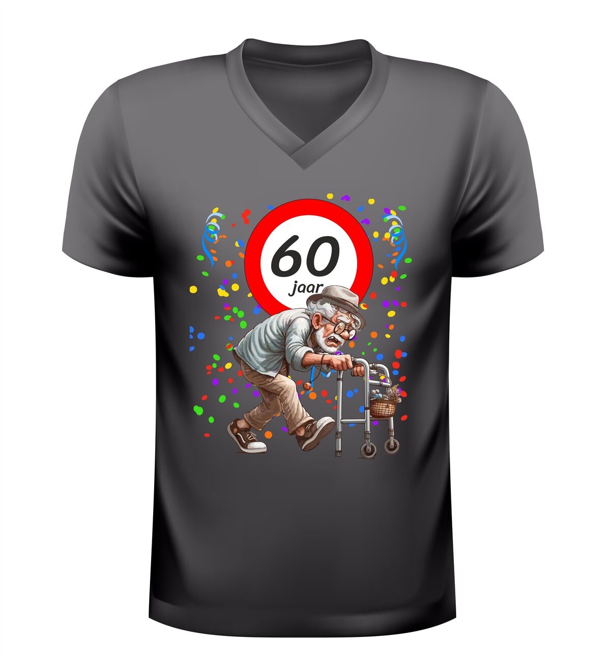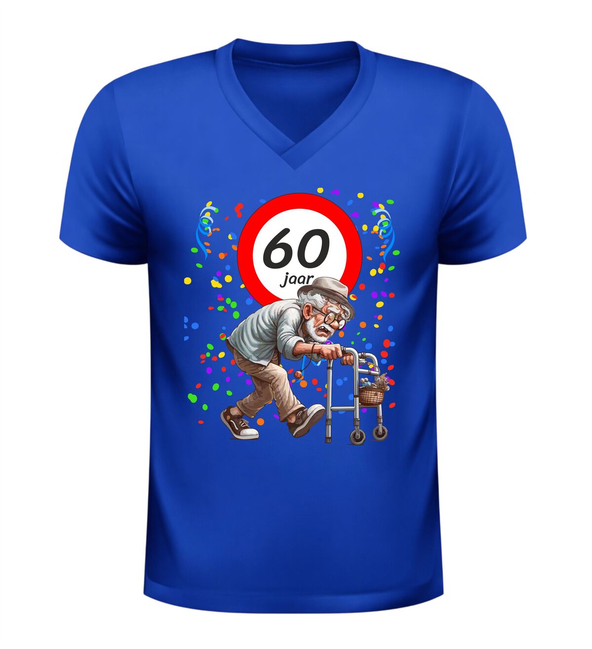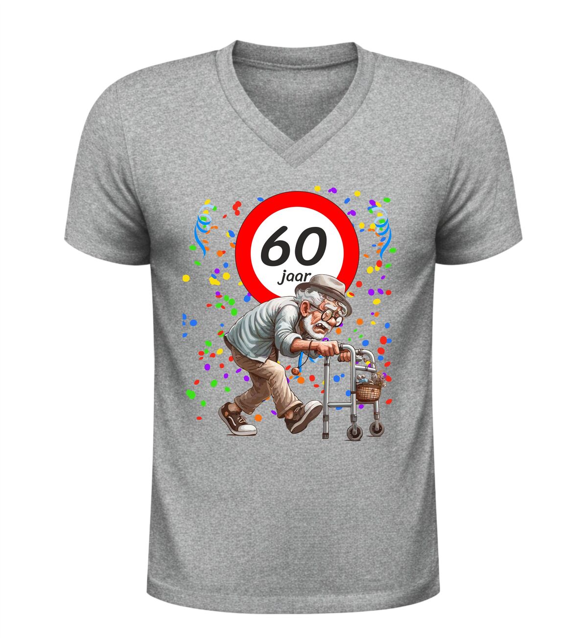 Dit heren V-hals t-shirt met de tekst 60 jaar is het ultieme feestelijke verjaardag shirt voor mannen die hun zestigste verjaardag met humor willen vieren. De full colour print met een hilarische afbeelding van een oud opaatje achter een rollator, compleet in feestelijke stijl, zorgt gegarandeerd voor lachende gezichten op elk verjaardagsfeest. Dit grappige 60 jaar verjaardagsshirt voor heren combineert een moderne V-hals met een comfortabel draaggevoel, waardoor het niet alleen leuk is om te zien maar ook fijn is om de hele dag te dragen. Of het nu wordt gedragen tijdens een verjaardagsfeest, jubileum of als verrassing bij binnenkomst, dit V-hals shirt maakt de jarige direct het stralende middelpunt.