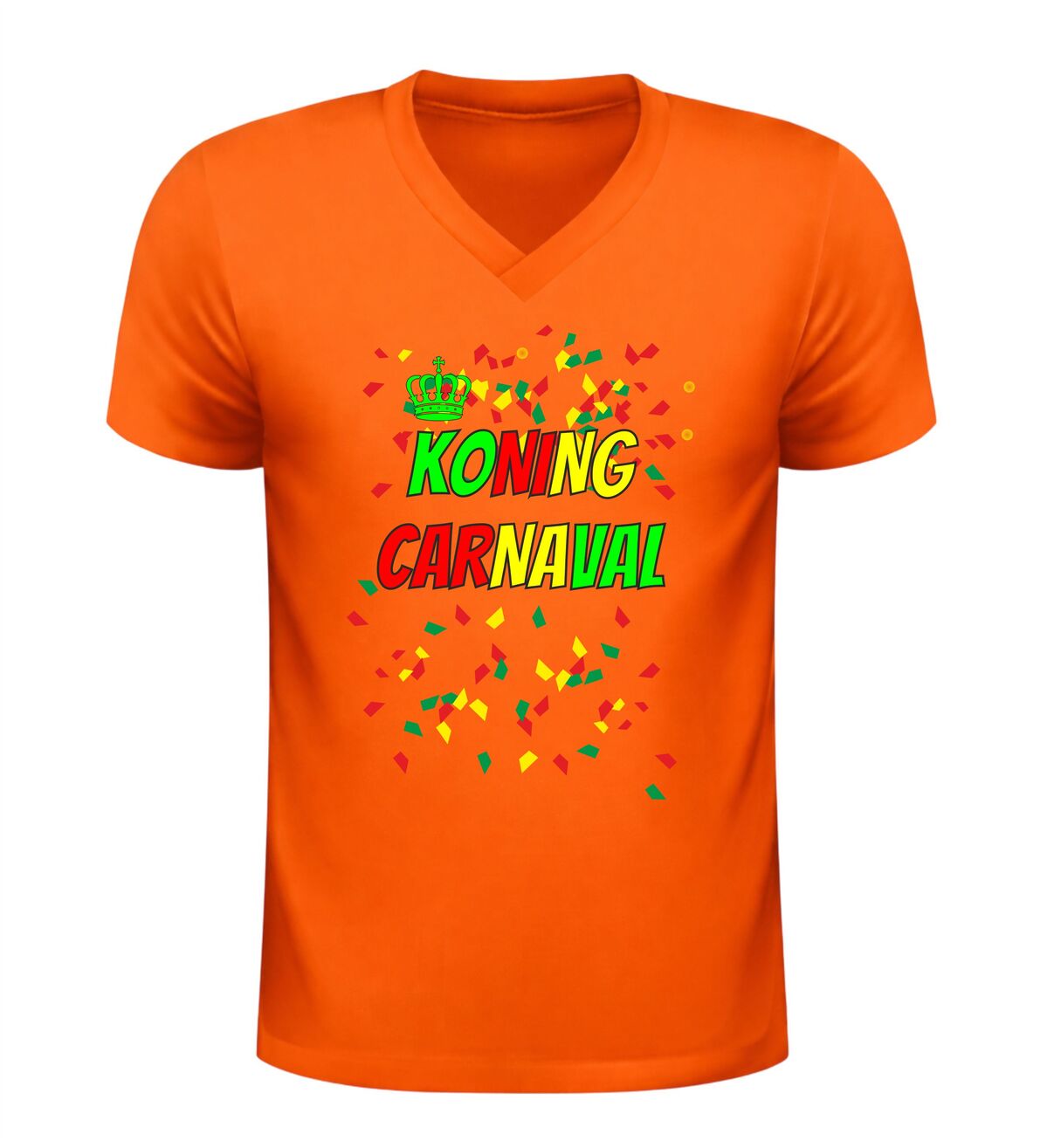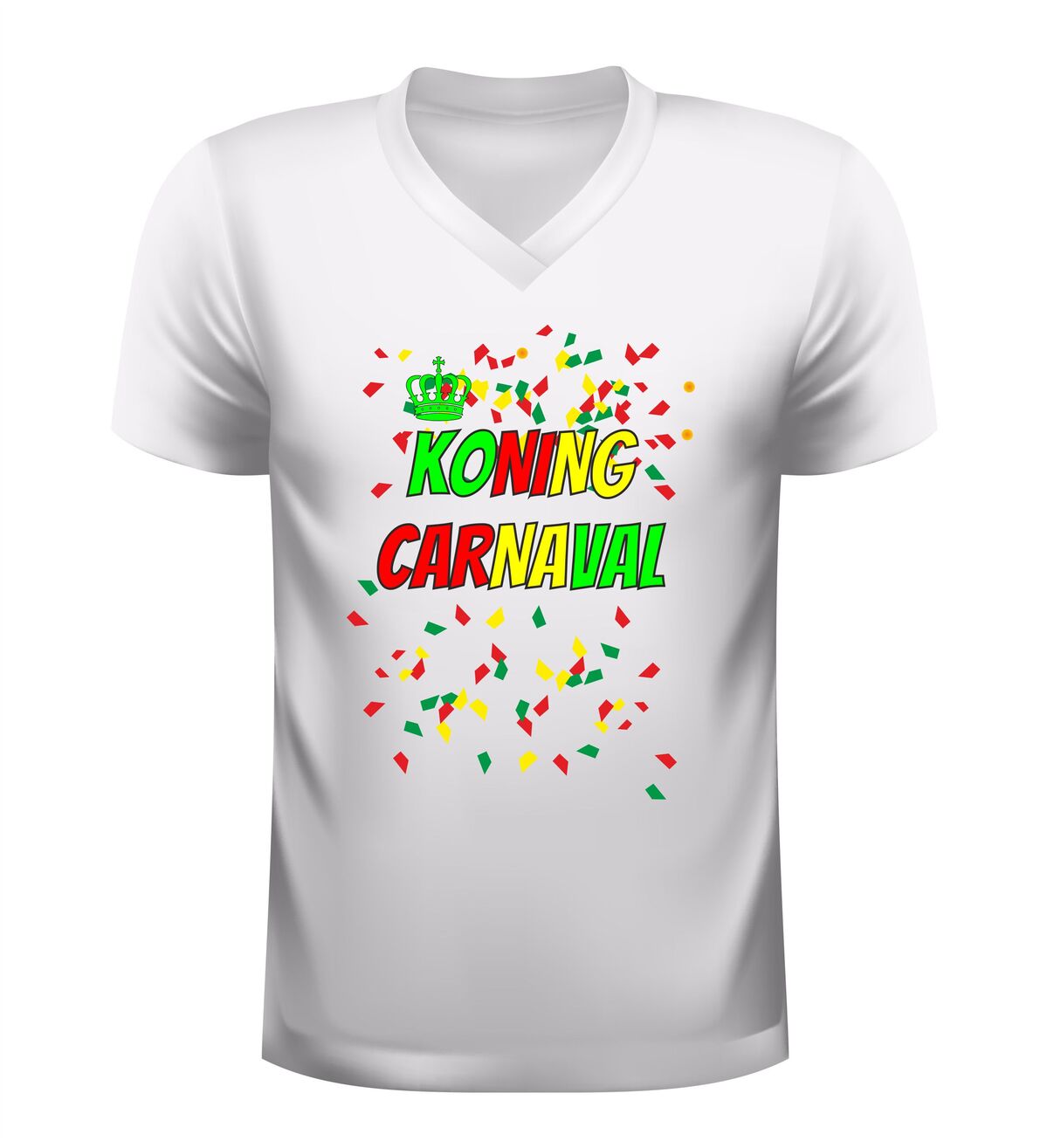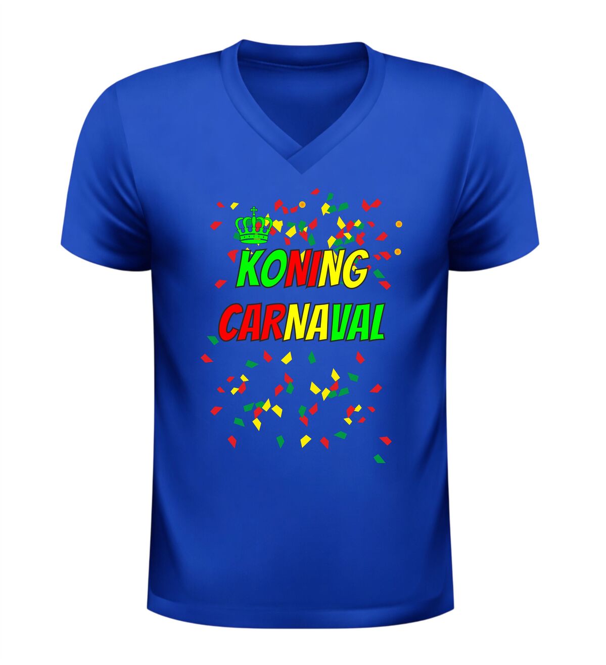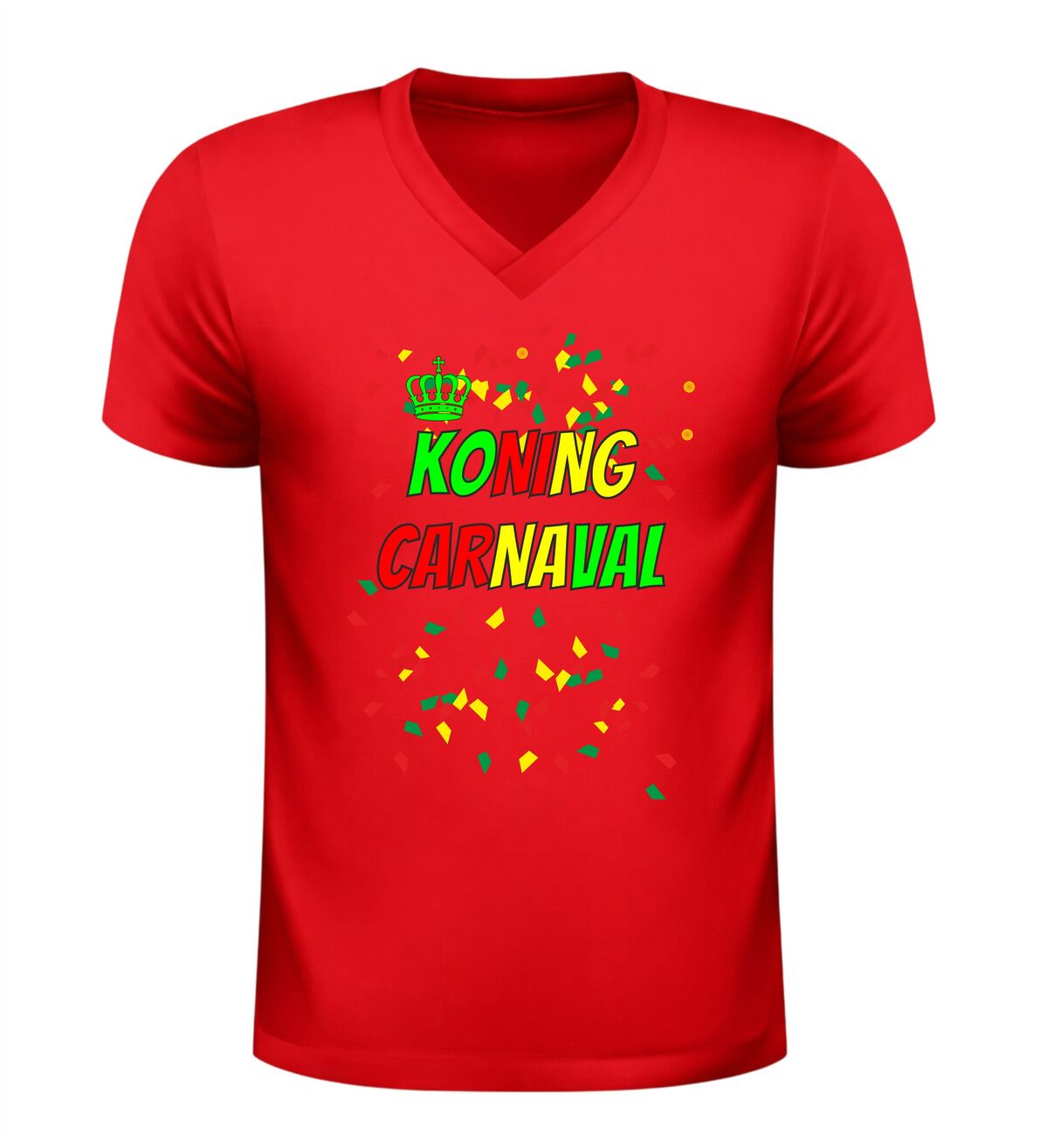 Dit heren V-hals shirt met de tekst Koning Carnaval is dé perfecte keuze voor iedereen die carnaval viert met trots, kleur en uitstraling. Tijdens carnaval draait alles om gezien worden, plezier maken en laten zien dat jij carnaval ademt, en dat is precies wat dit carnaval shirt uitstraalt. Of je nu carnaval viert in de stad, in de kroeg, tijdens een optocht of op een groot carnaval festival, met dit shirt ben jij helemaal klaar voor carnaval. De combinatie van rood, groen en geel confetti geeft dit carnaval shirt een echte feestelijke carnaval uitstraling die direct past bij de sfeer van carnaval.