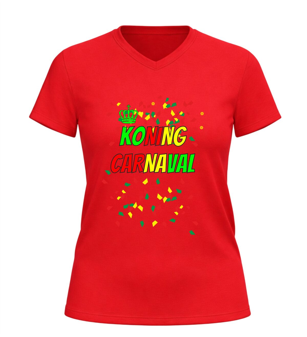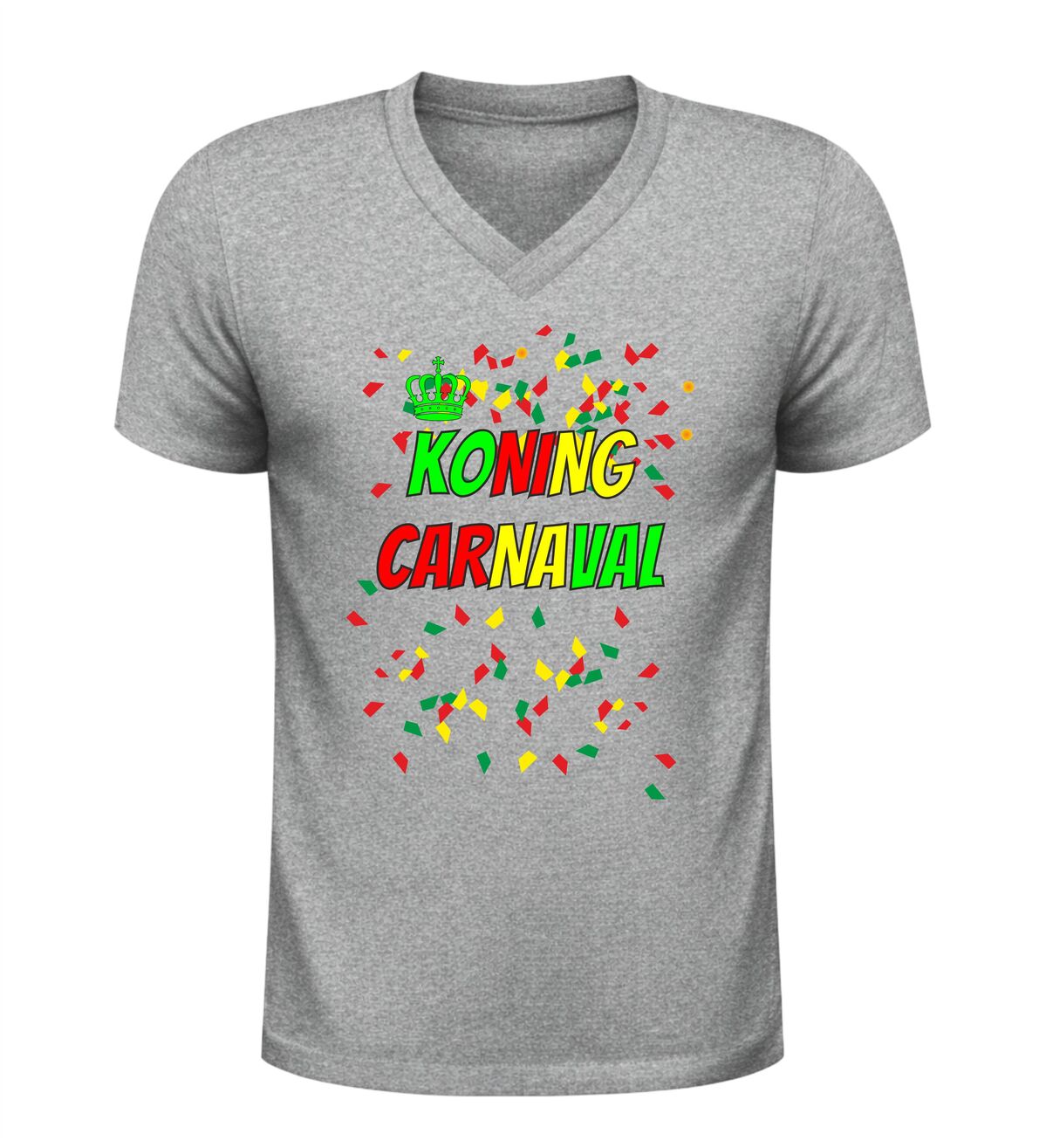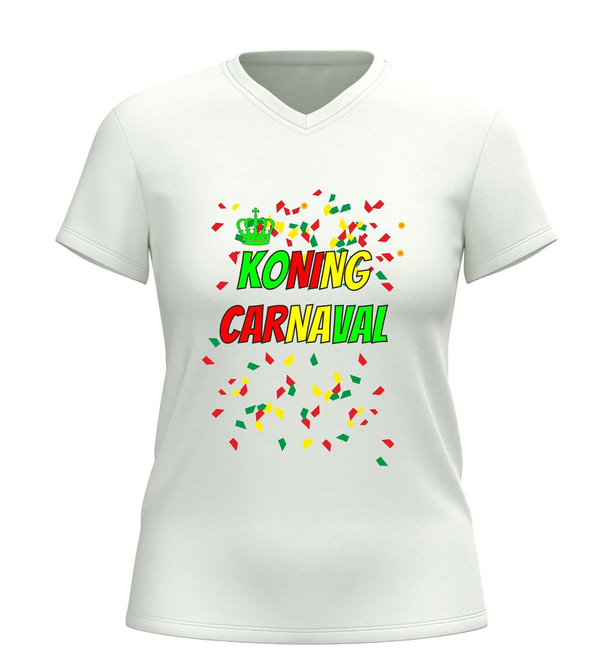 Dit heren V-hals shirt met de tekst Koning Carnaval is dé perfecte keuze voor iedereen die carnaval viert met trots, kleur en uitstraling. Tijdens carnaval draait alles om gezien worden, plezier maken en laten zien dat jij carnaval ademt, en dat is precies wat dit carnaval shirt uitstraalt. Of je nu carnaval viert in de stad, in de kroeg, tijdens een optocht of op een groot carnaval festival, met dit shirt ben jij helemaal klaar voor carnaval. De combinatie van rood, groen en geel confetti geeft dit carnaval shirt een echte feestelijke carnaval uitstraling die direct past bij de sfeer van carnaval.