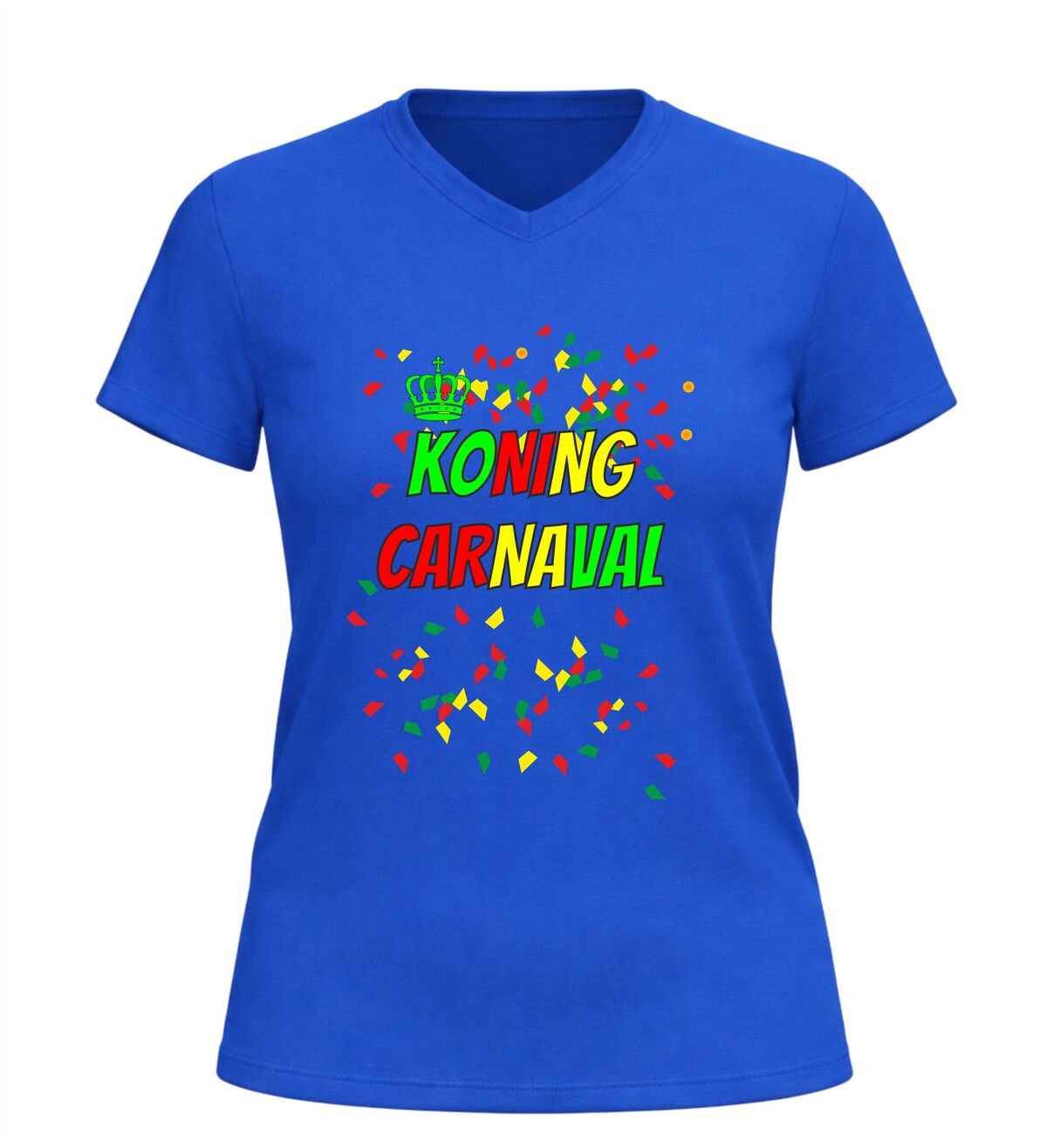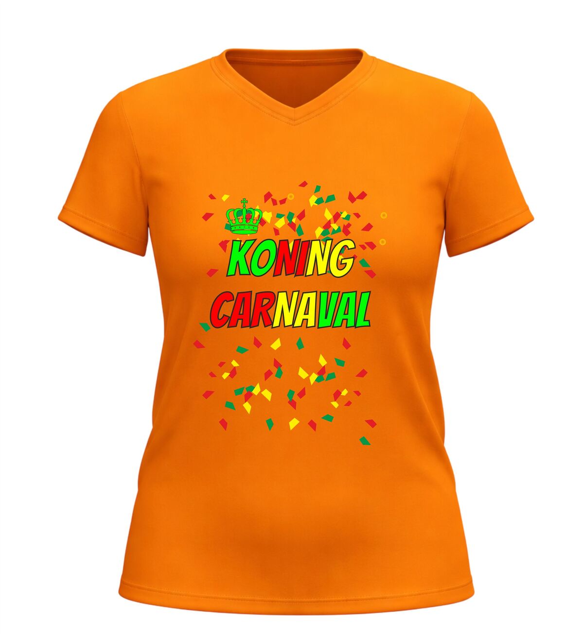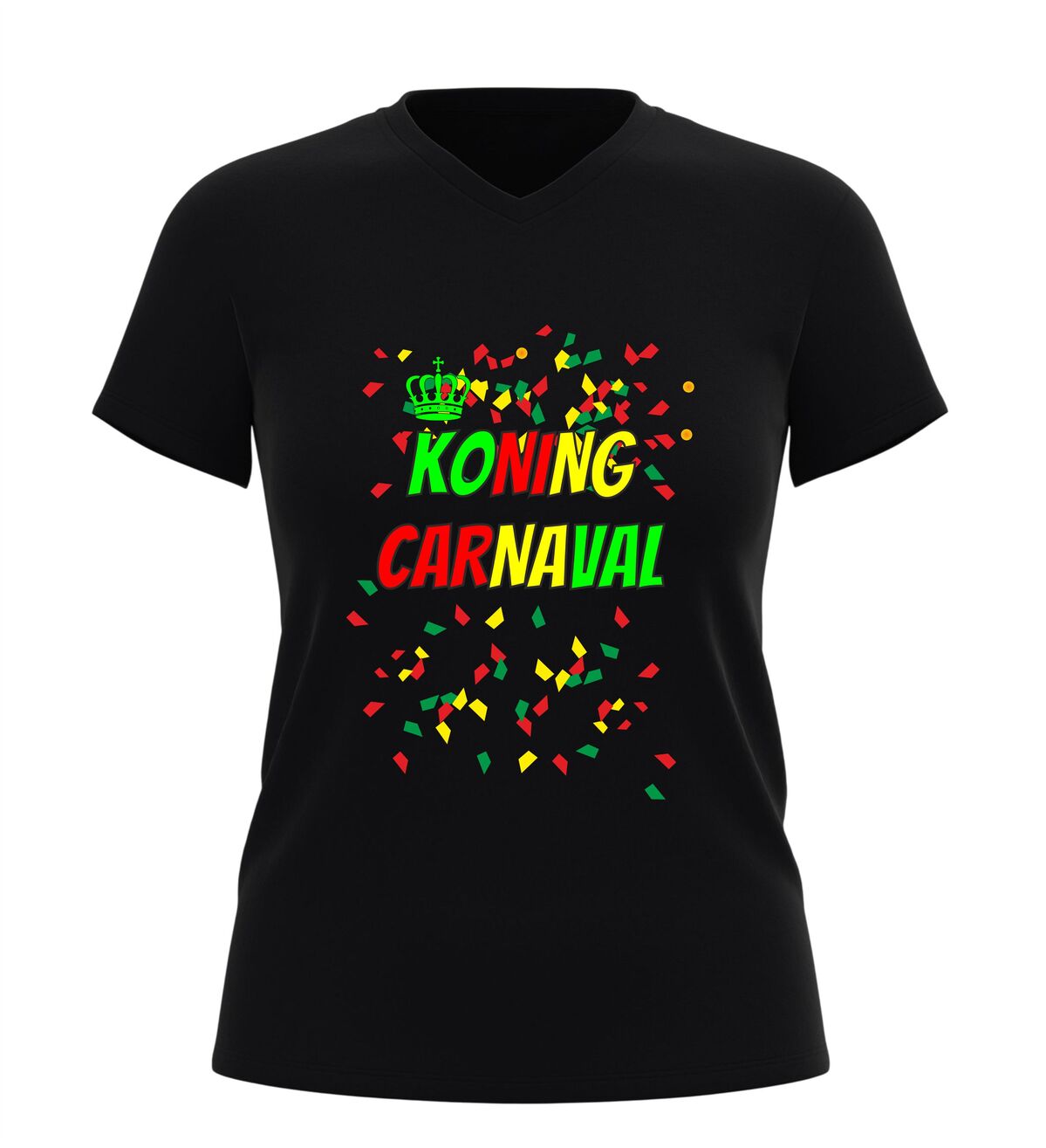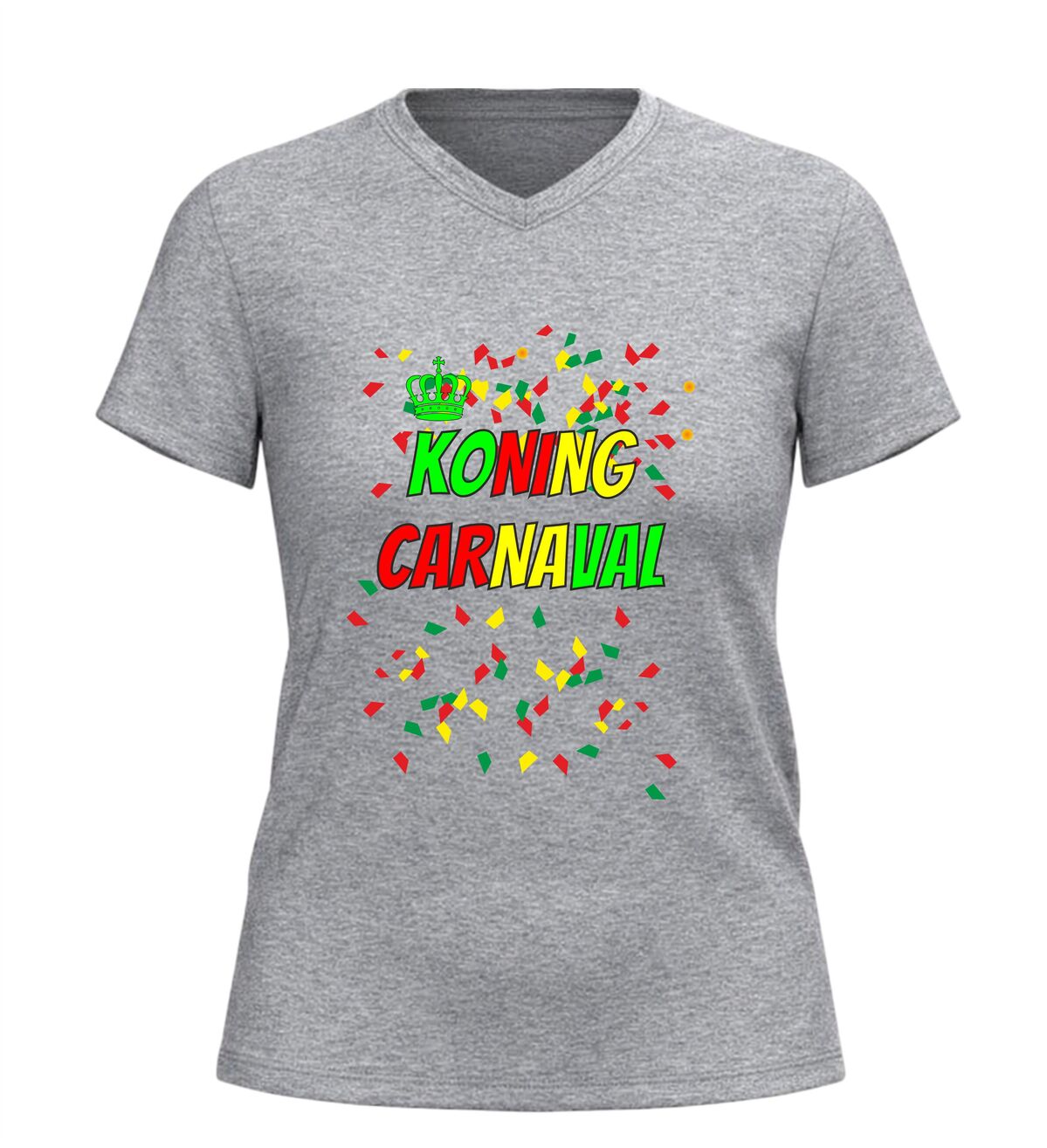 Dit heren V-hals shirt met de tekst Koning Carnaval is dé perfecte keuze voor iedereen die carnaval viert met trots, kleur en uitstraling. Tijdens carnaval draait alles om gezien worden, plezier maken en laten zien dat jij carnaval ademt, en dat is precies wat dit carnaval shirt uitstraalt. Of je nu carnaval viert in de stad, in de kroeg, tijdens een optocht of op een groot carnaval festival, met dit shirt ben jij helemaal klaar voor carnaval. De combinatie van rood, groen en geel confetti geeft dit carnaval shirt een echte feestelijke carnaval uitstraling die direct past bij de sfeer van carnaval.