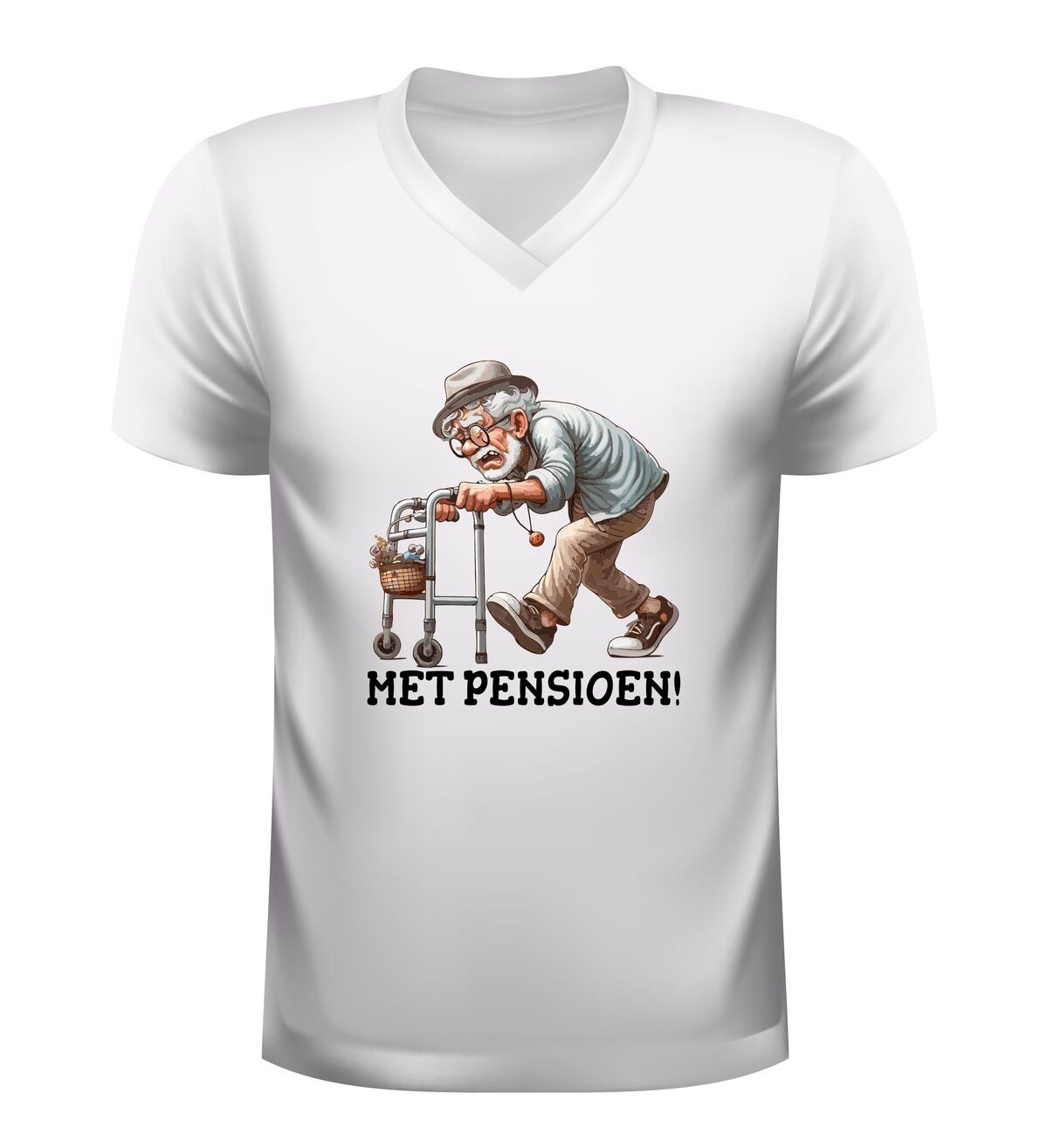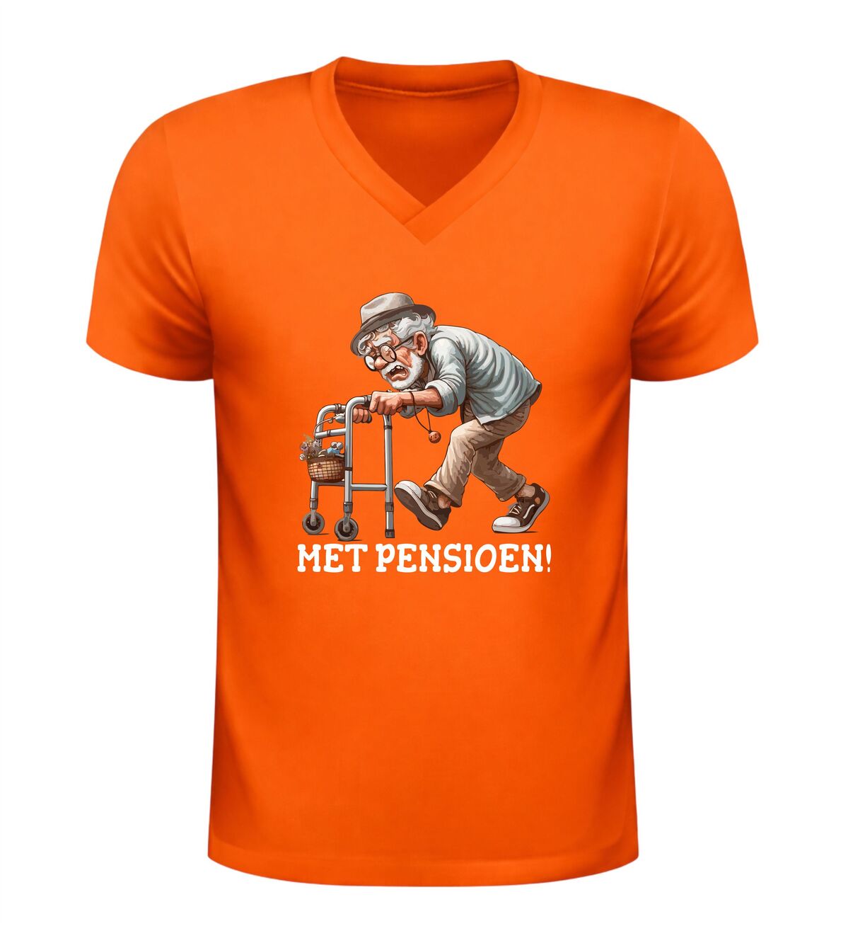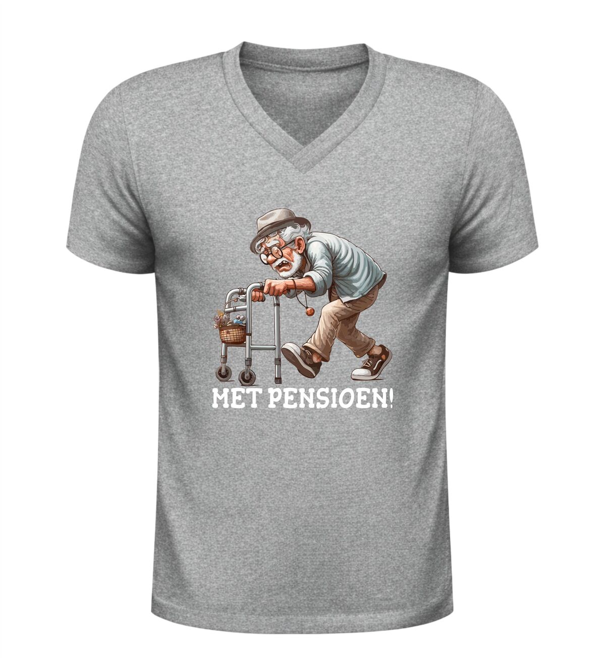 Dit heren v-hals t-shirt met de tekst met pensioen is een feestelijk en hilarisch kledingstuk om het begin van een nieuwe levensfase te vieren. De grappige afbeelding van een oude man achter een rollator geeft het shirt een speelse knipoog en maakt het perfect voor een pensioenfeest of afscheidsmoment op het werk. Dit humoristische pensioen shirt voor heren zorgt gegarandeerd voor lachende reacties en zet de gepensioneerde meteen in het middelpunt van de aandacht. Dankzij de moderne V-hals en comfortabele pasvorm is dit T-shirt niet alleen leuk om te dragen tijdens het feest, maar ook daarna als vrolijke herinnering.