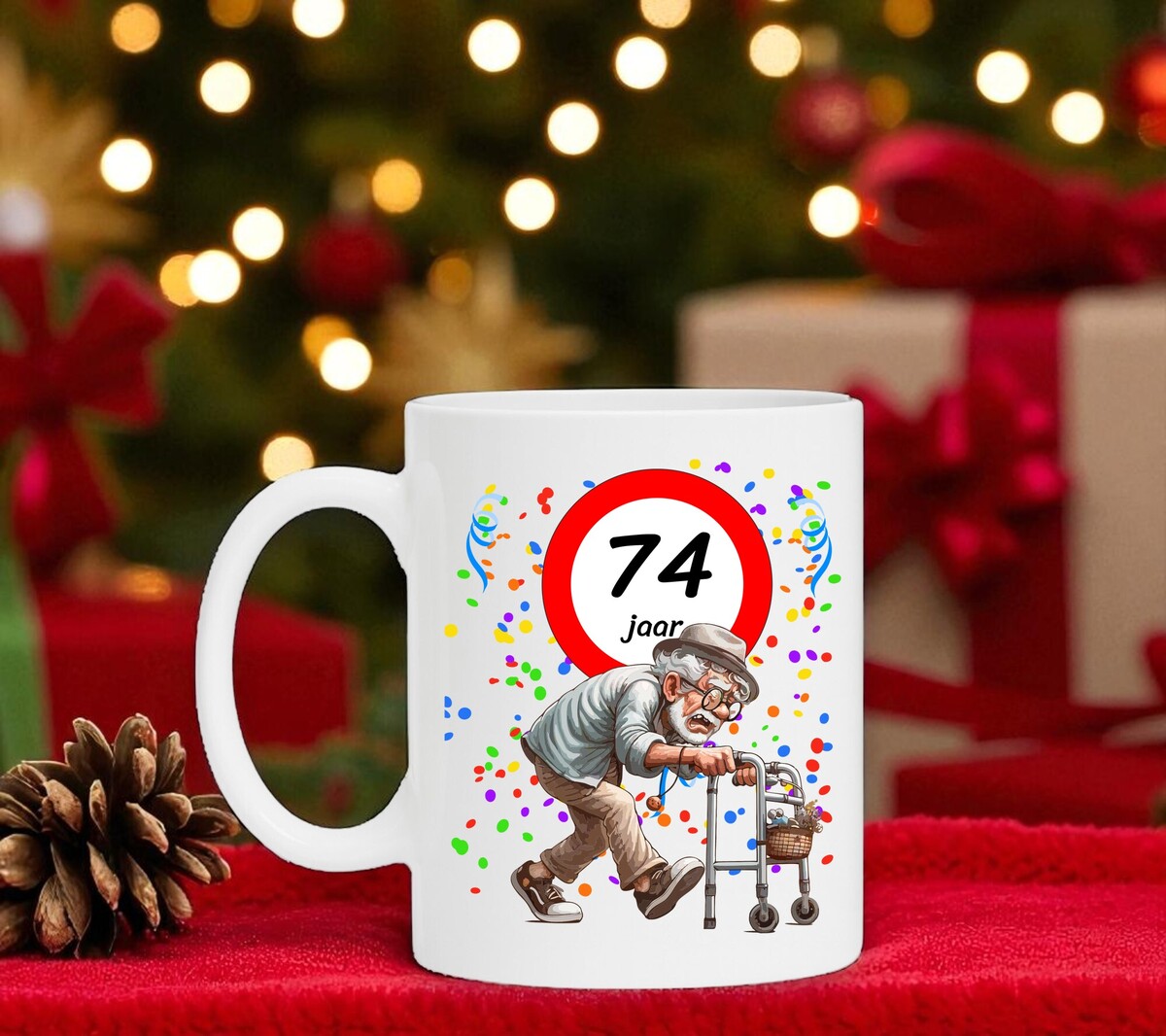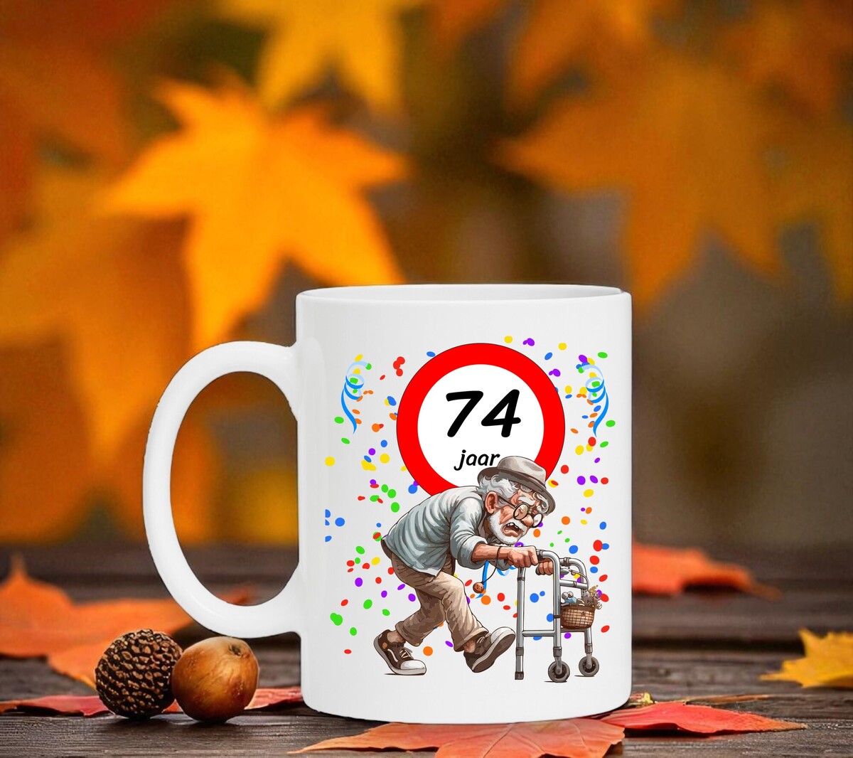 Maak de verjaardag van een 74-jarige man extra speciaal met deze unieke mok, ontworpen voor mannen met een gezonde dosis humor! Perfect voor opa’s, vaders, of vrienden die hun leeftijd met een knipoog vieren. Deze mok heeft een vrolijke, humoristische afbeelding van een grappige opa met een rollator – een hilarisch cadeau dat elke koffiepauze zal opvrolijken.