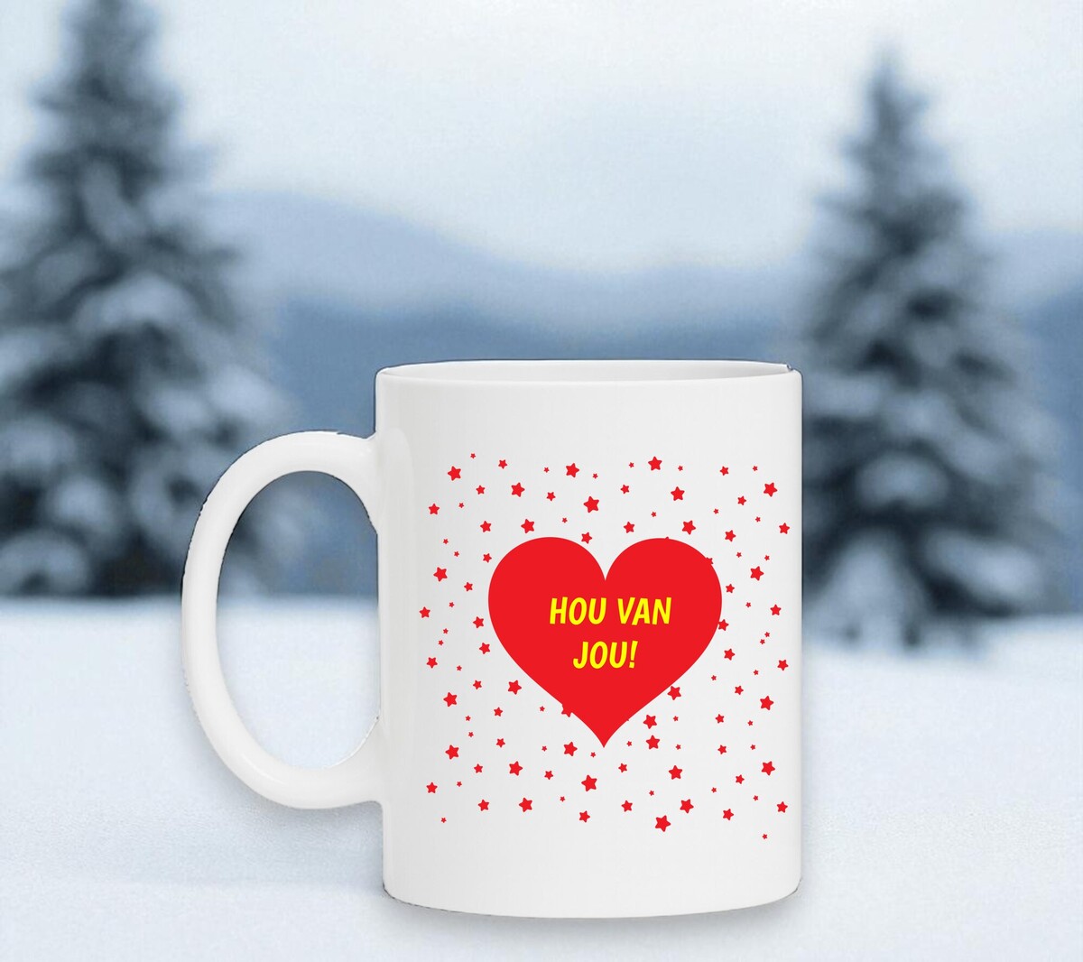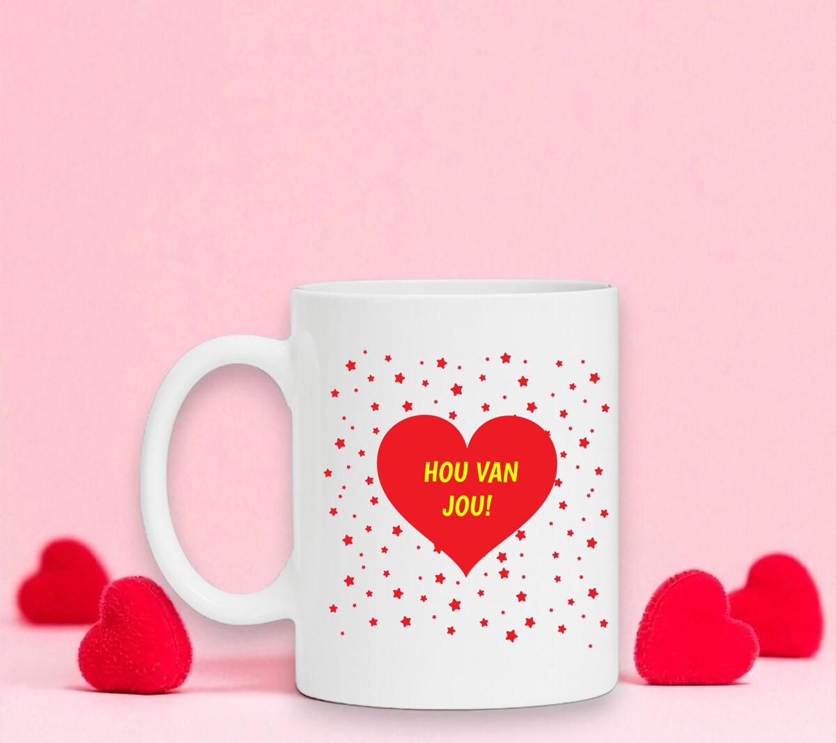Een hele lieve koffiemok vol met sterren en rode harten! In het rode hart staat de tekst ‘hou van jou!’