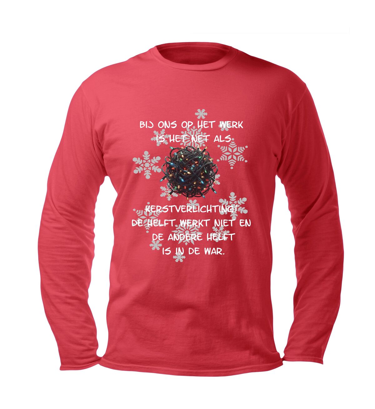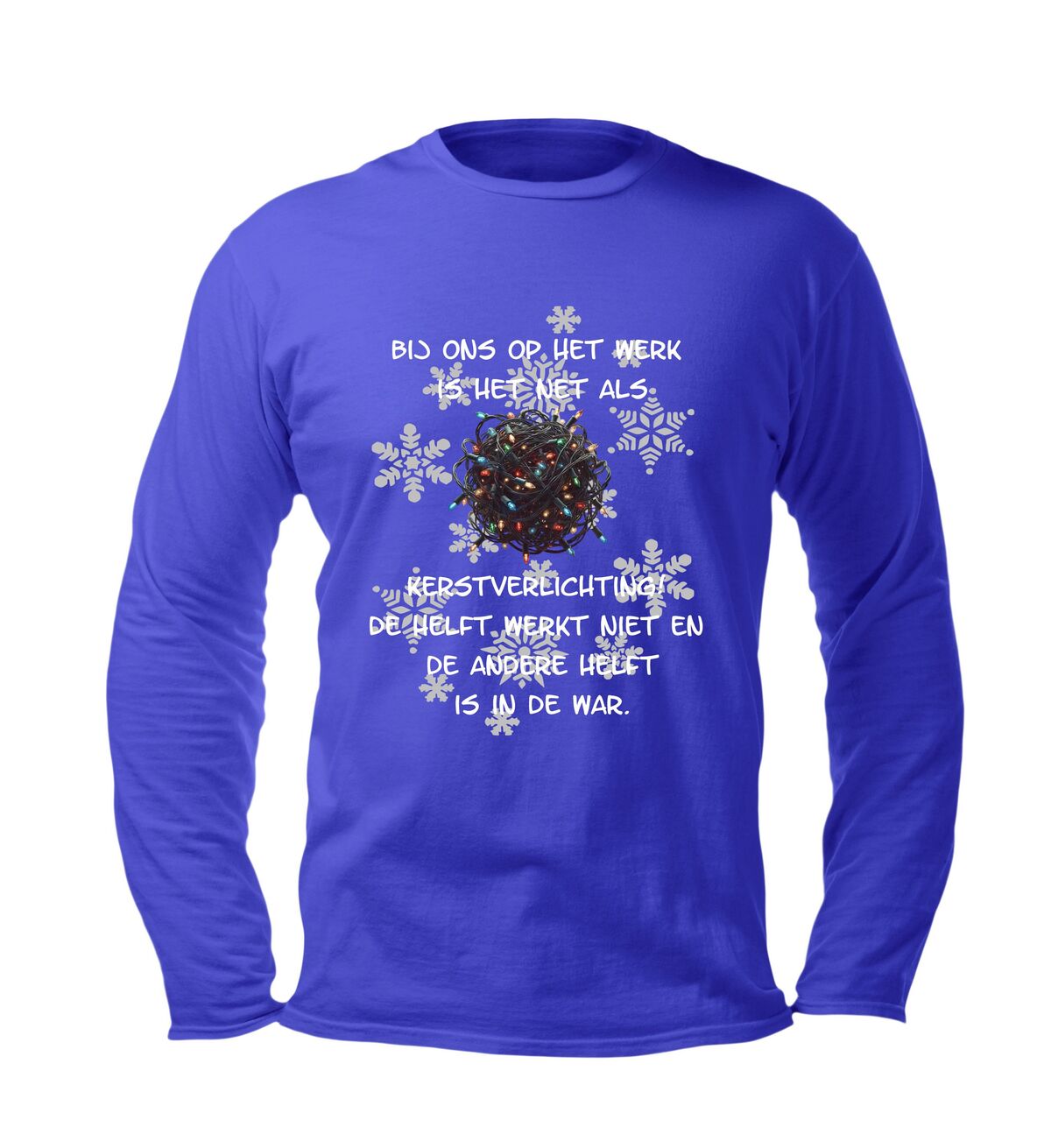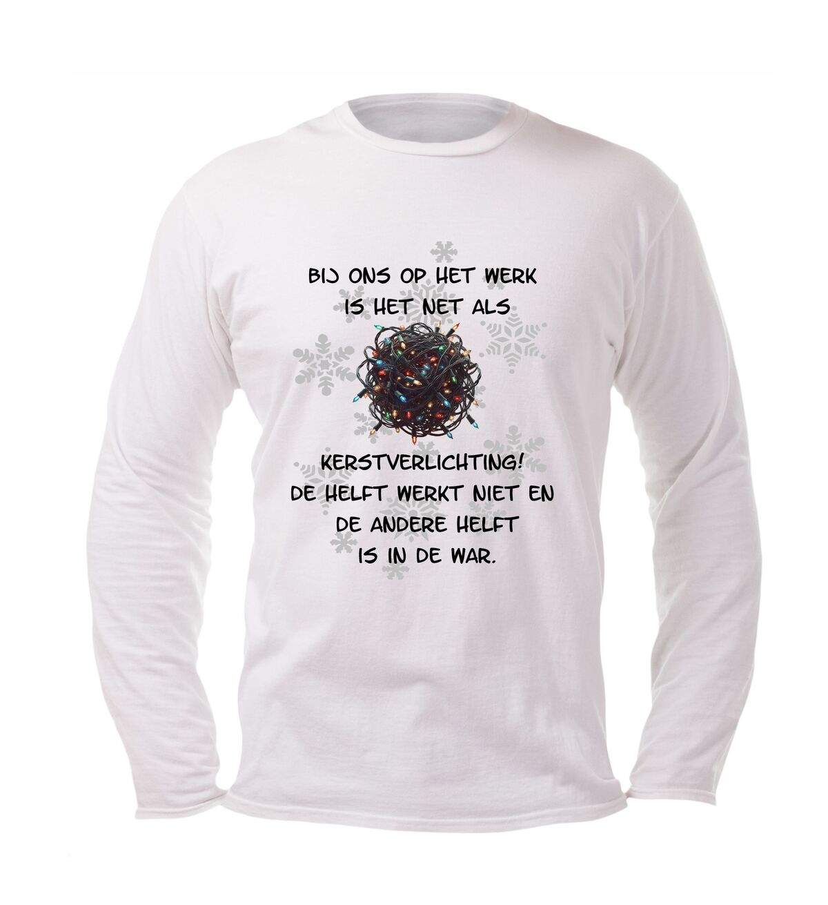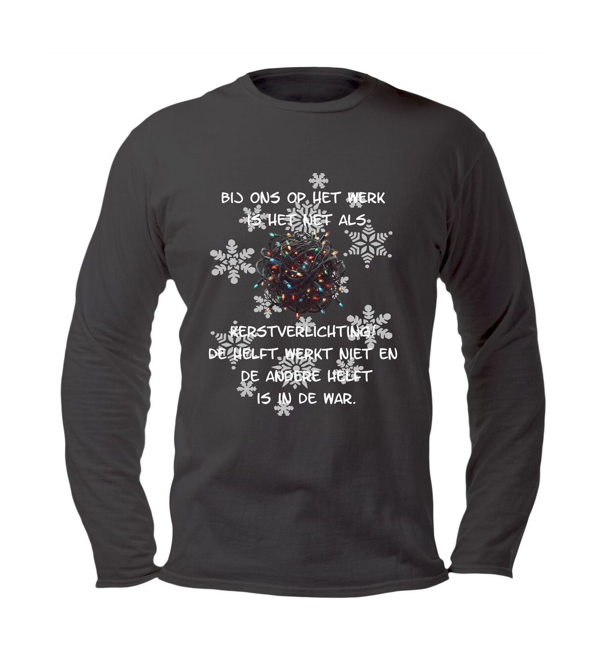 Met deze unisex longsleeve laat je op hilarische wijze zien hoe het er écht aan toe gaat op kantoor tijdens de feestdagen. De grappige tekst in combinatie met een vrolijke afbeelding van kerstlampjes maakt dit shirt het perfecte kerstcadeau voor collega’s met humor.