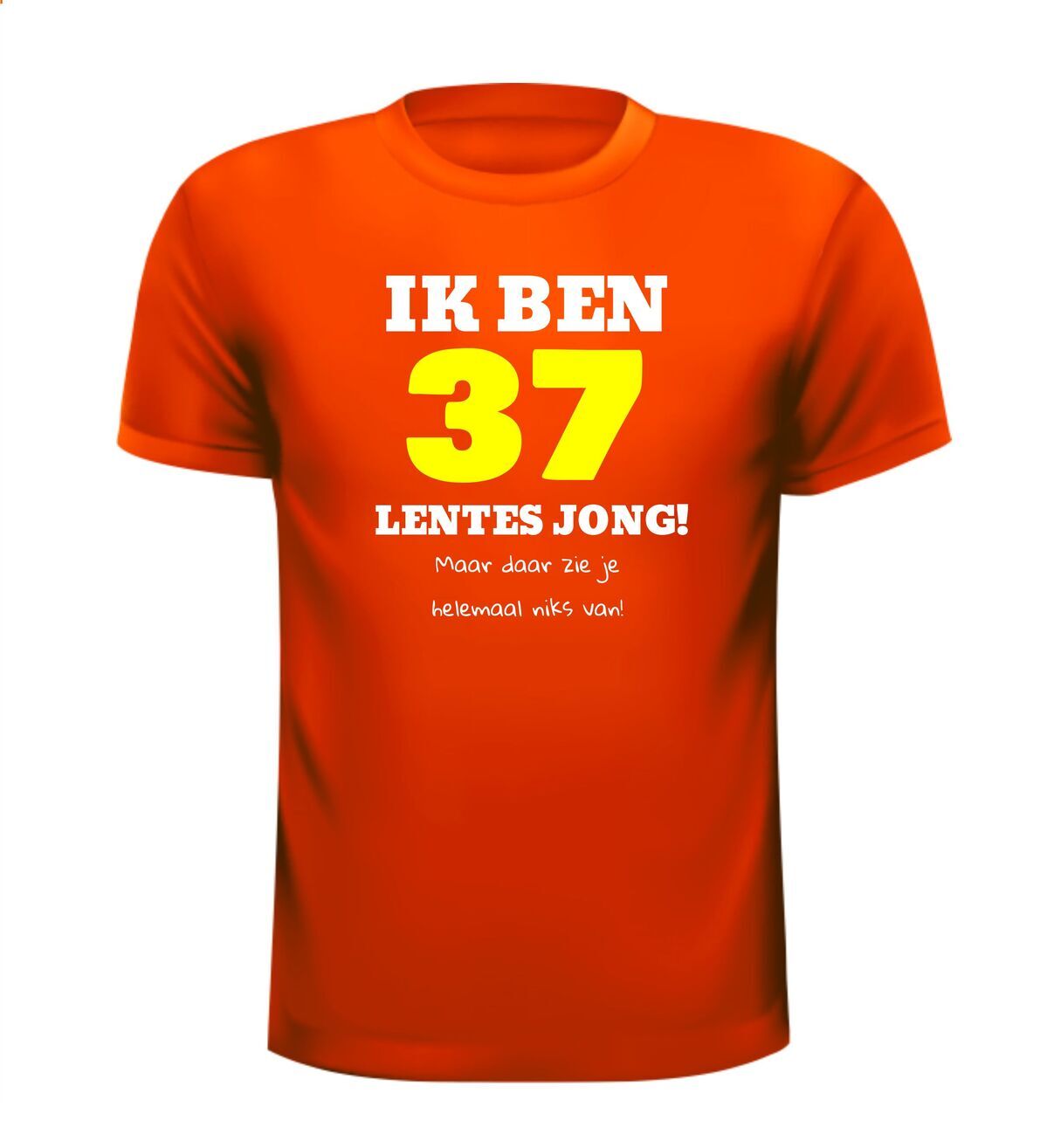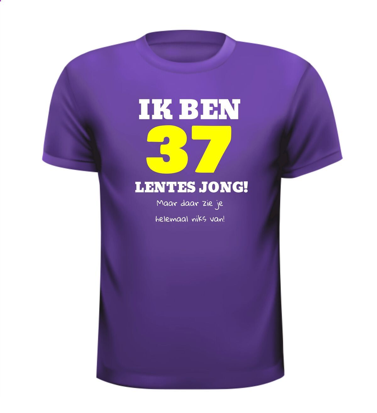 Hoe leuk is het niet om iemand een compliment te geven over hem of haar uiterlijk! Geen leuker gelegenheid is zijn of haar verjaardag. Met dit gekke verjaardags T-shirt waar de leeftijd staat uitgedrukt in lentes kan dat nu. De leeftijd uit drukken in lentes kom toch net wat liever over het doet namelijk denken aan een jonge blaadjes fris en groen aan nieuw leven. Zet de jarige die alweer 37 jaar wordt even in het zonnetje met dit gekke T-shirt wat zal hij of zij stralen als ze het T-shirt aantrekken!