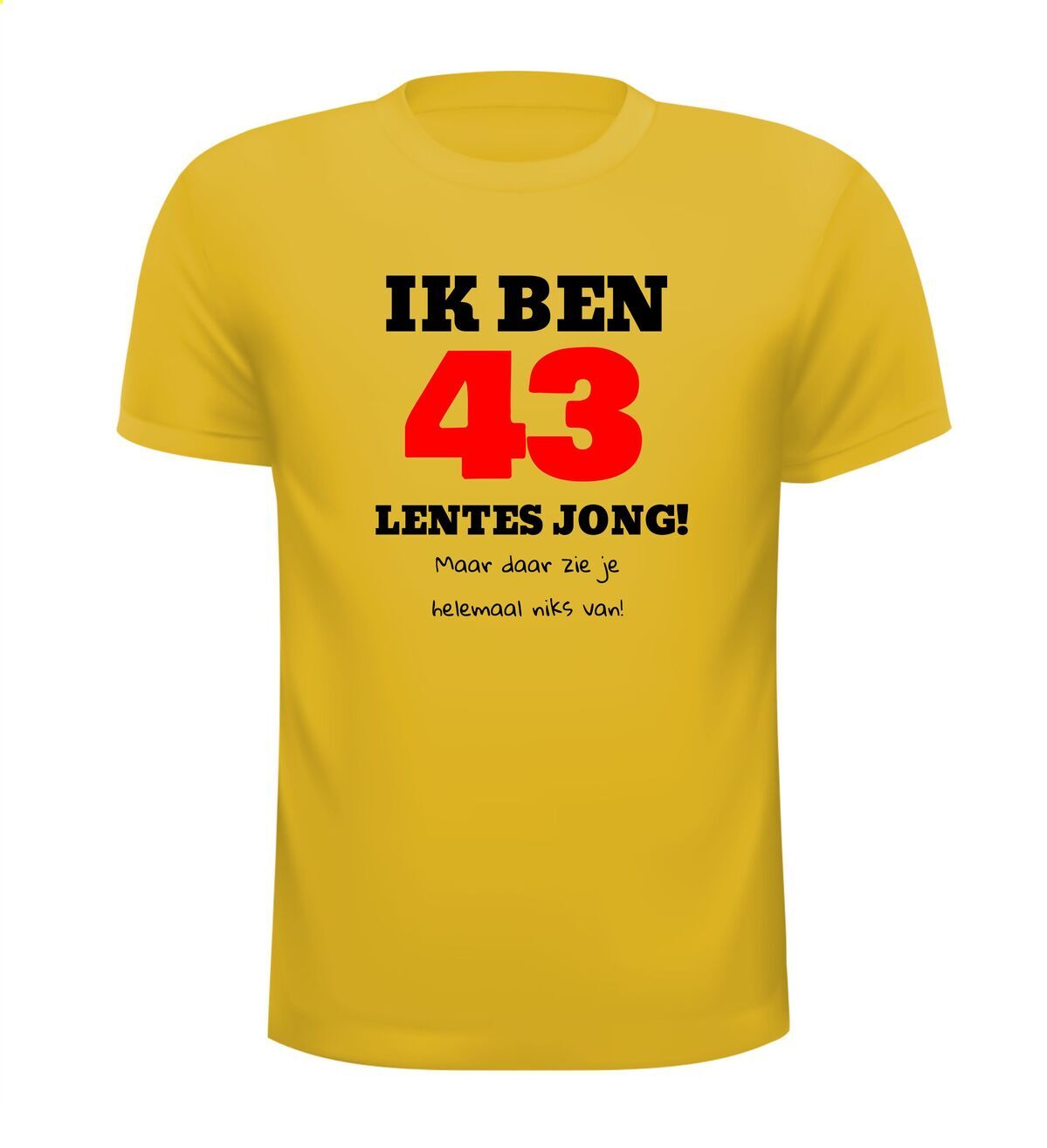 Je hebt een feestje van vriend of vriendin, collega of je echtgenote. Maar je weet echt geen leuk en origineel cadeau. Dan is dit gekke T-shirt een echte aanrader. Met dit T-shirt complimenteert je de jarige hoe goed uit er op zijn 43ste nog uit ziet. Dat wil toch iedereen wel horen en zeker op zijn verjaardag.