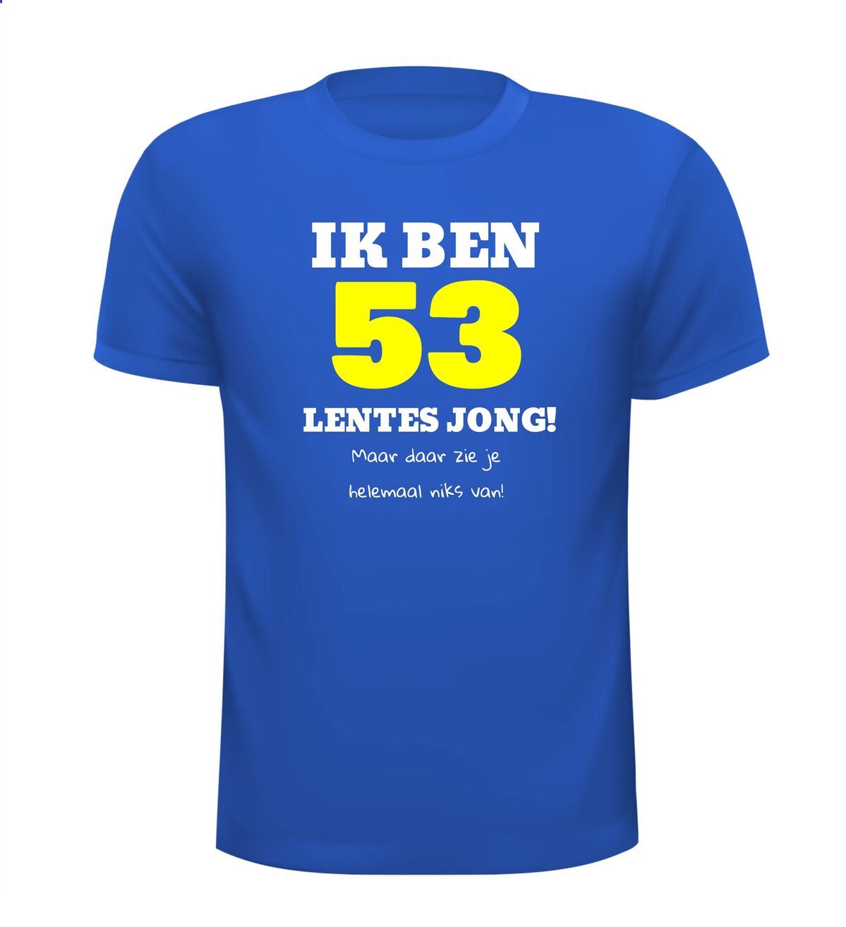 Je hebt een feestje van vriend of vriendin, collega of je echtgenote die al wat lentes meeloopt. Zo iemand heeft natuurlijk alles al en je heeft geen flauw idee wat je cadeau wilt geven. Dan is dit gekke T-shirt een echte origineel cadeau en hem of haar te complimenteren met haar 53ste verjaardag. Dit gekke T-shirt zal zeker bij de jarige in de smaak vallen.